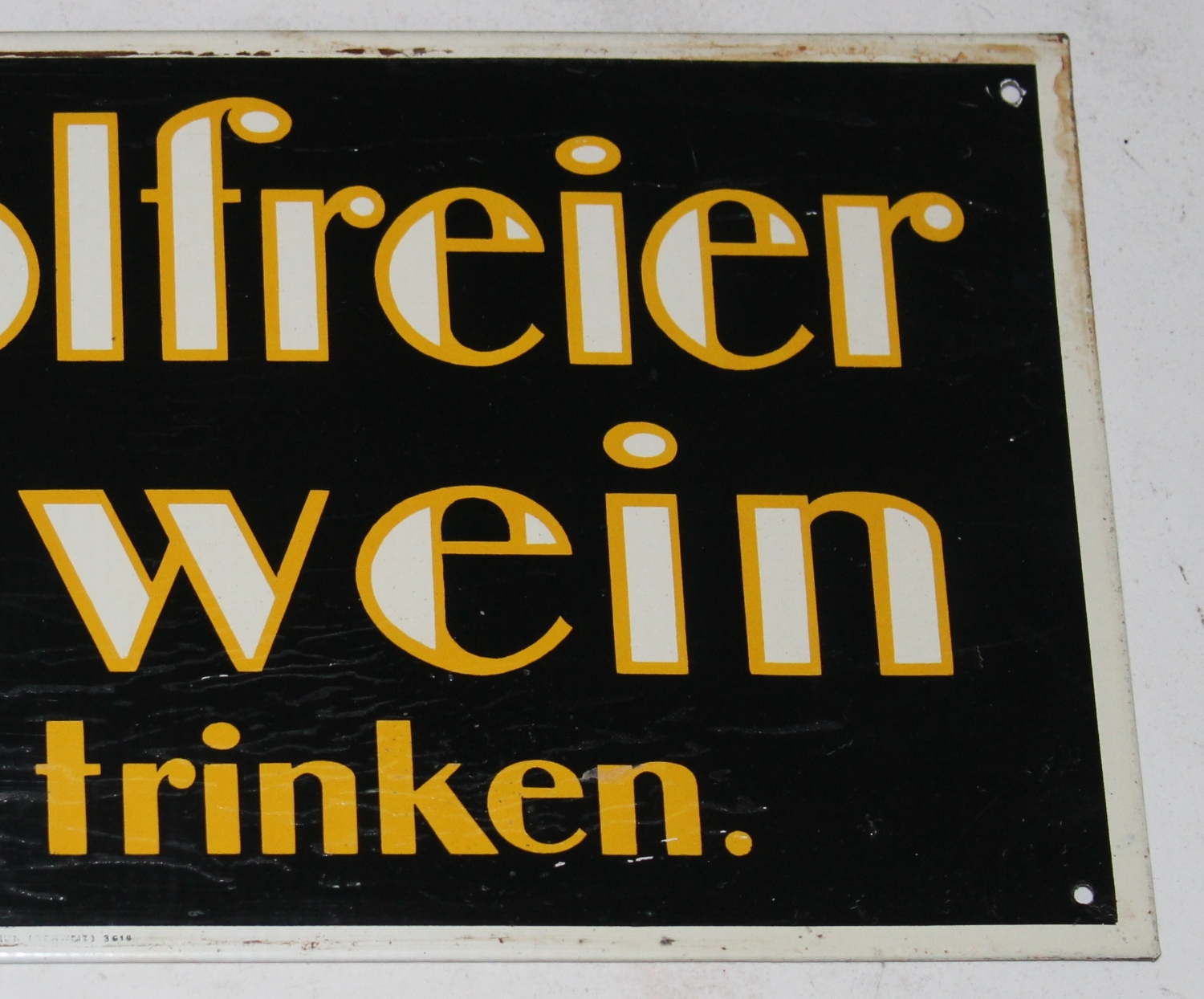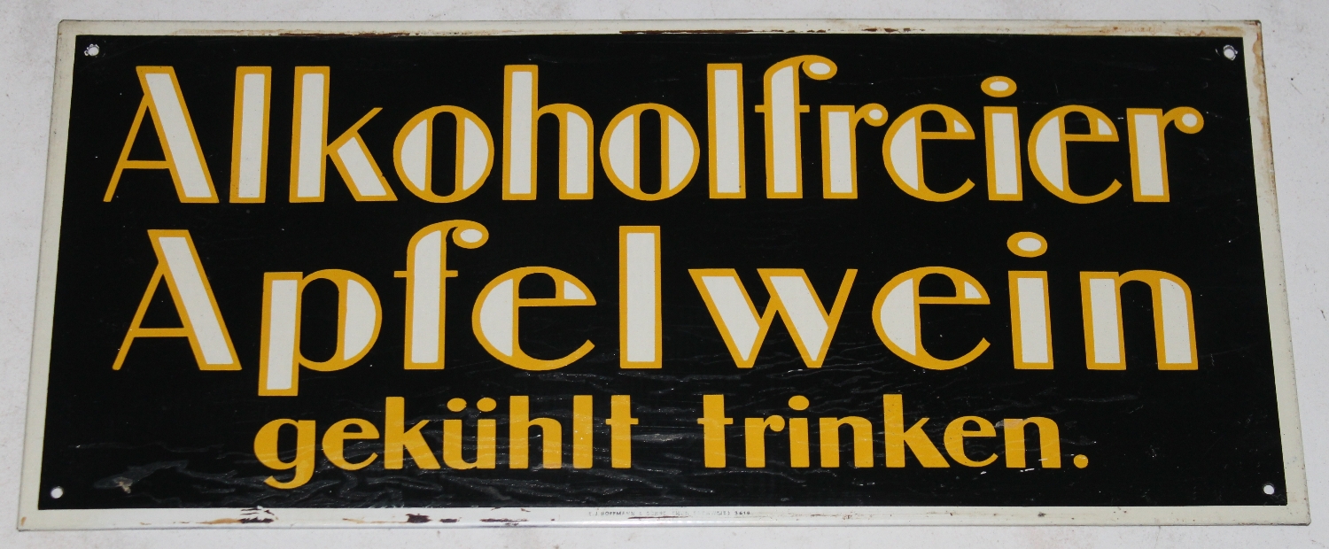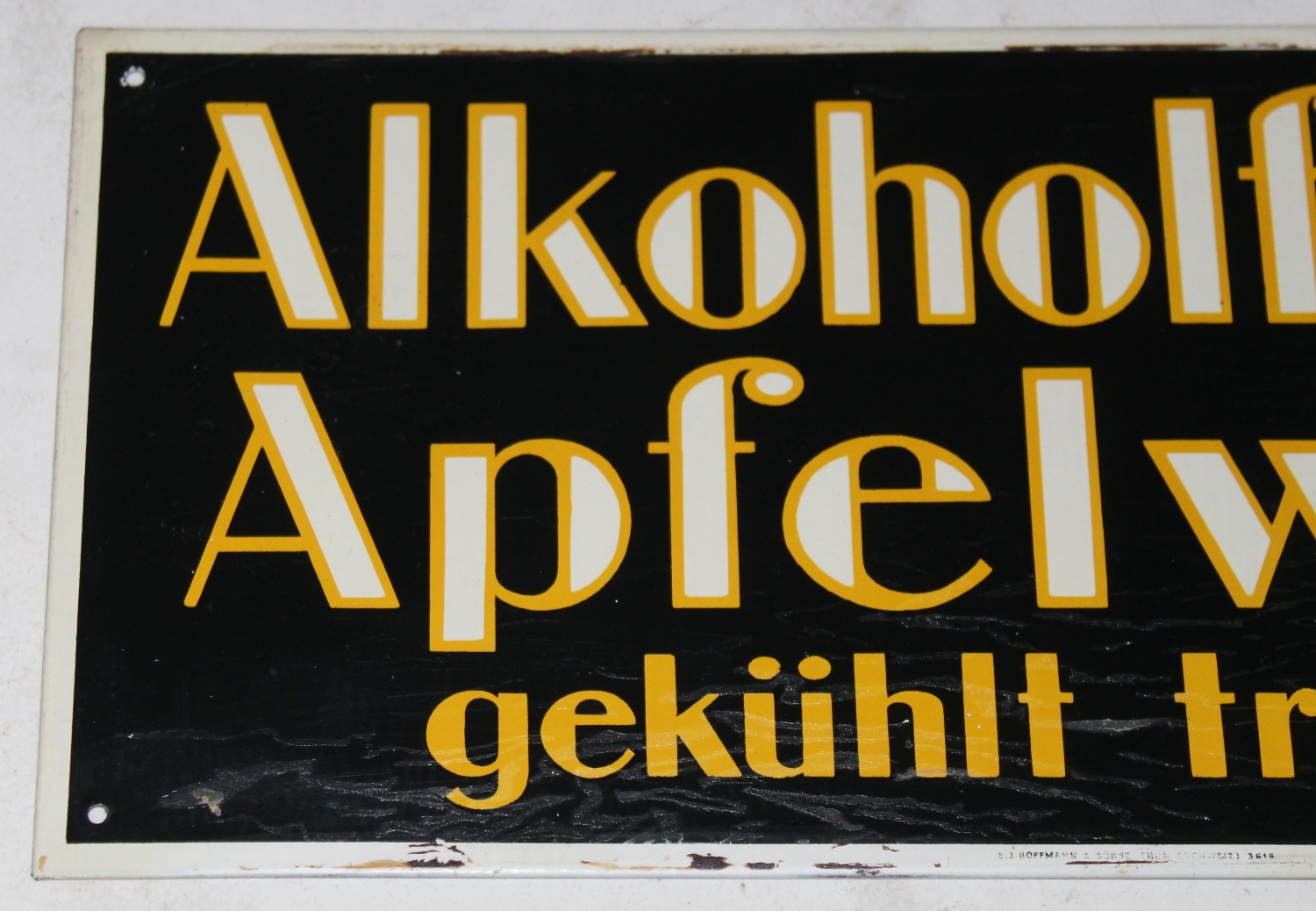 Originales „Alkoholfreier Apfelwein“ Blechschild aus den 30er oder 40er Jahren aus der Schweiz, Zustand sehr gut, minime Oberflächenkratzer, man sieht noch die Abdrücke vom Papier womit es eingepackt war, vermutlich nie gehangen, unten gemarktet mit: „E.J.HOFFMANN & SÖHNE THUN (SCHWEIZ) 3614“, Breite: 34.5cm, Höhe: 15.5cm.