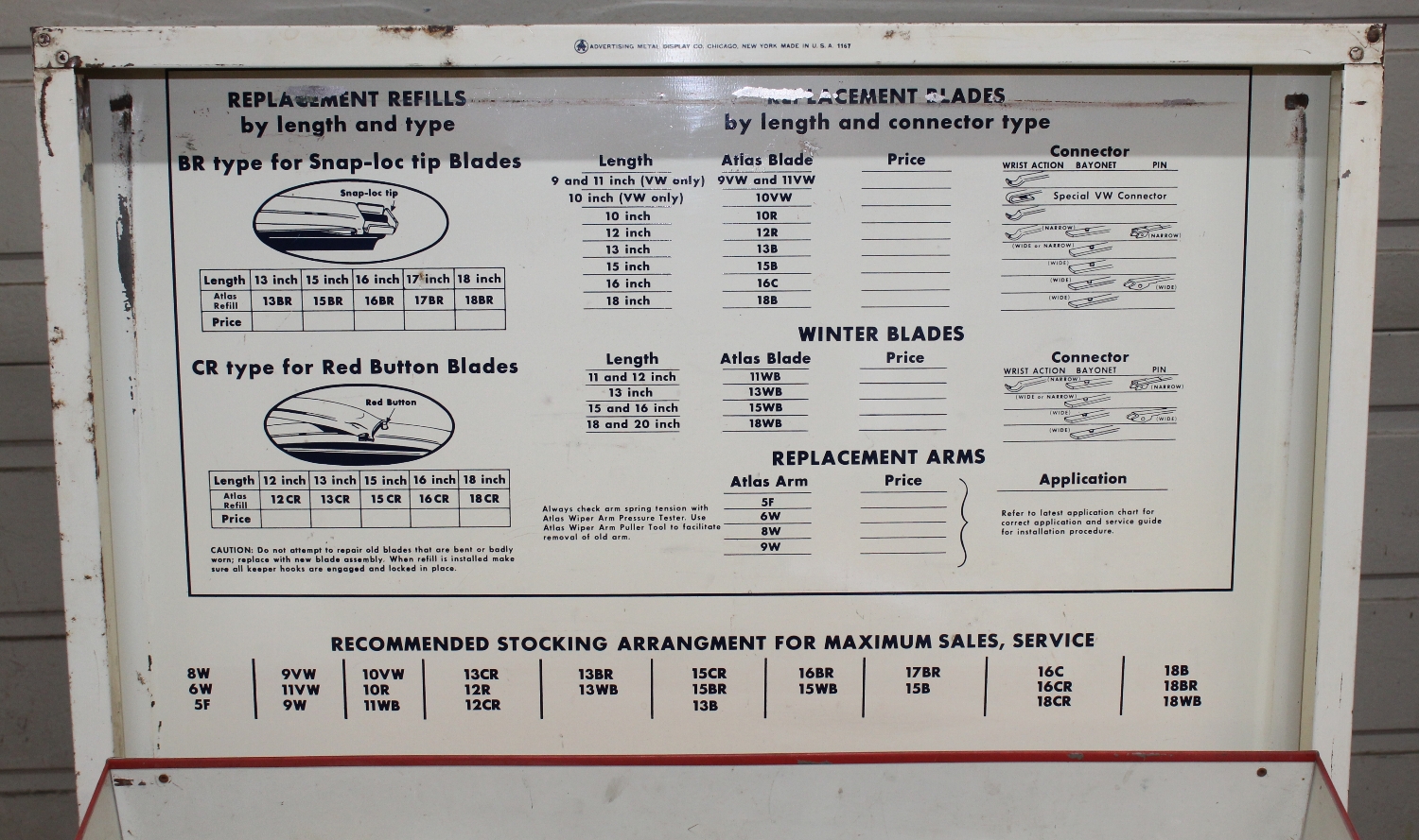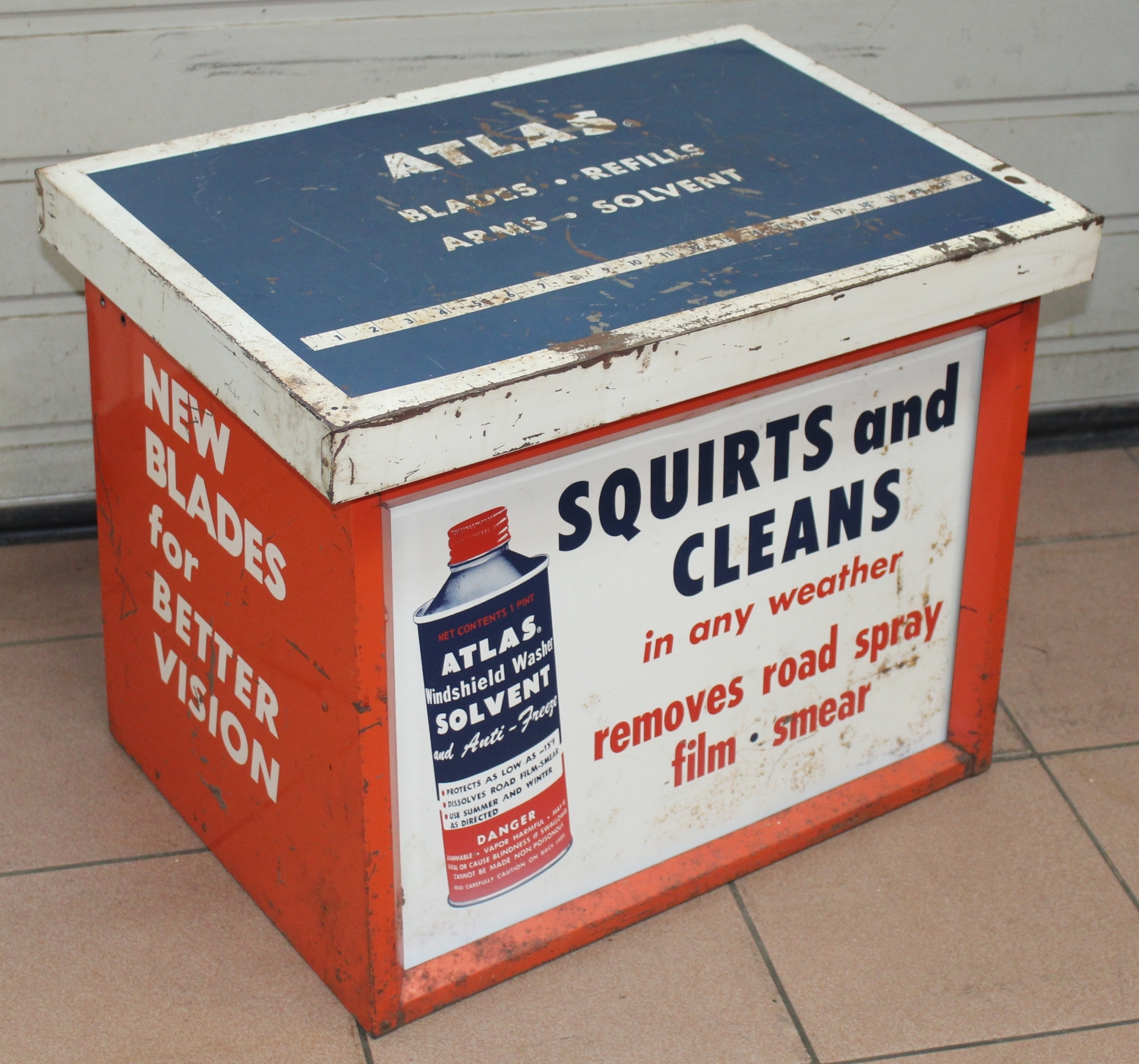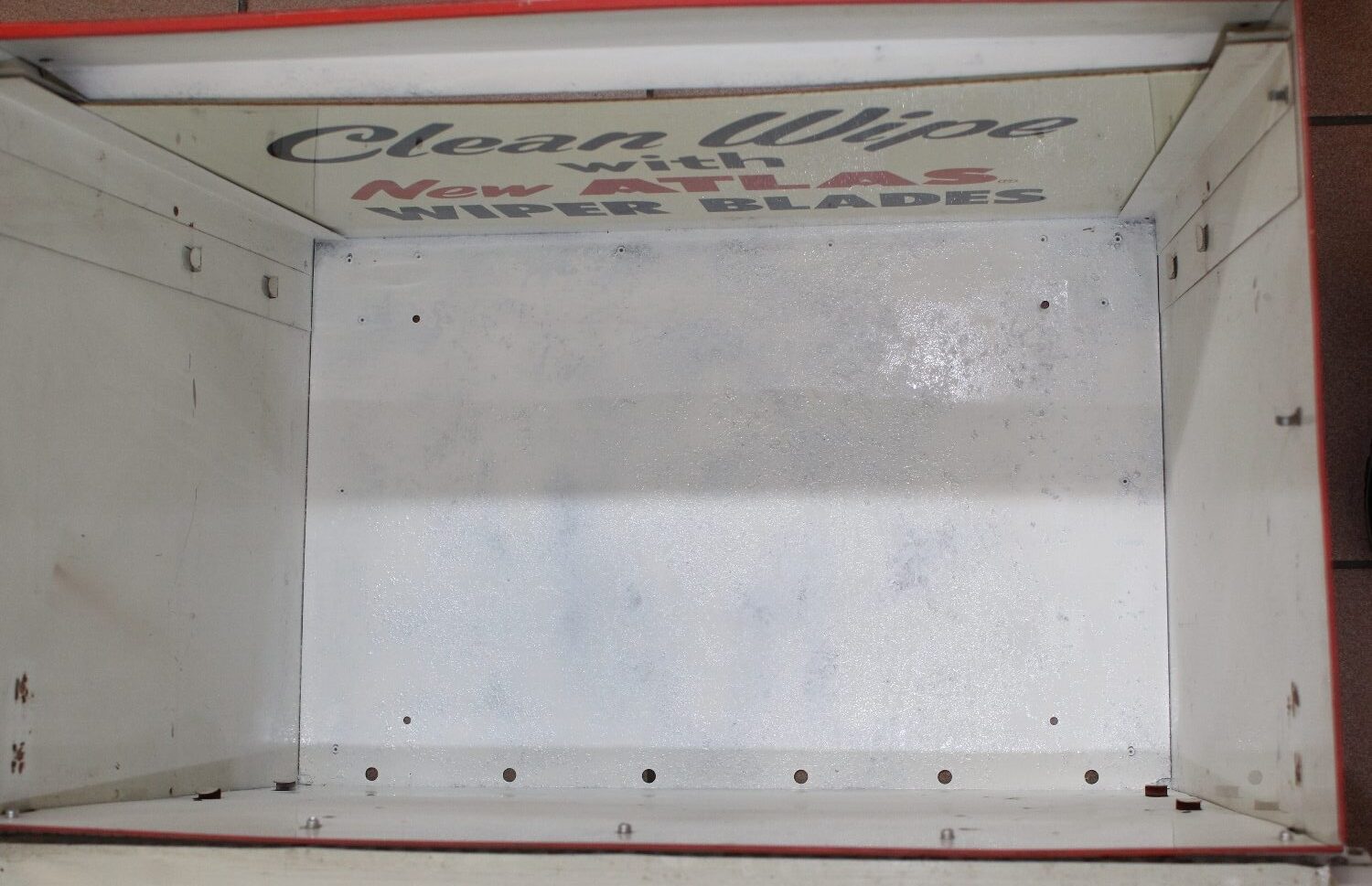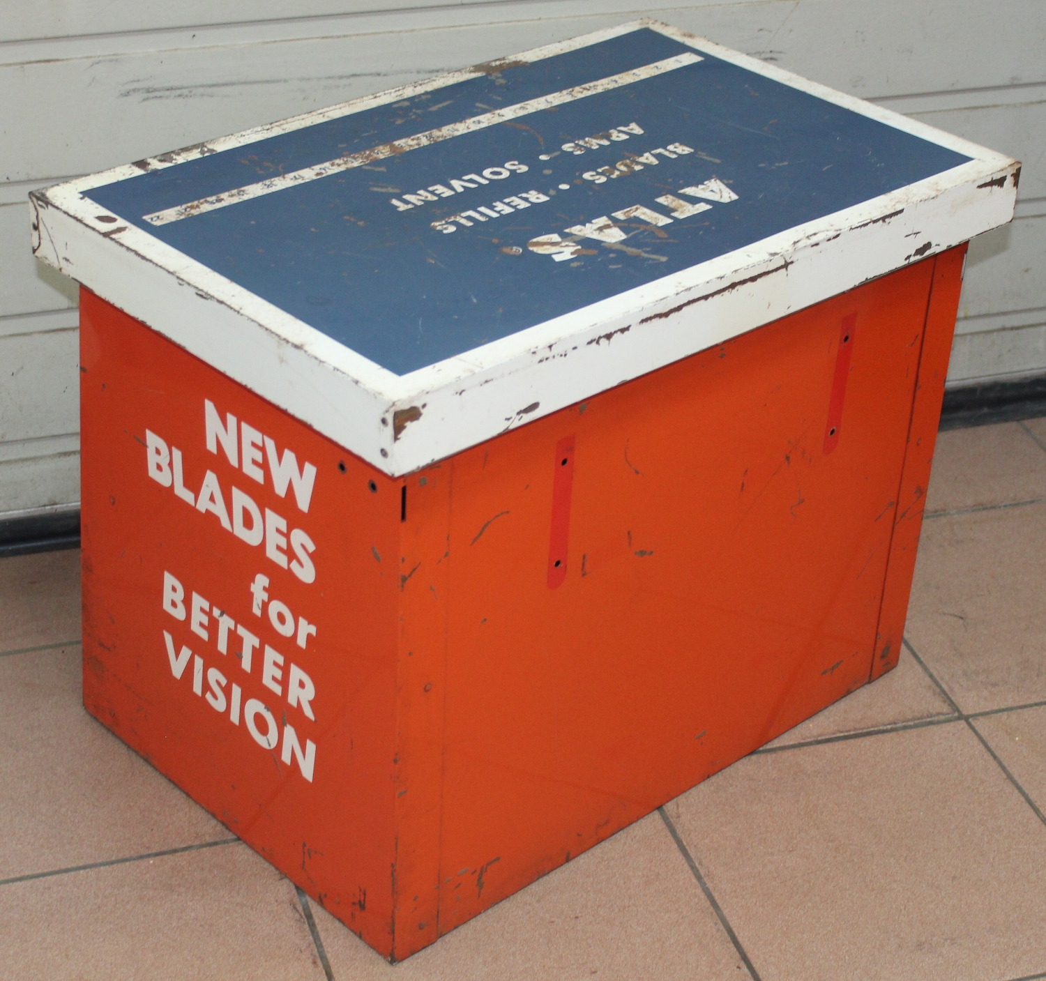 Originales Atlas Blades Scheibenwischerblätter Verkaufs-Display aus den USA, ca. aus den 60er Jahren, der Innenboden hat etwas Flugrost und wurde mit Rostumwandler-Farbe rauslackiert, die Frontwerbung kann ausgewechselt werden, Breite: 63.5cm, Tiefe: 41cm, Höhe: 49cm.