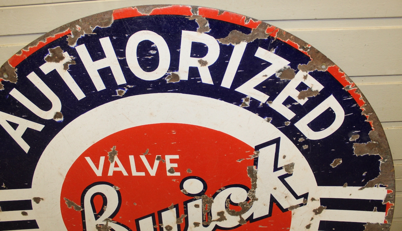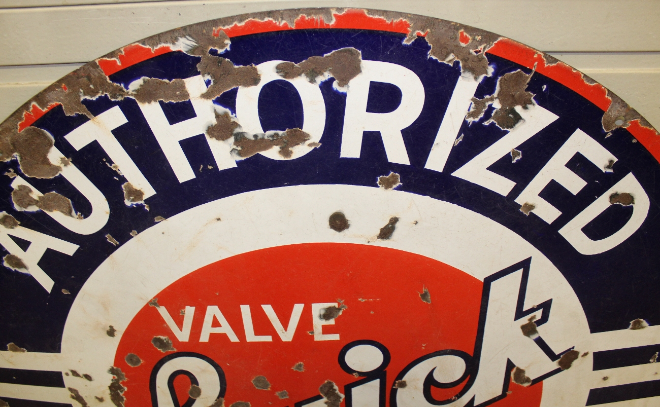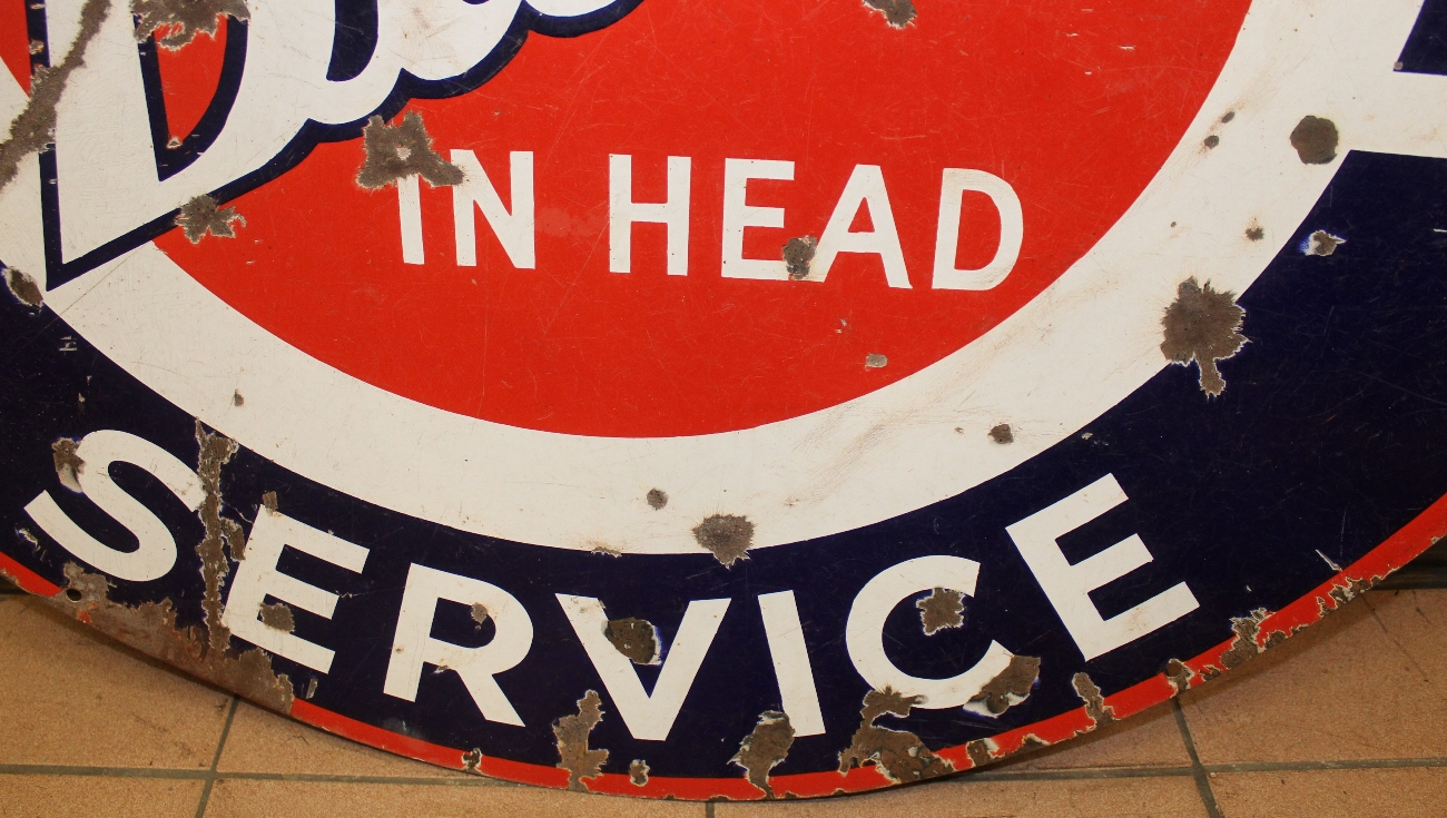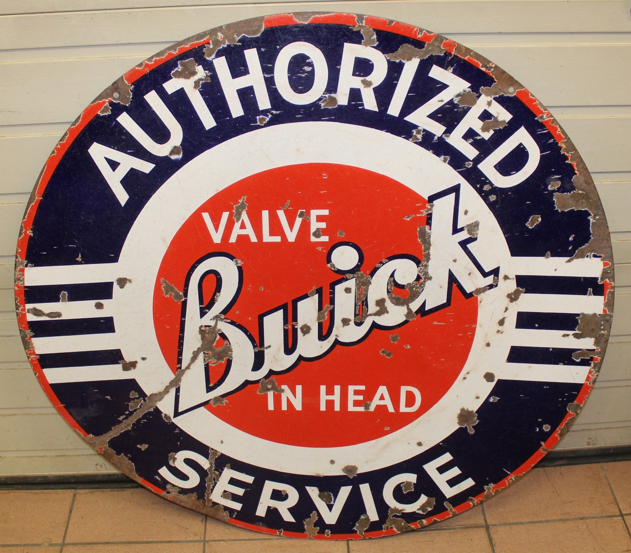 Originales doppelseitiges Buick Service Emailschild aus den 50er Jahren aus den USA, Zustand stark gebraucht, diverse Emailabplatzer, Durchmesser: 105cm.