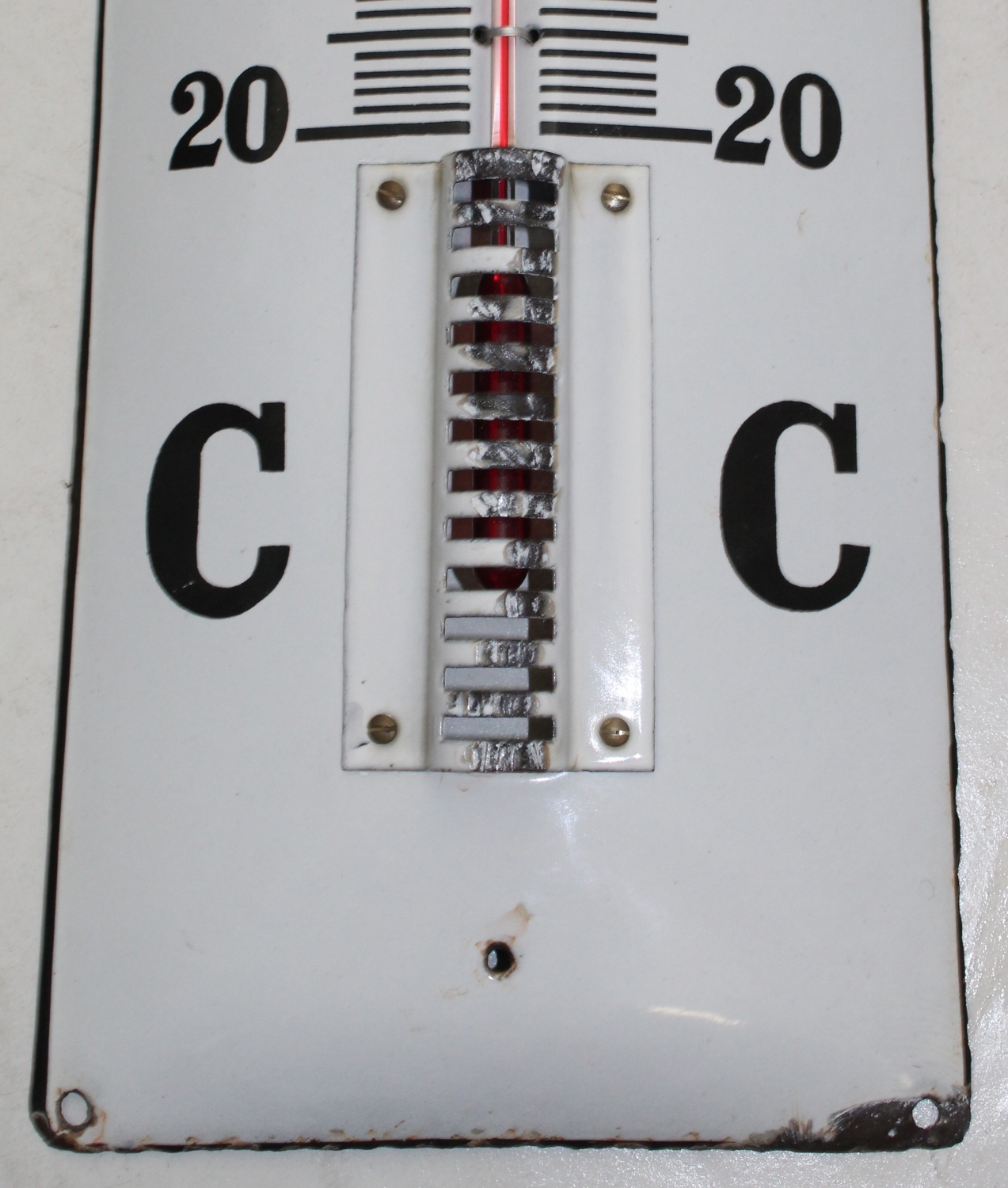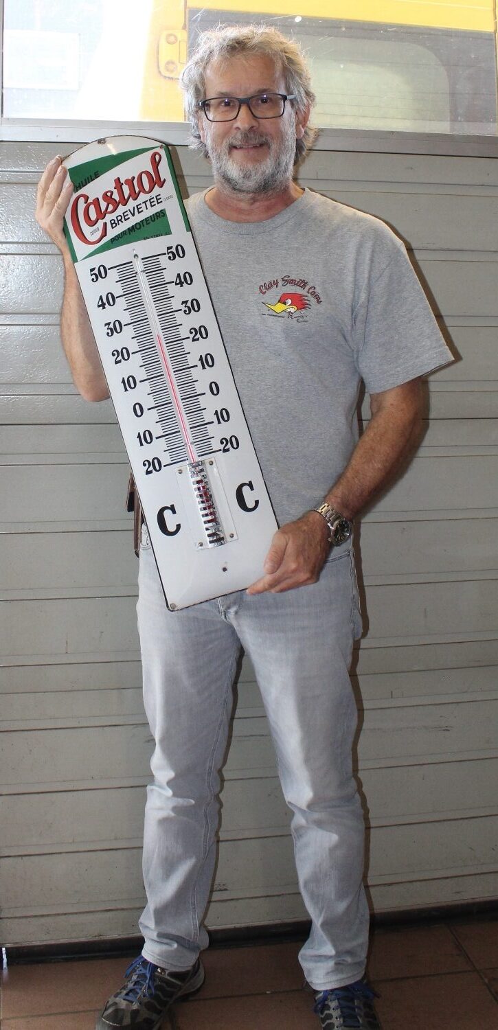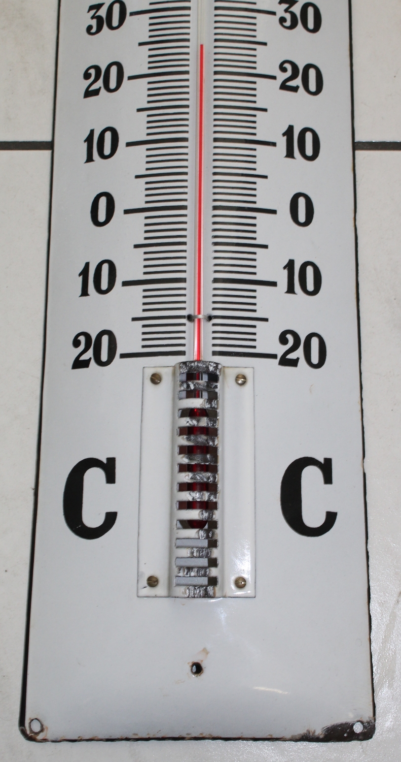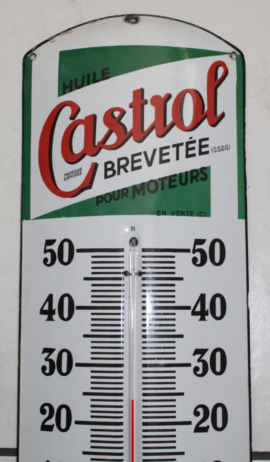 Originaler „Castrol Brevetée Huile Pour Moteurs“ Thermometer Emailschild aus Frankreich, aus den 40er Jahren, Zustand sehr gut, kleinere Emailabplatzer im Randbereich und an der Abdeckung des Thermometers, Thermometer wurde vermutlich mal erneuert, aber zeigt die Themperatur richtig an, super Glanz, stark gewölbt, Höhe: 73cm, Breite: 19cm.