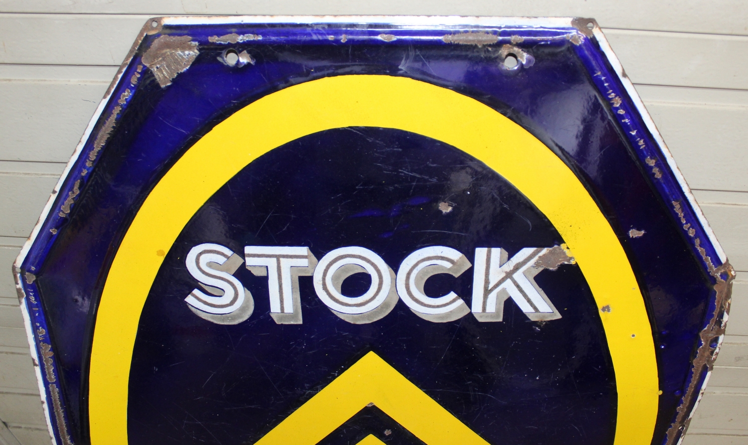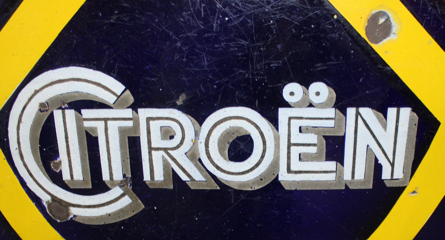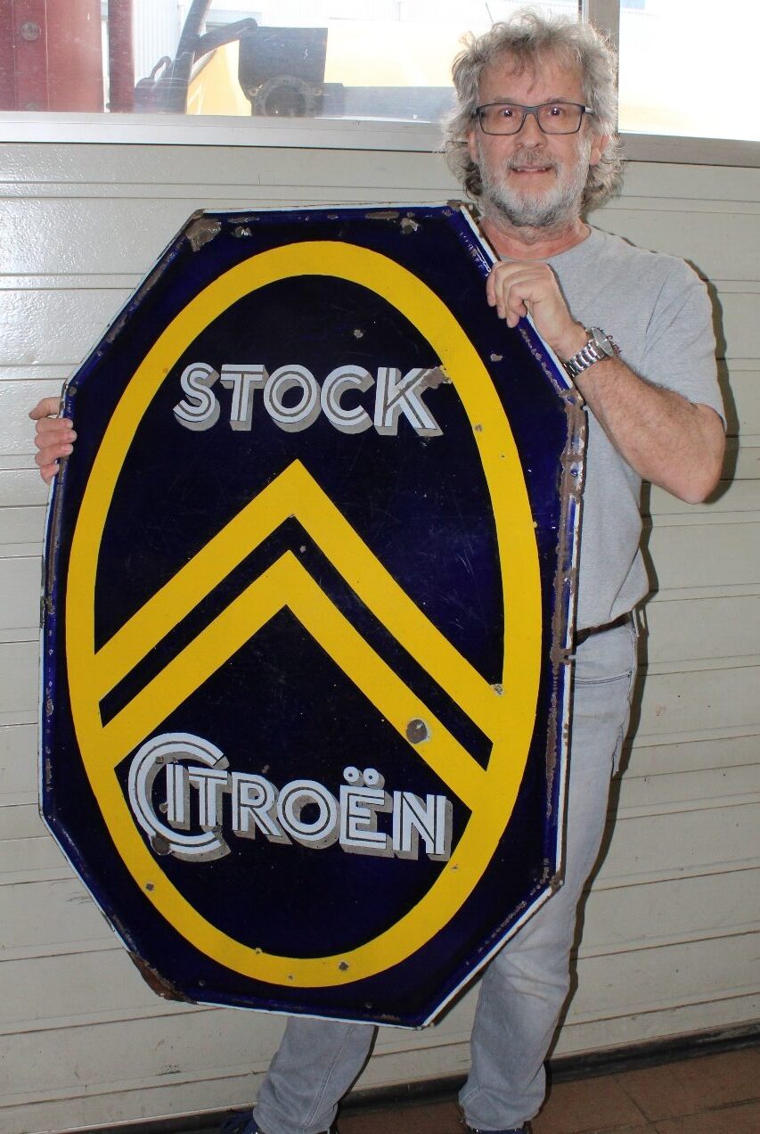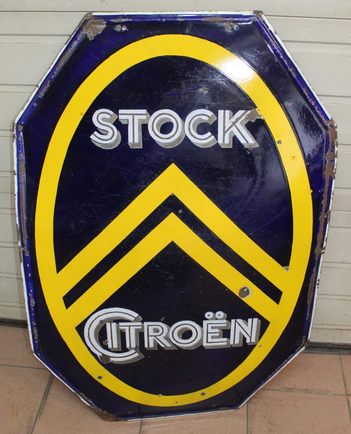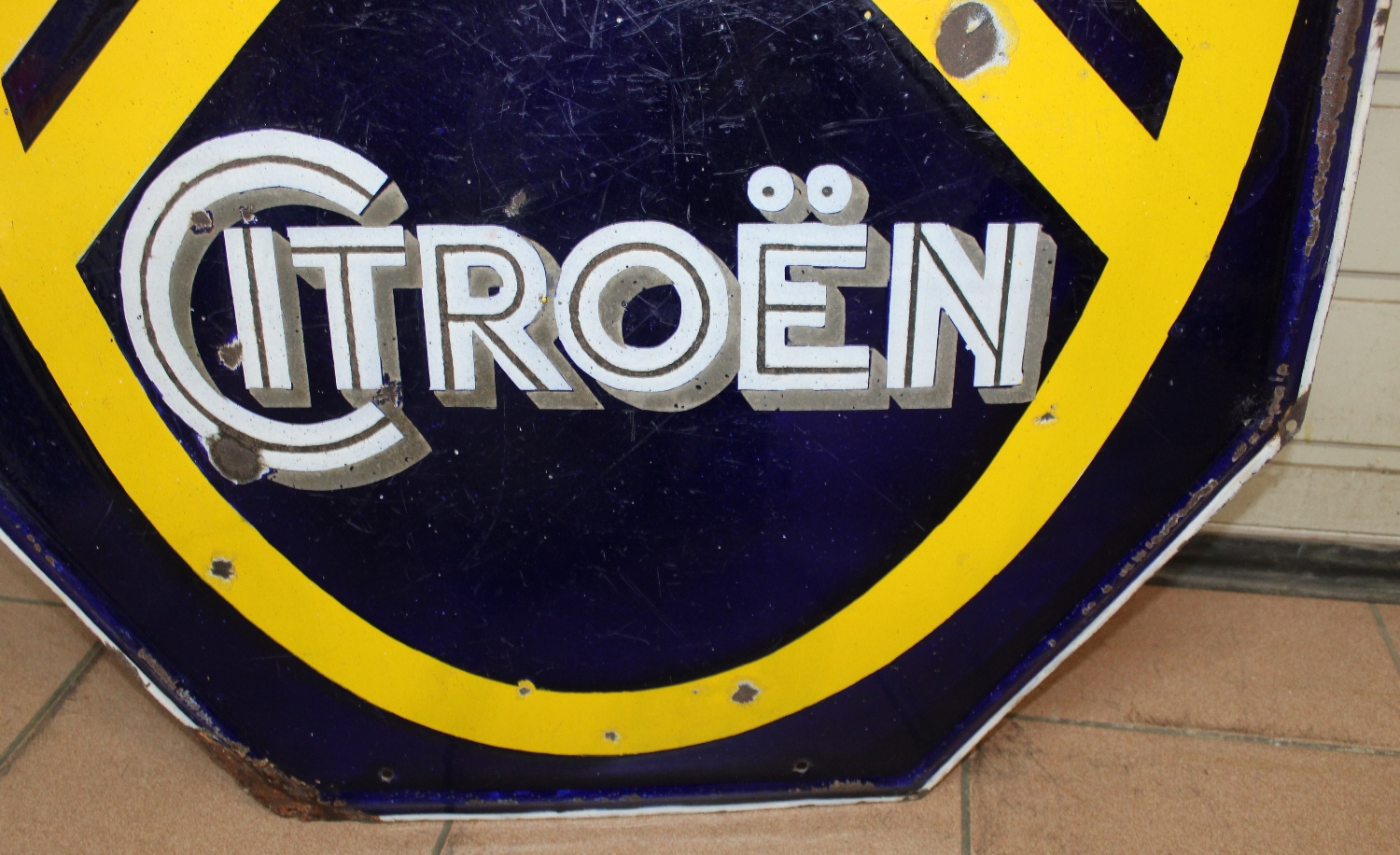 Originales sehr altes Stock Citroën Emailschild aus Frankreich, ca. aus den 20er – 30er Jahren, Zustand gebraucht, hat Emailabplatzer und viele Kratzer im Schild, guter Glanz, Schild ist verzogen und am rechten Rand hat es Dellen, Höhe: 110cm, Breite: 74cm, seltene Rarität.