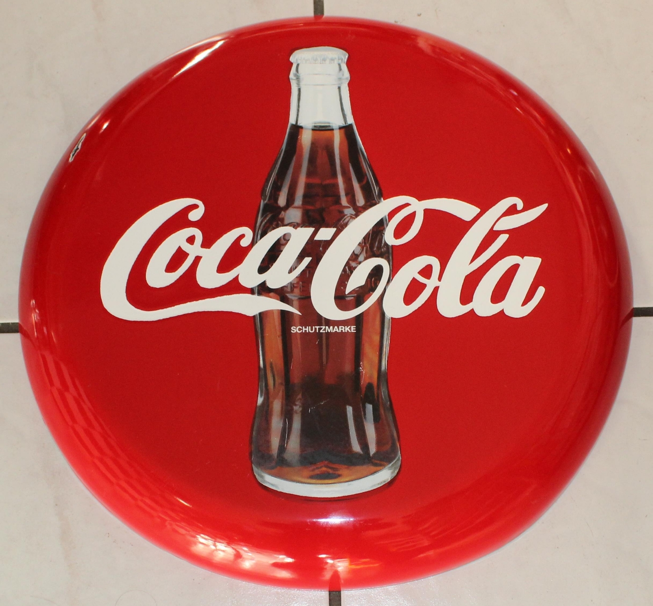 Originales Coca Cola Button Emailschild aus den 80er Jahren aus der Schweiz, kleinere Ablatzer im Randbereich, minime Oberflächenkratzer, dick emailliert, Durchmesser: 41cm.