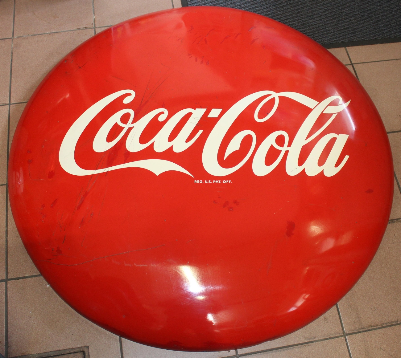 Originales grosses Coca Cola Button Blechschild aus den 50er Jahren aus den USA, diverse Kratzer, Dellen und mit Farbe ausgebesserte Stellen, Durchmesser: 122cm.