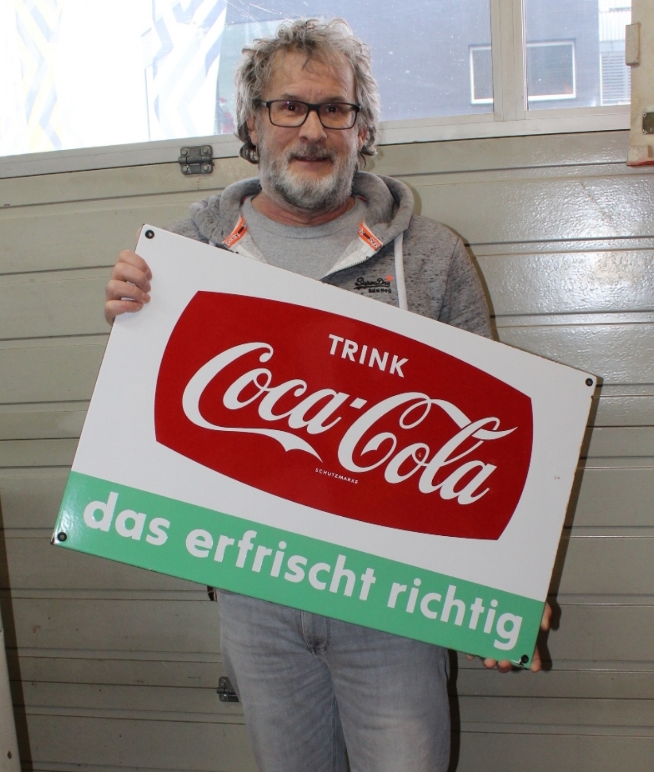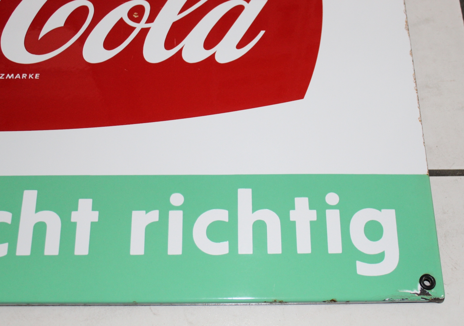 Originales Trink Coca Cola Emailschild aus den 60er Jahren aus der Schweiz, Zustand sehr gut, minime Emailabplatzer im Randbereich und an den Ecken, zwei minime Emailabplatzer im Schild, minime Oberflächenkratzer, super Glanz, Rand abgekantet, Breite: 70cm, Höhe: 45cm.