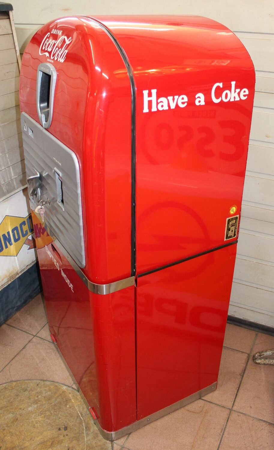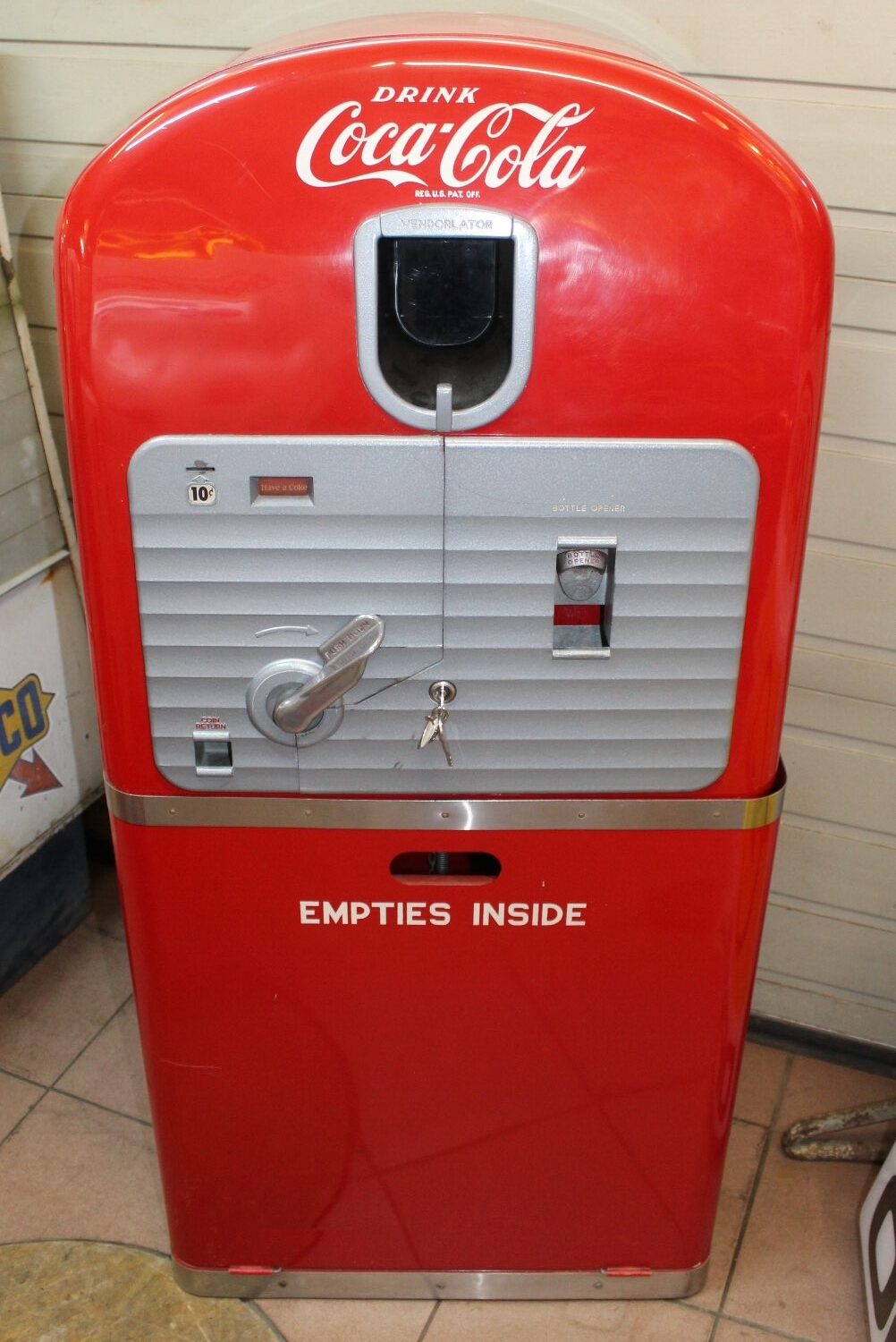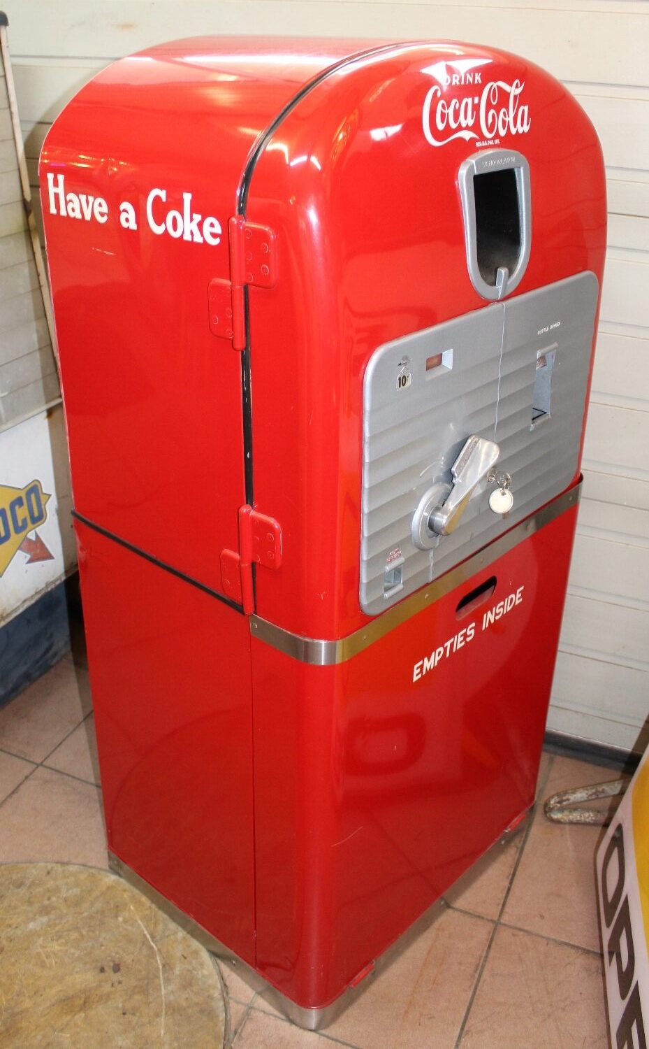Originaler Coca Cola Vendo-27 Getränke-Automat von 1948 aus den USA, Zustand sehr gut, ältere USA-Restauration, minime Oberflächenkratzer, spezieller Automat mit originalem Unterbau um die leeren Flaschen zu verstauen, Kühlung 110V funktioniert einwandfrei, es wurde ein 230V Umtransformer eingebaut, Flaschenausgabe funktioniert mit amerikanischen 10c Münzen, inkl. Schlüssel, Breite: 62cm, Höhe: 132cn, Tiefe: 56cm.