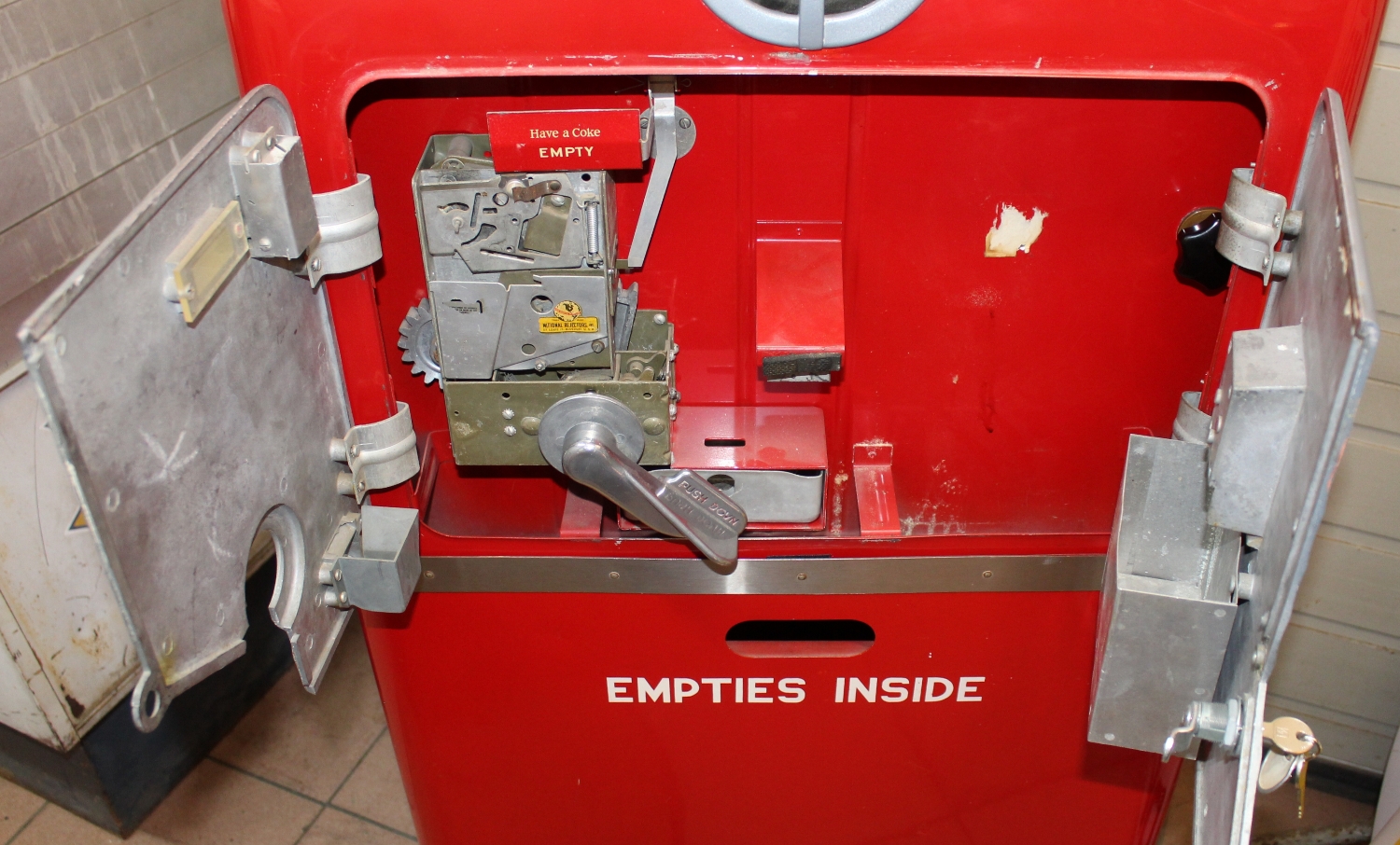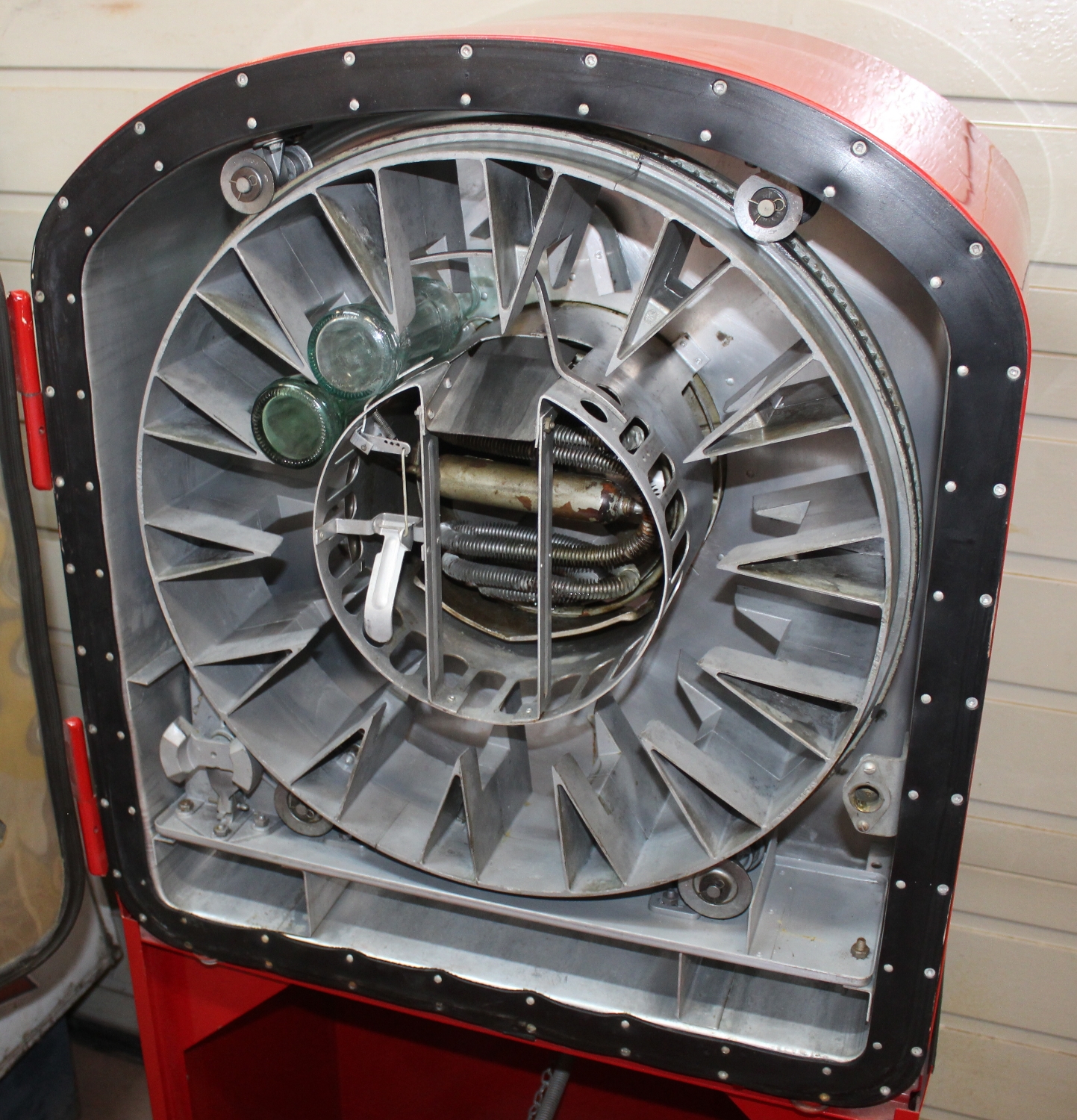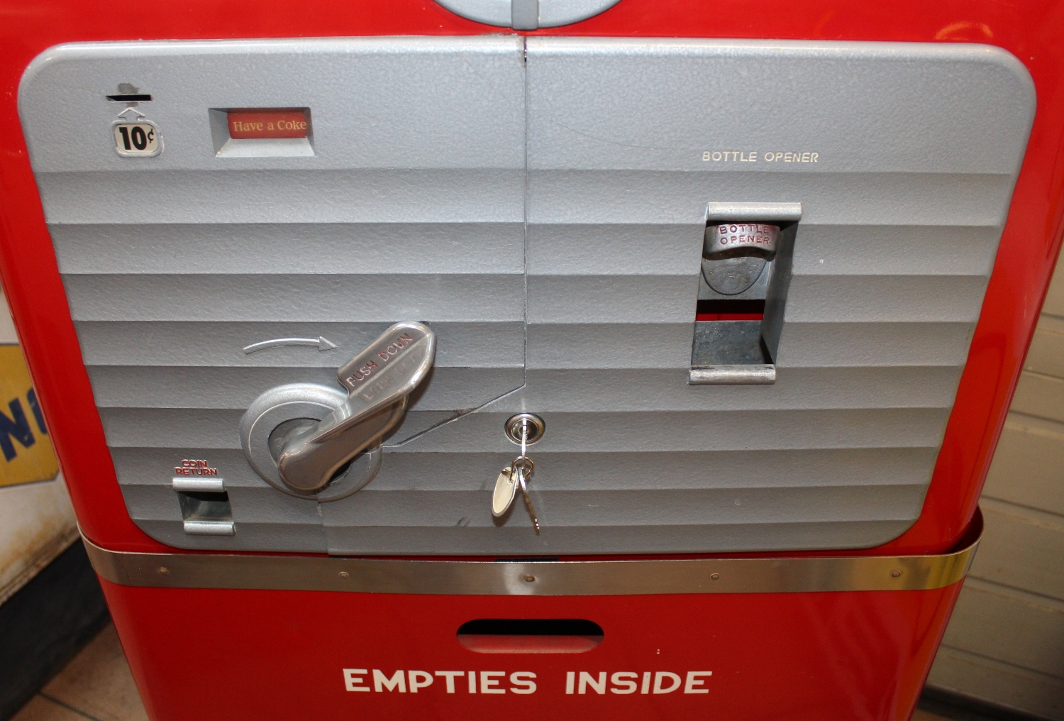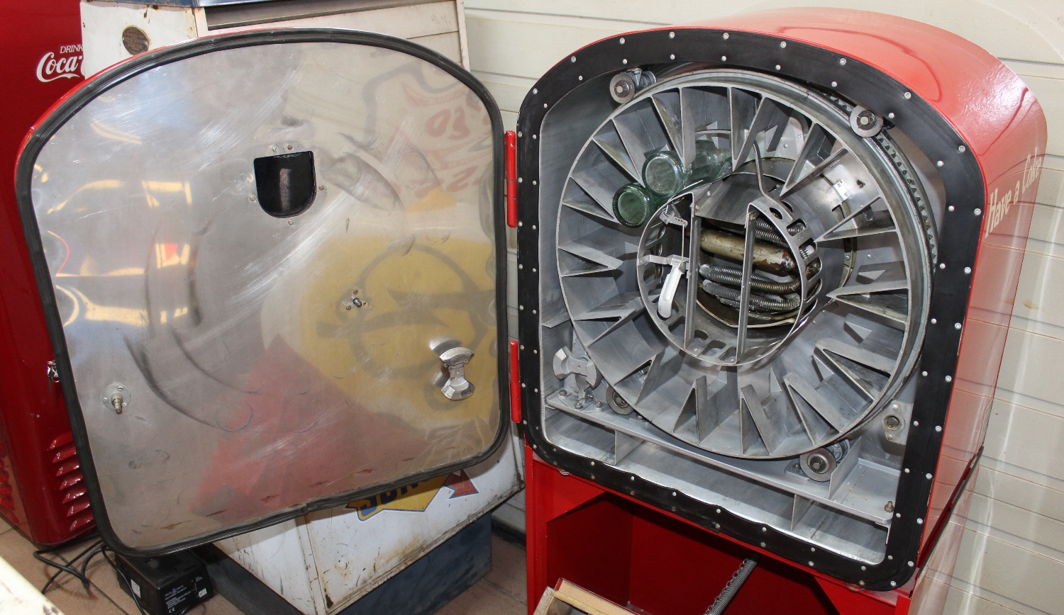 Originaler Coca Cola Vendo-27 Getränke-Automat von 1948 aus den USA, Zustand sehr gut, ältere USA-Restauration, minime Oberflächenkratzer, spezieller Automat mit originalem Unterbau um die leeren Flaschen zu verstauen, Kühlung 110V funktioniert einwandfrei, es wurde ein 230V Umtransformer eingebaut, Flaschenausgabe funktioniert mit amerikanischen 10c Münzen, inkl. Schlüssel, Breite: 62cm, Höhe: 132cn, Tiefe: 56cm.