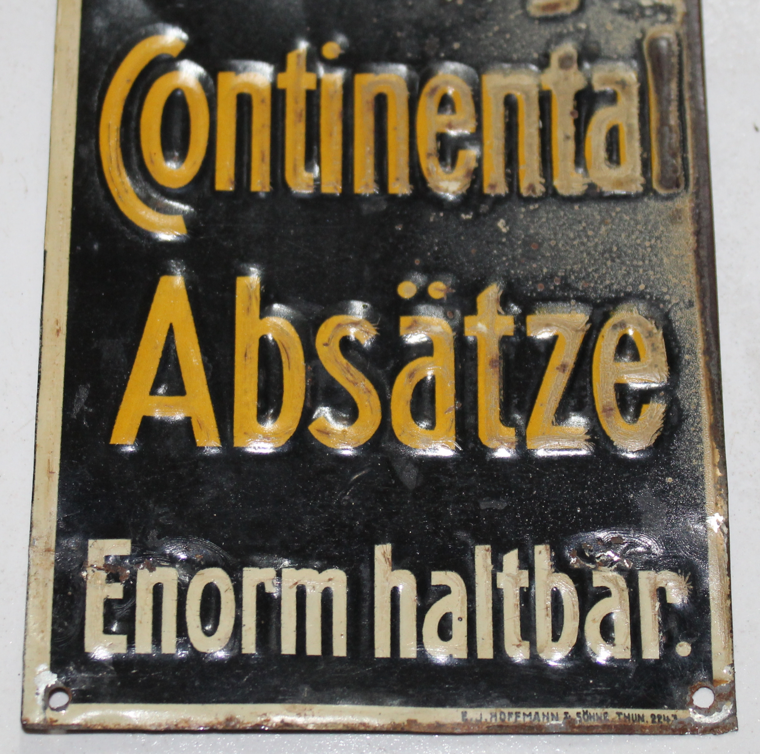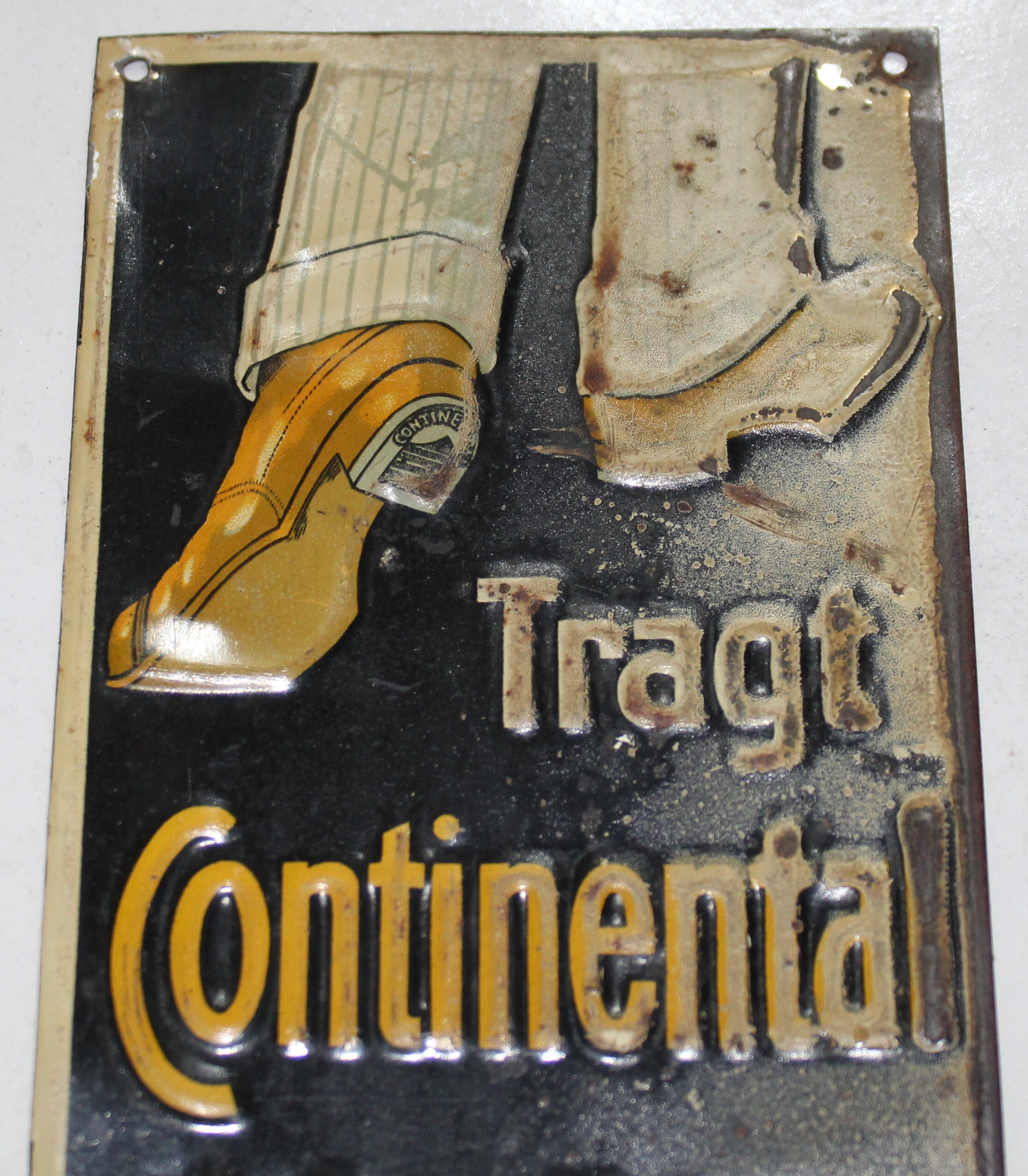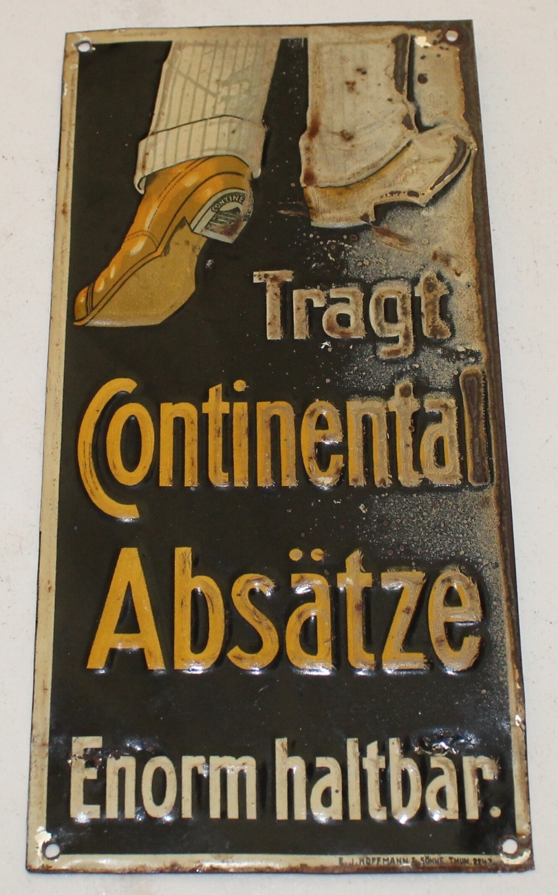 Continental Absätze Tür-Blechschild Originales „Tragt Continental Absätze“ Tür-Blechschild asu der Schweiz, ca. aus den 20er Jahren, Zustand gebraucht siehe Photos, gemarktet unten rechts mit: „E.J. HOFFMANN & SÖHNE THUN“, Höhe: 17.5cm, Breite: 8.5cm.Preis 180.- sFr.