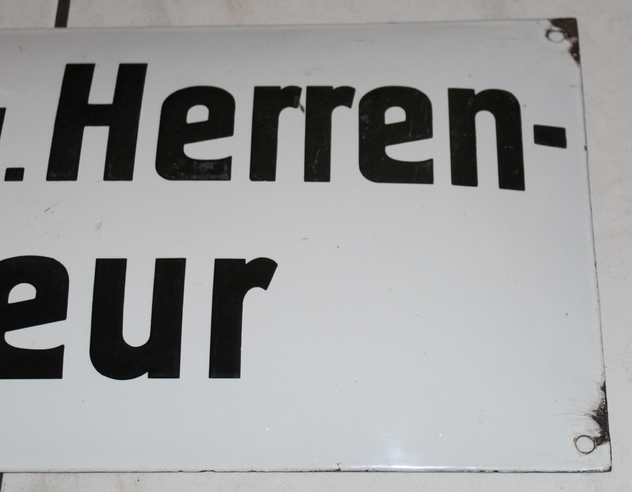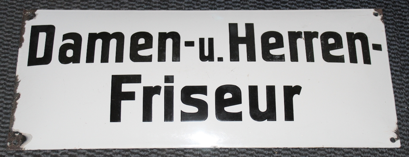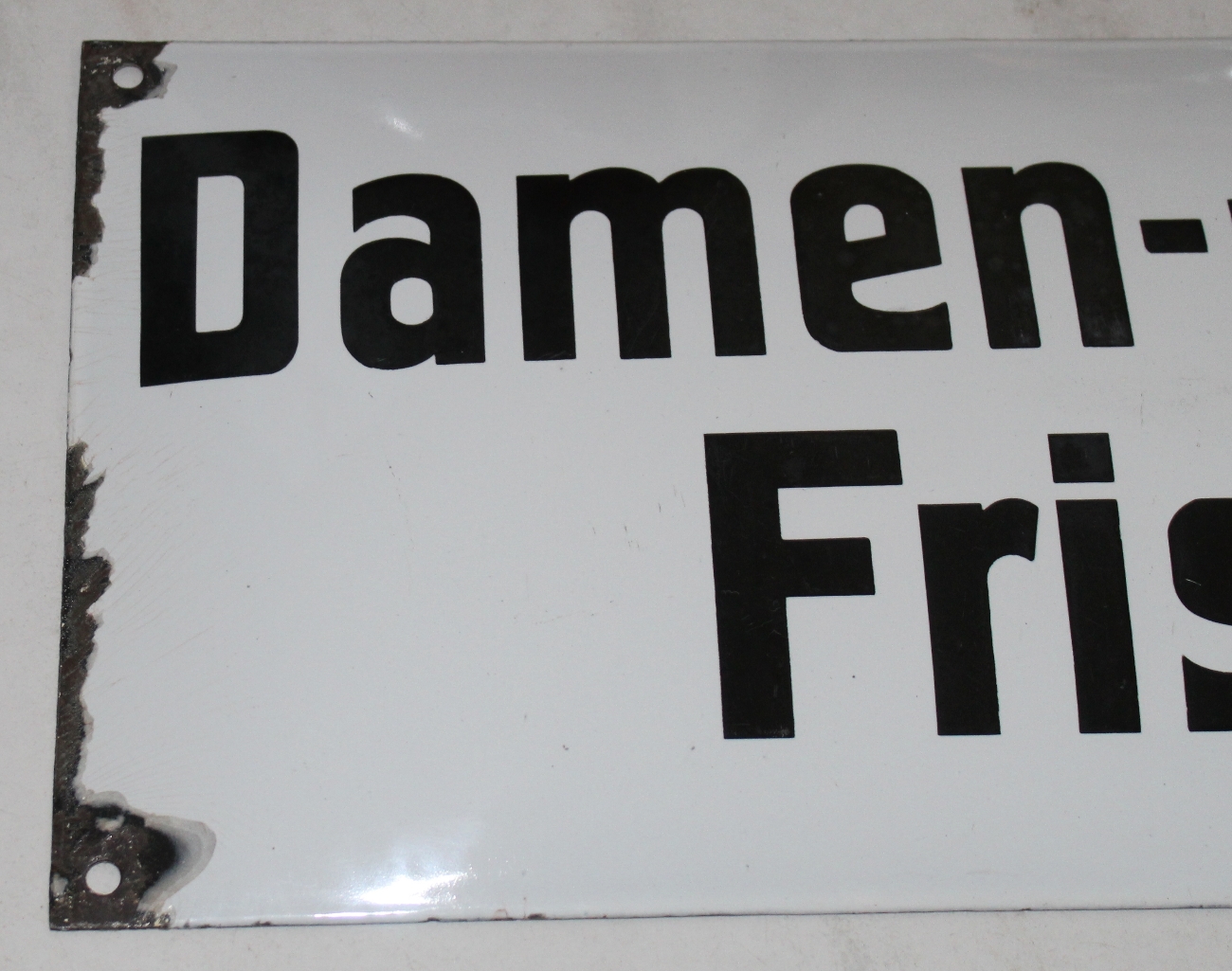 Originales Damen- u. Herren Friseur Emailschild aus den 30er oder 40er Jahren, Zustand gut, hat ein paar Emailabplatzer im Randbereich, stark gewölbt, dick emailliert, Breite: 60cm, Höhe: 25cm.