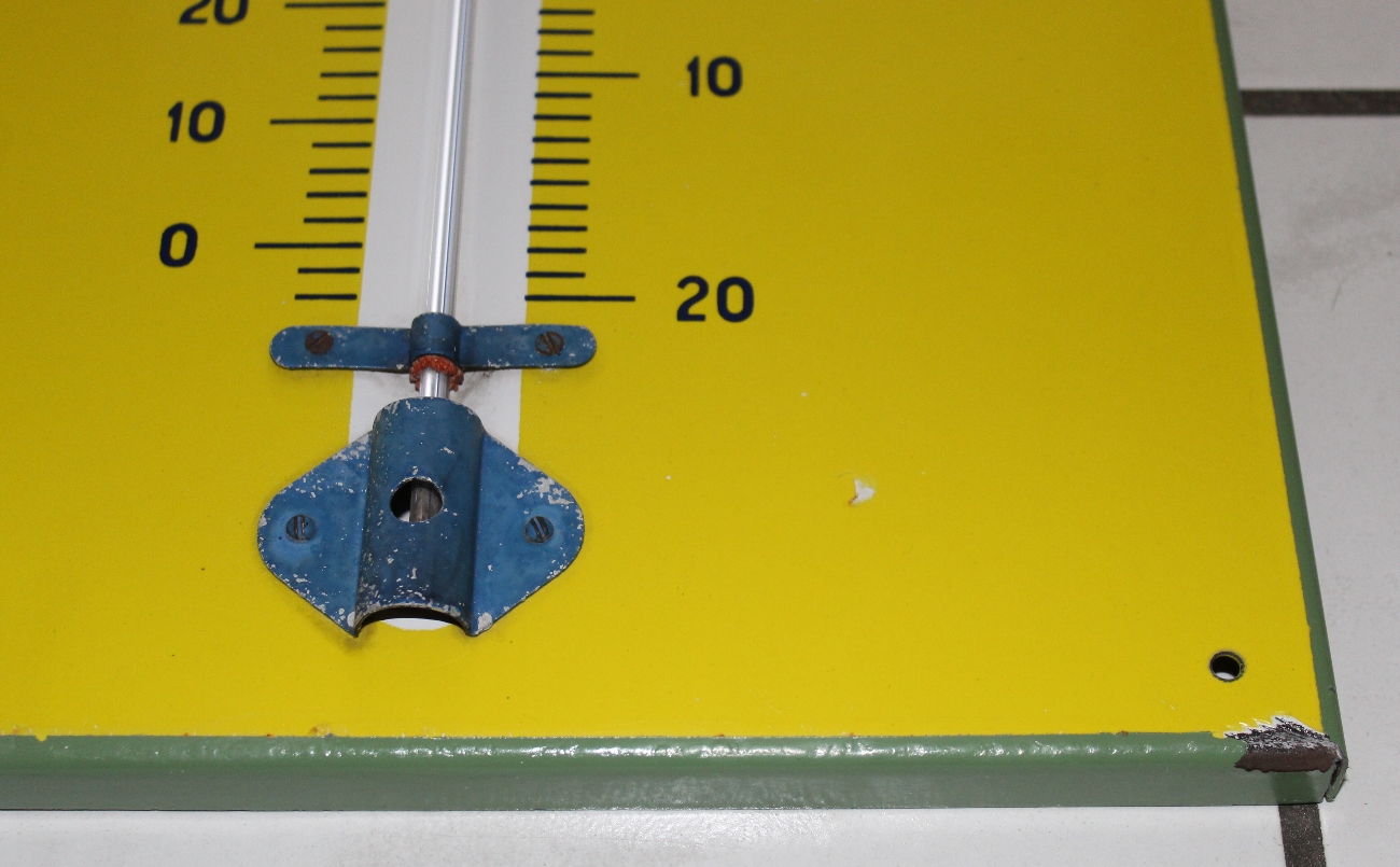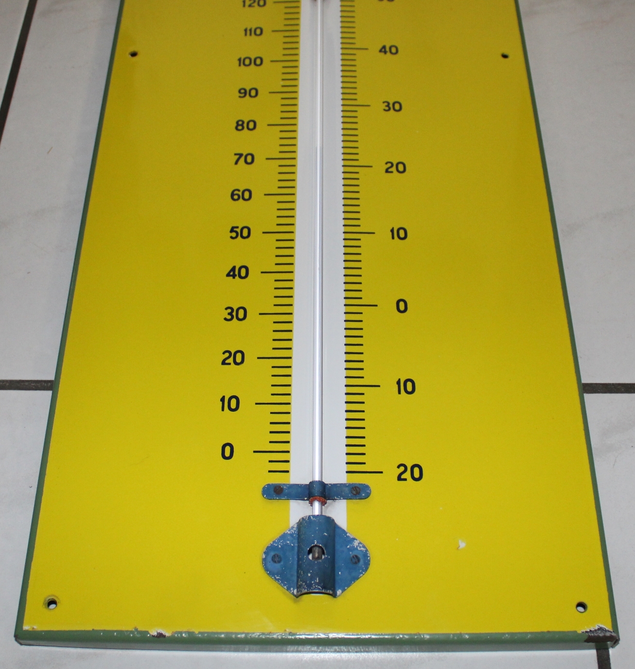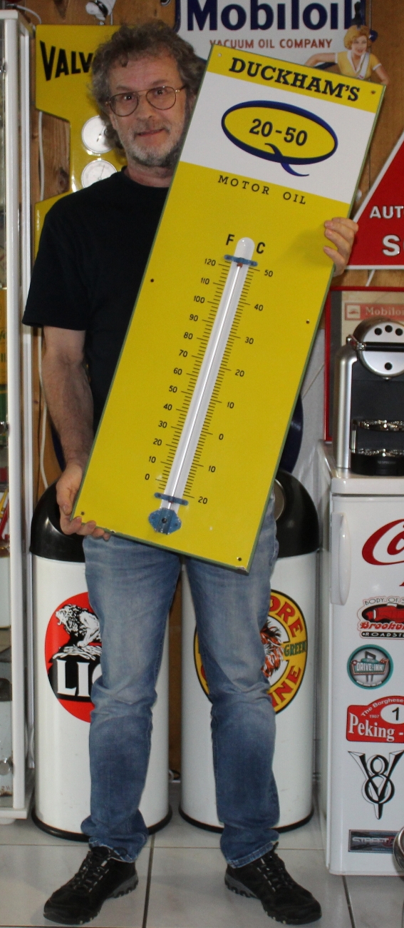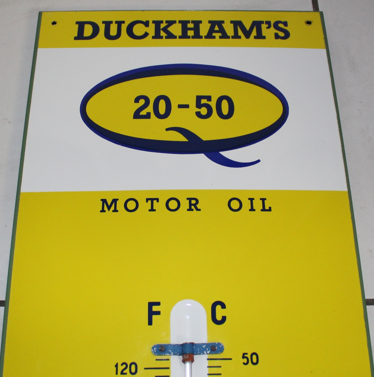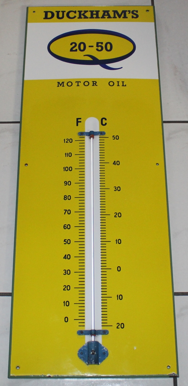 Originales Duckham`s Motor Oil Thermometer Emailschild aus England ca. aus den 50er oder 60er Jahren, Zustand sehr gut, super Glanz, Thermometer funktioniert, am unteren Rand kleinere Emailabplatzer, der Rand wurde grün lackiert, Höhe: 91.5cm, Breite: 33cm.