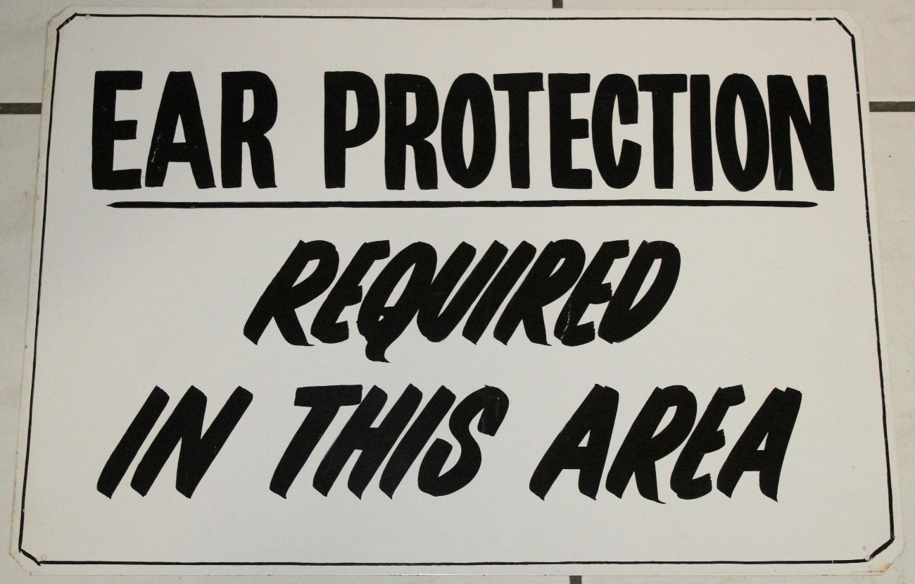Ear Protection Blechschild USA Originales Hinweisschild aus den 70er Jahren aus den USA, wurde noch von Hand gemalt, Breite: 51cm, Höhe: 35.5cm.Preis 65.- sFr.