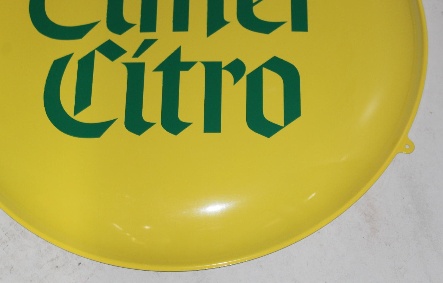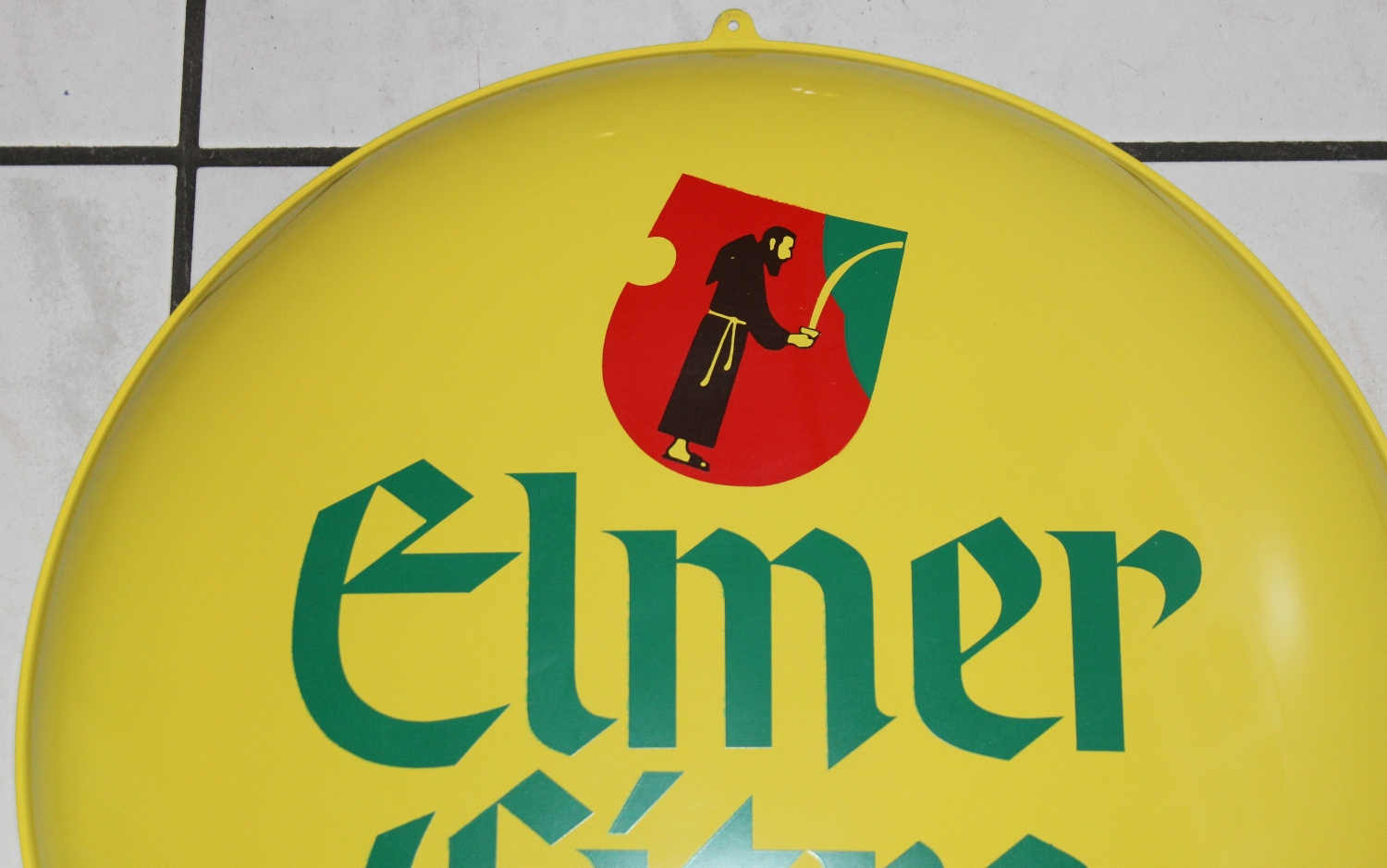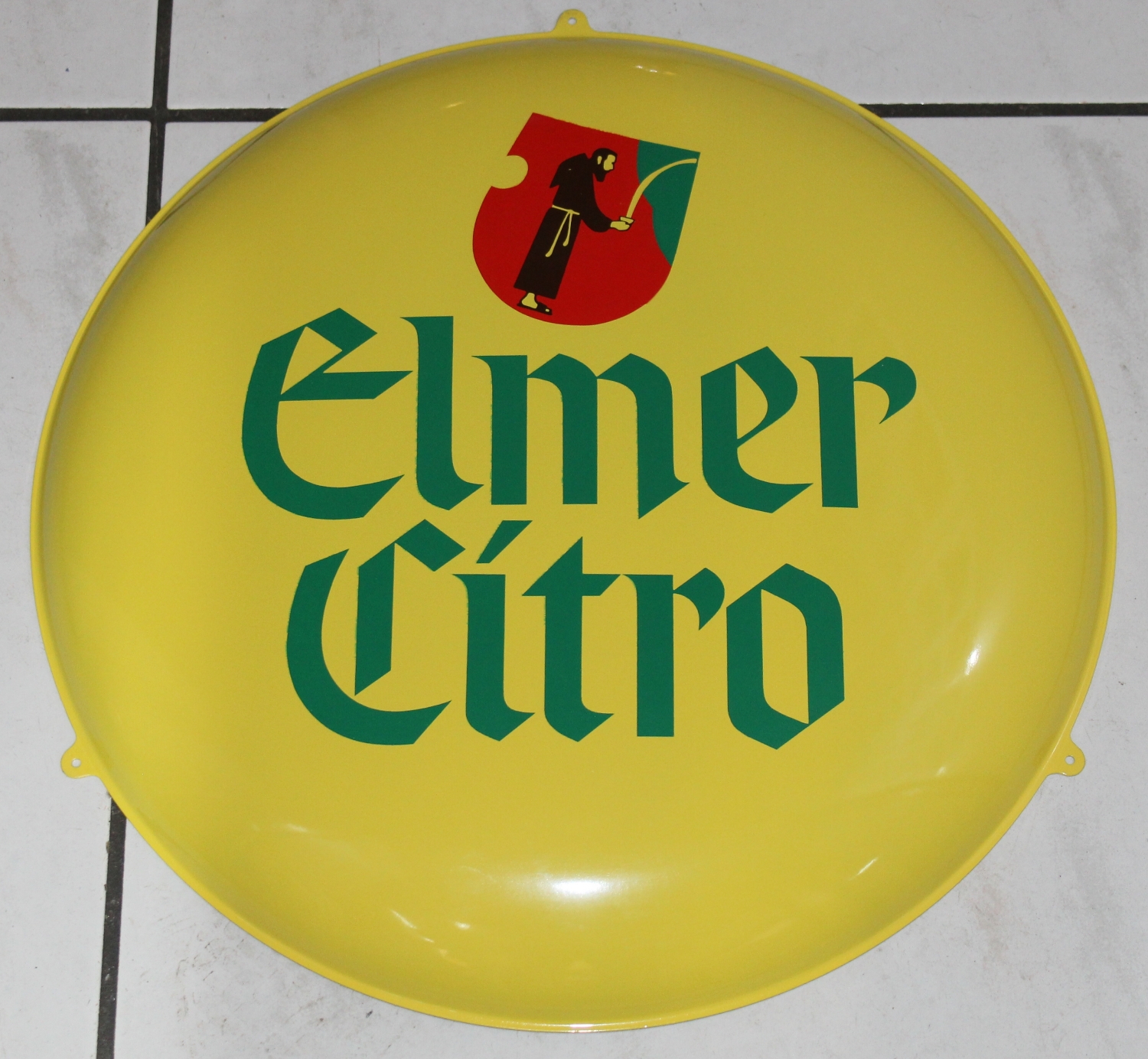 Originales „Elmer Citro“ Button Blechschild aus den 50er oder 60er Jahren aus der Schweiz, Zustand sehr gut, wie neu, vermutlich nie gehangen, stark gewölbt, Durchmesser: 41cm.