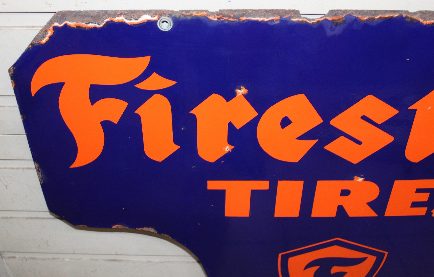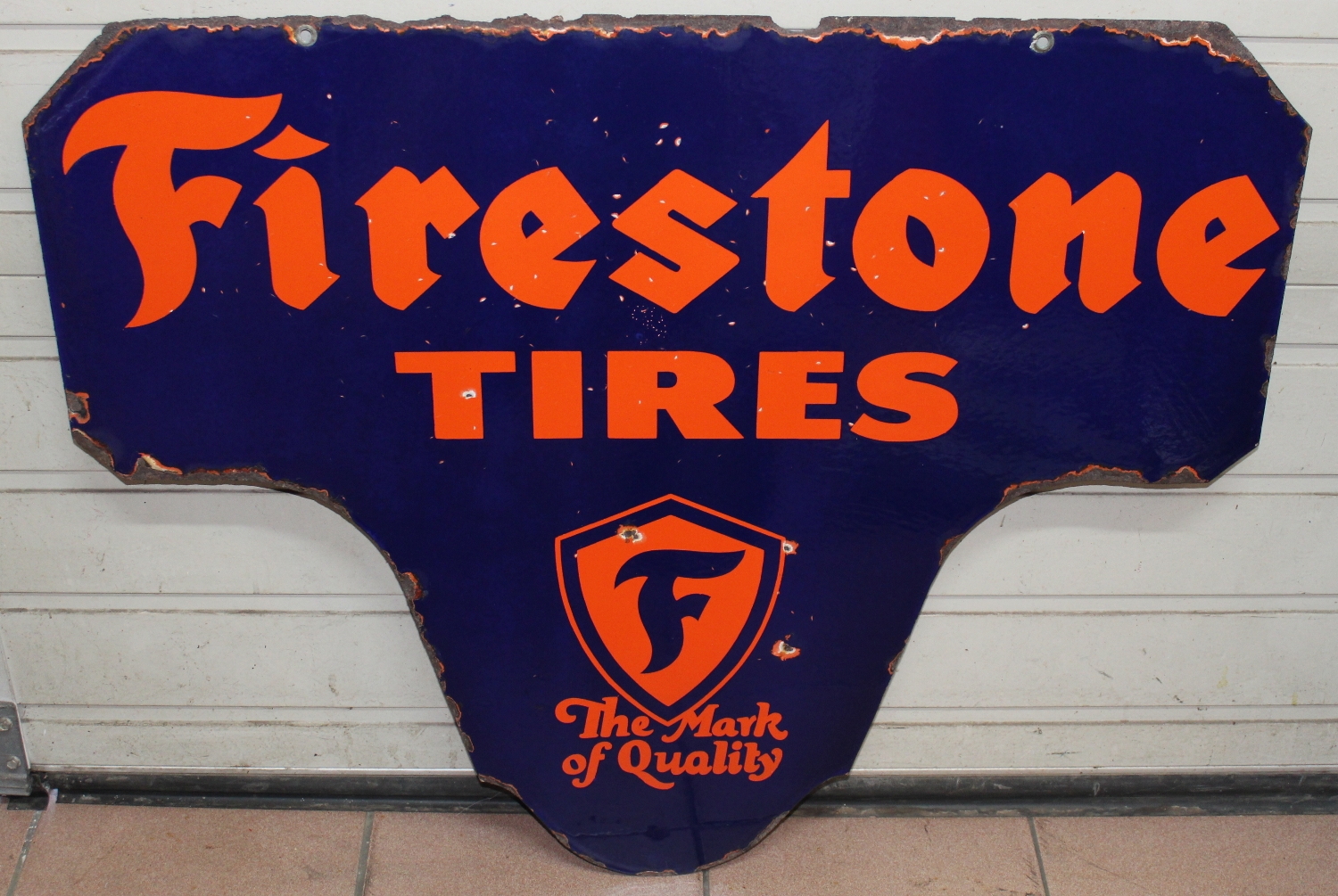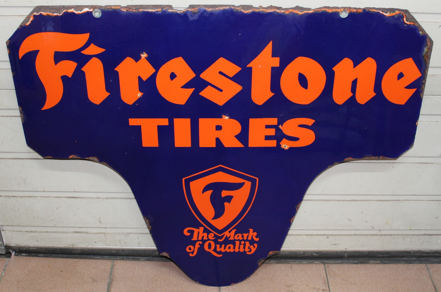 Originales Firestone Tires doppelseitiges Emailschild aus den USA, ca. aus den 40er Jahren, Zustand gut, diverse Emailabplatzer im Randbereich und minime Abplatzer im Schild, Substanzverlust am oberen Rand, ursprünglich wurden diese Schilder auf einem Ständer montiert und als Werbeträger am Strassenrand platziert, Breite: 91.2cm, Höhe: 76.2cm, sehr seltene Rarität.