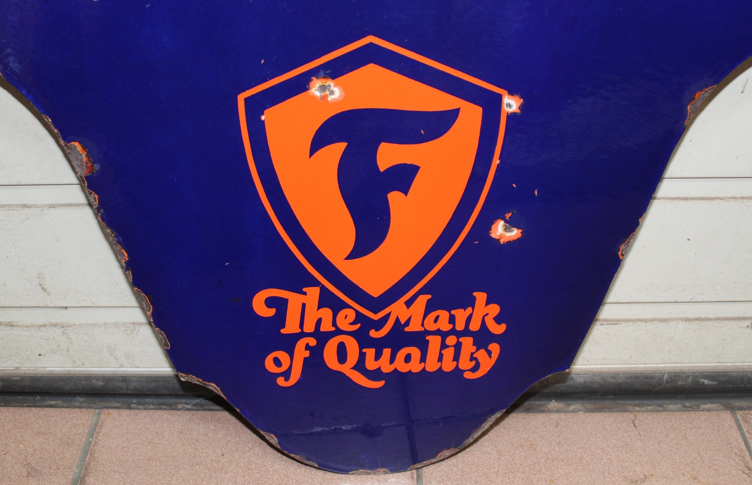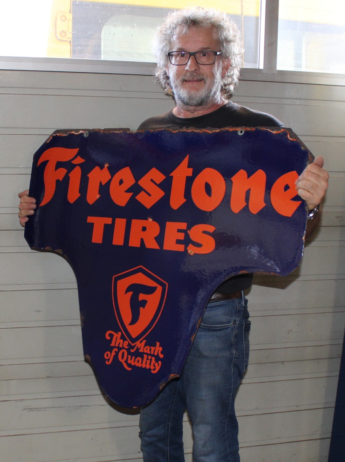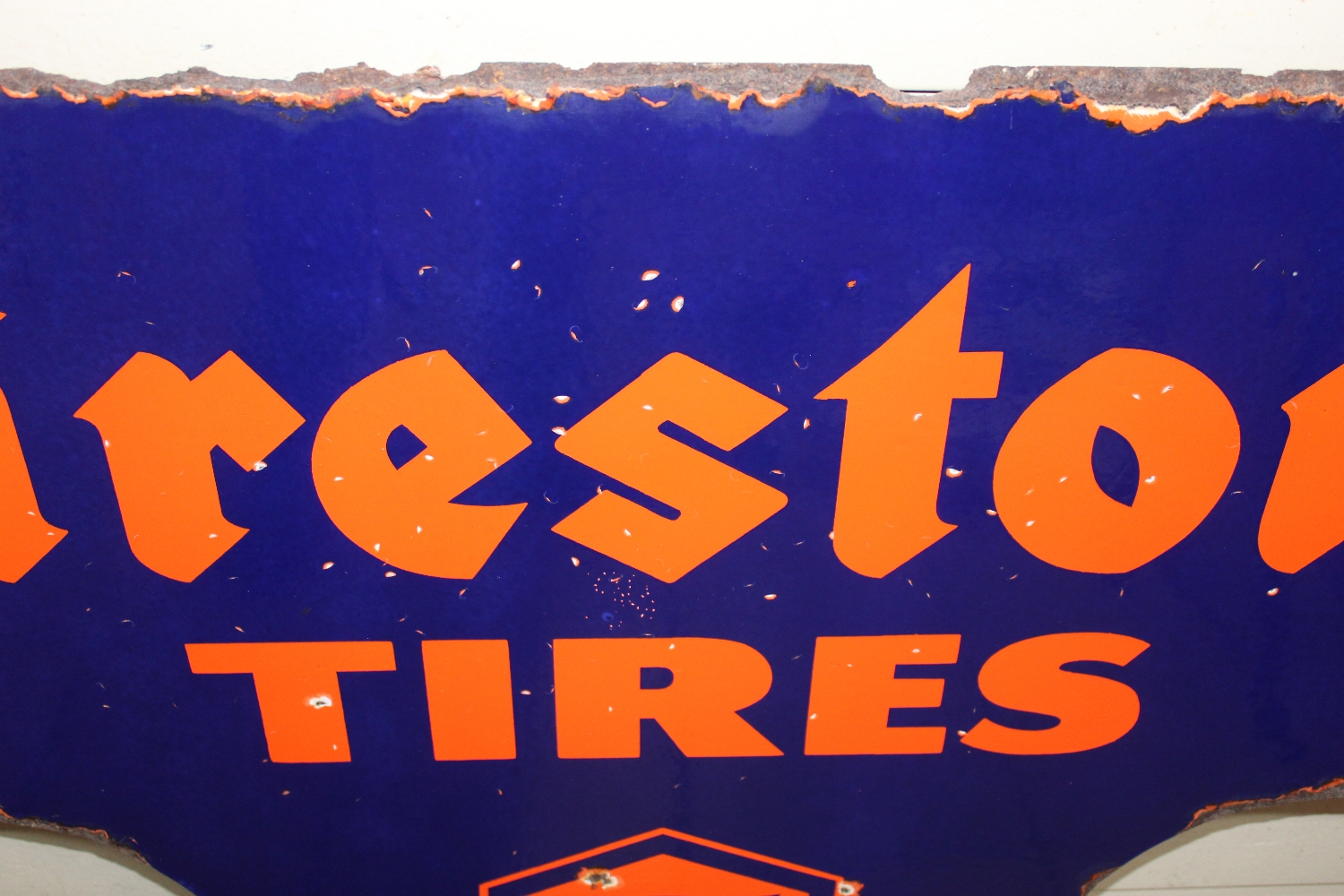 Originales Firestone Tires doppelseitiges Emailschild aus den USA, ca. aus den 40er Jahren, Zustand gut, diverse Emailabplatzer im Randbereich und minime Abplatzer im Schild, Substanzverlust am oberen Rand, ursprünglich wurden diese Schilder auf einem Ständer montiert und als Werbeträger am Strassenrand platziert, Breite: 91.2cm, Höhe: 76.2cm, sehr seltene Rarität.