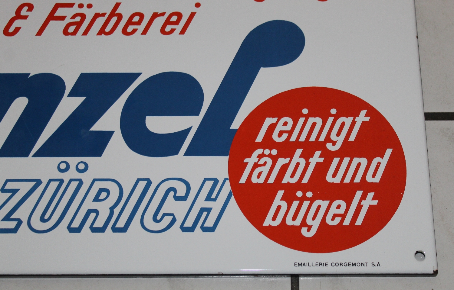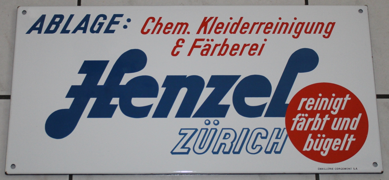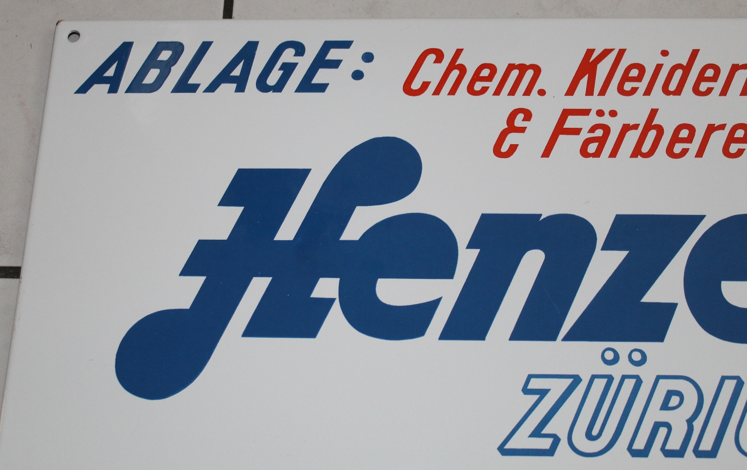 Originales Henzel Ablage: Chem. Kleiderreinigung & Färberei Zürich aus den 50er oder 60er Jahren, Zustand sehr gut, vermutlich nie gehangen, minimer Kratzer im „n“ von Henzel, Rand agekantet, super Glanz, Rechts unten gemarktet mit: „EMAILLERIE CORGEMONT S.A.“,Breite: 62cm, Höhe: 30cm.