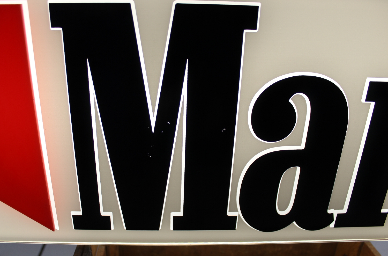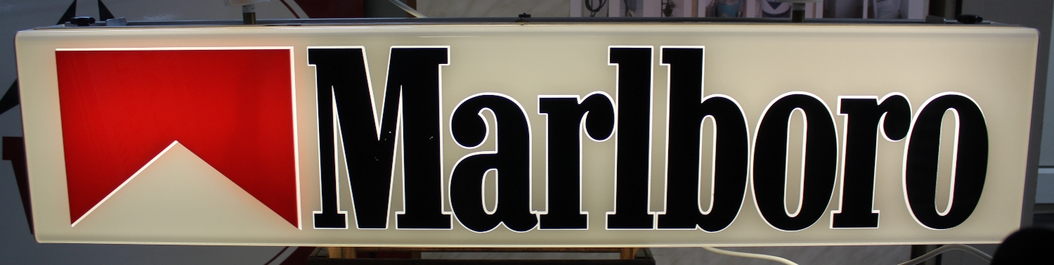 Originale Marlboro Zigaretten Theken-Leuchte aus der Schweiz, vermutlich aus den 90er Jahren, Zustand sehr gut, minime Kratzer im Marlboro Schriftzug (siehe letzte Photos), mit originaler Neonröhre, Kabel wurde erneuert, Unterseite mit Milch-Plexi -Glas ausgestattet daher leuchtet es unten auch raus, Länge: 126cm, Höhe: 27.5cm, Tiefe: 15cm.
