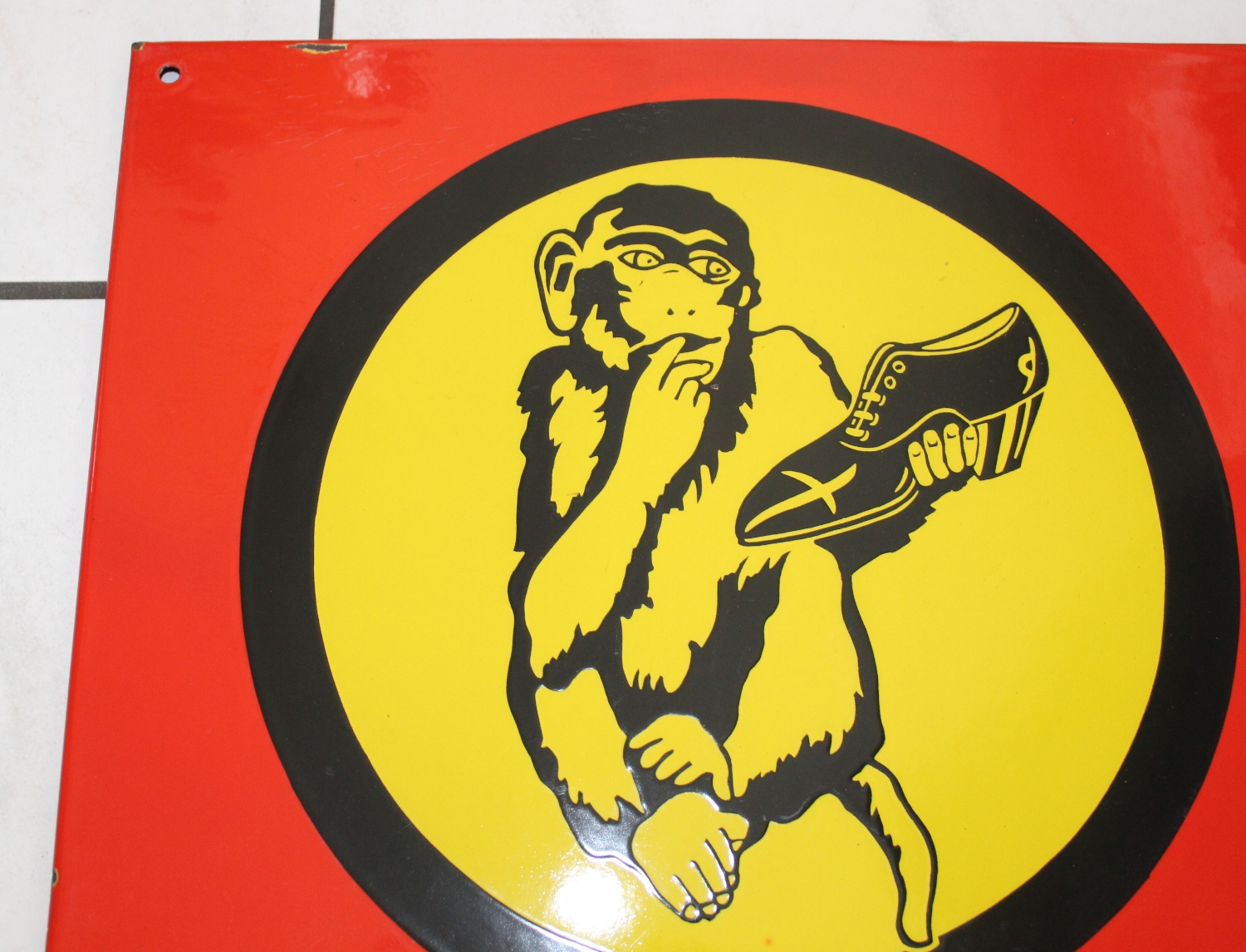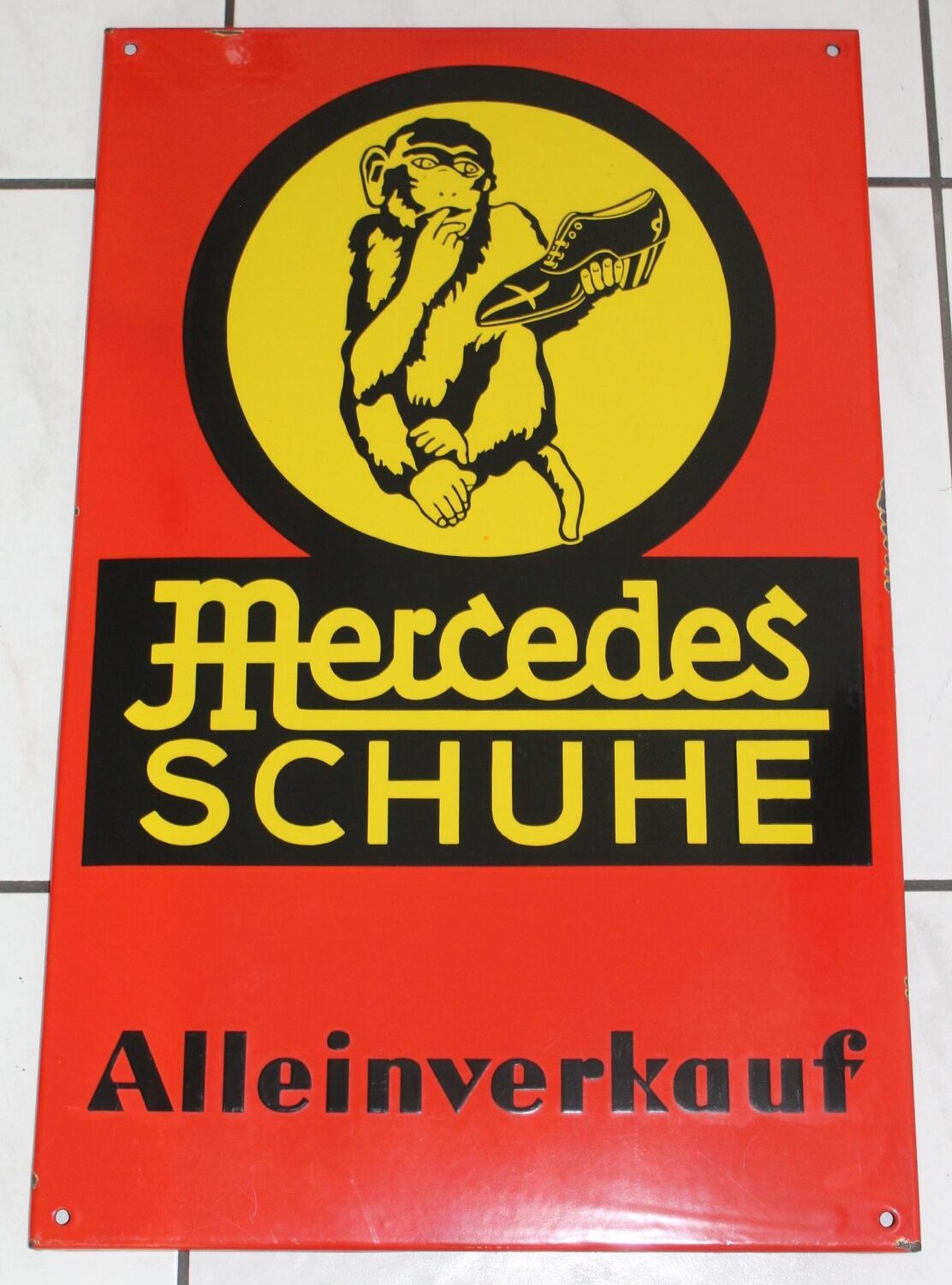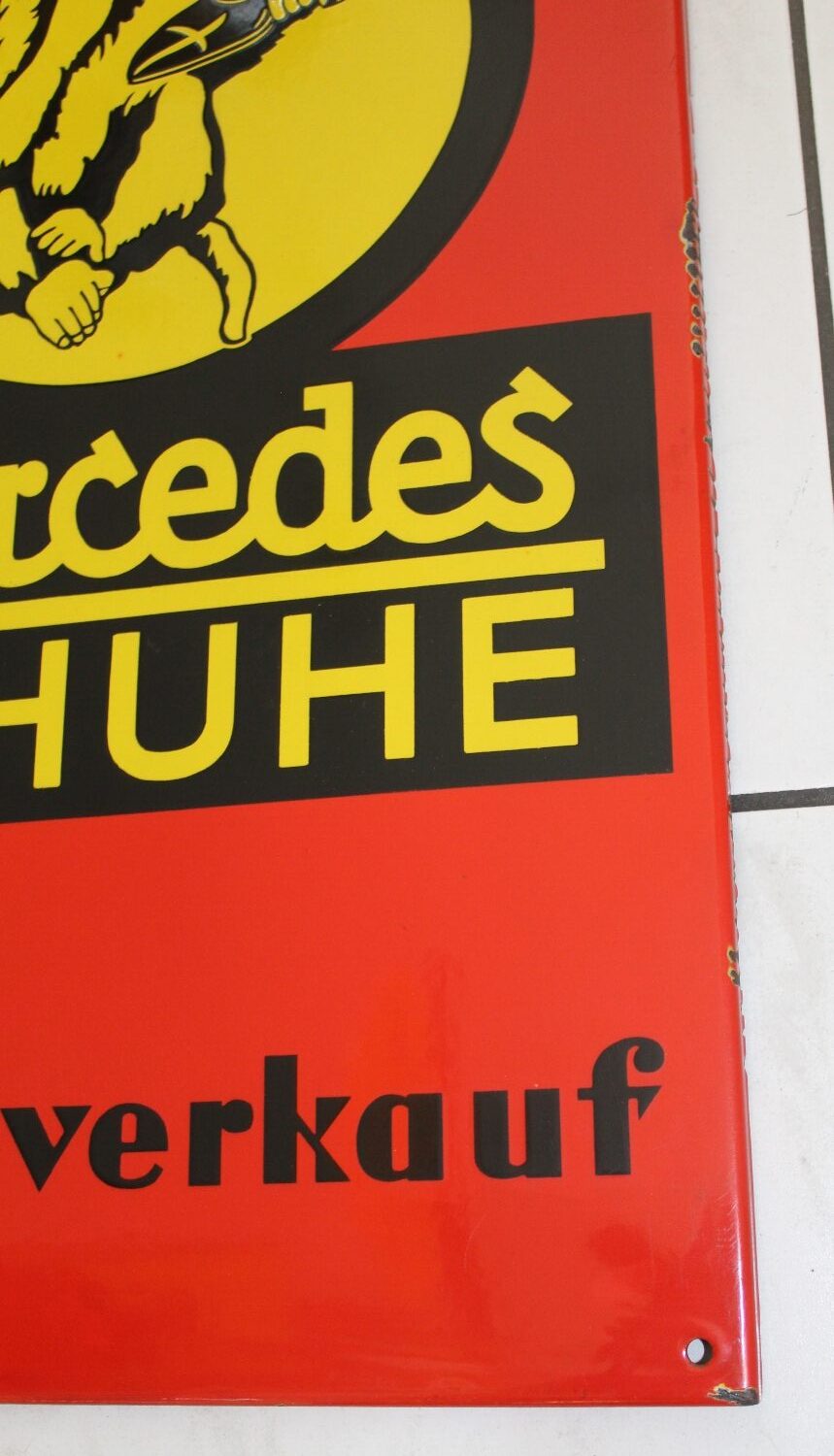 Originales Mercedes Schuhe Alleinverkauf Emailschild aus Deutschland, aus den 50er Jahren, Zustand sehr gut, Emailabplatzer im Randbereich, diverse minime Oberflächenkratzer, Rand abgekantet, schöner Glanz, Breite: 43.5cm, Höhe: 68.5cm.