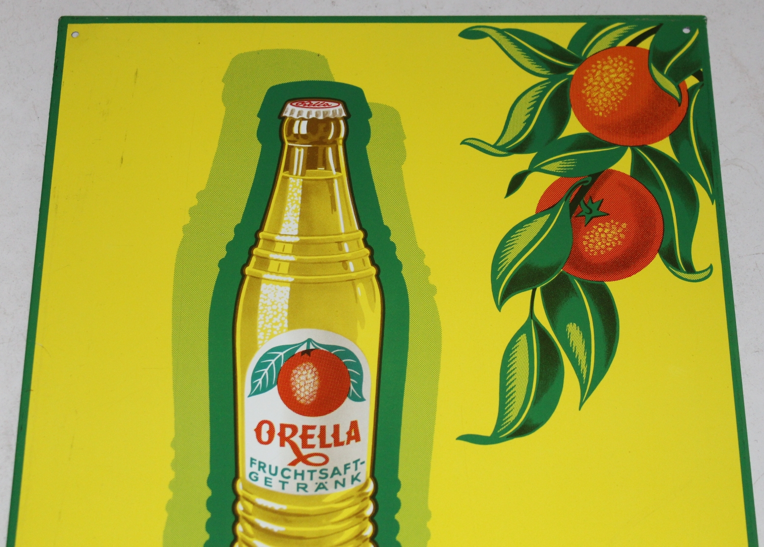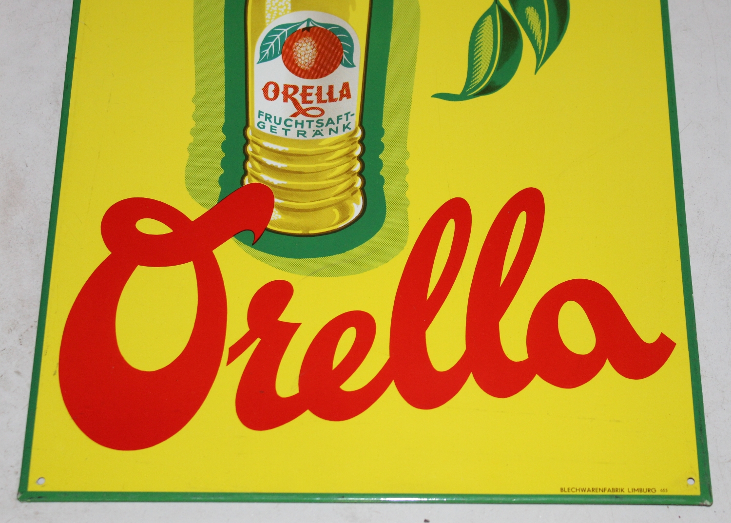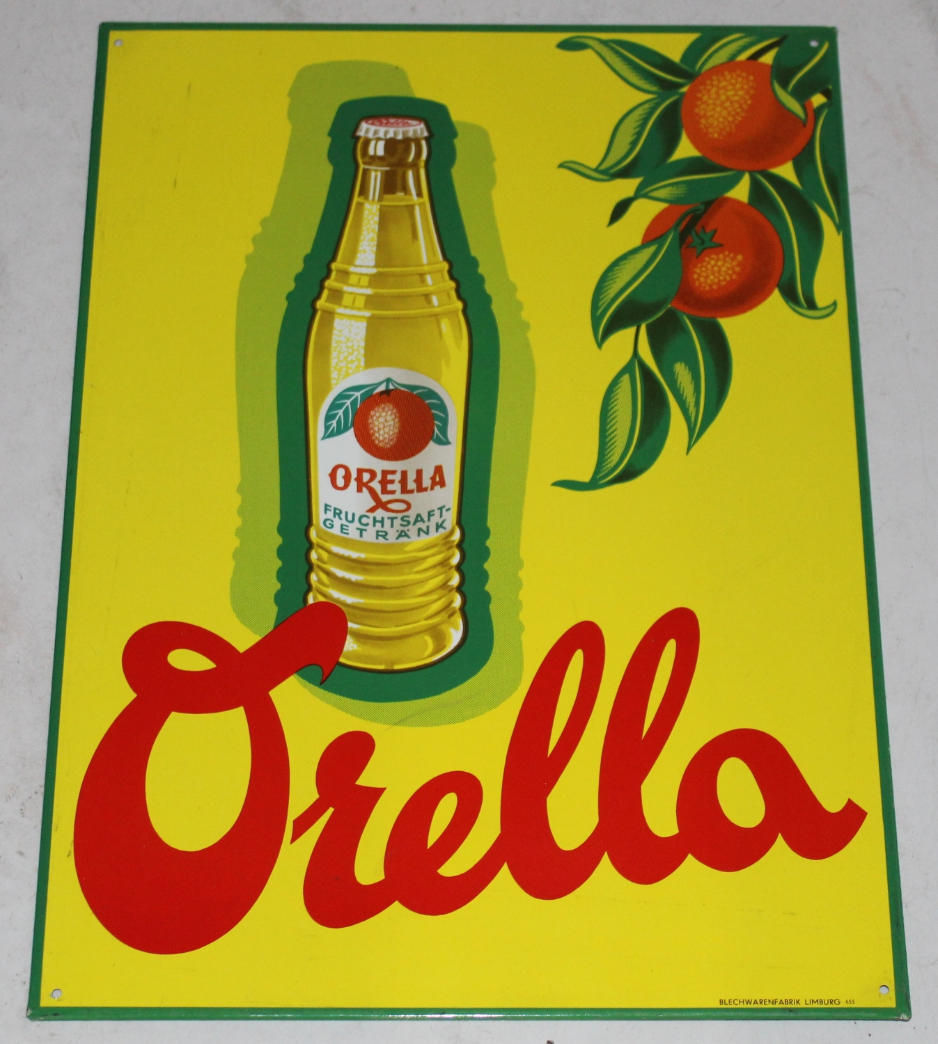 Originales „Orella“ Fruchtsaft-Getränk Blechschild aus den 50er Jahren aus Deutschland, Zustand sehr gut, vermutlich nie gehangen, unten gemarktet mit: „BLECHWARENFABRIK LIMBURG 655“, super Farben und Glanz, Breite: 26.5cm, Höhe: 36.5cm.