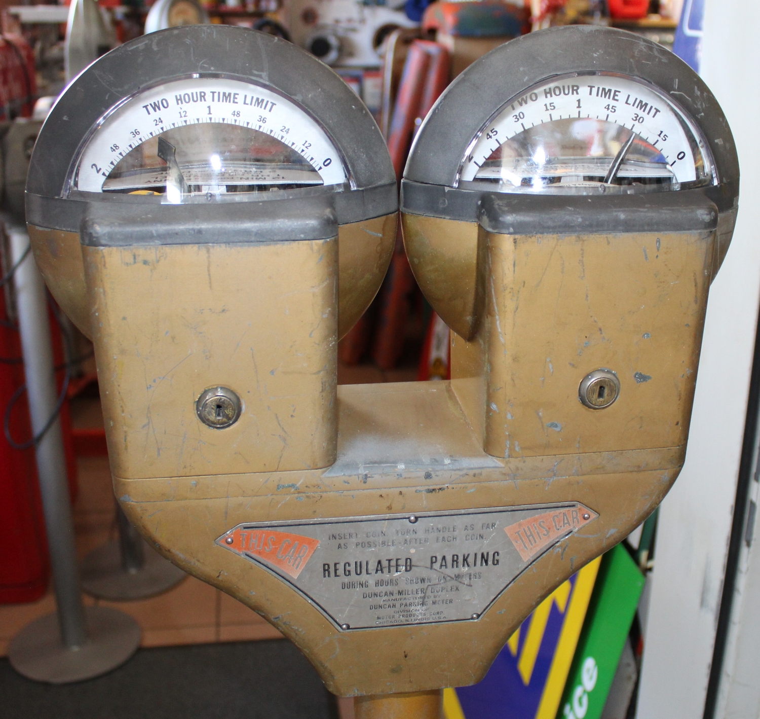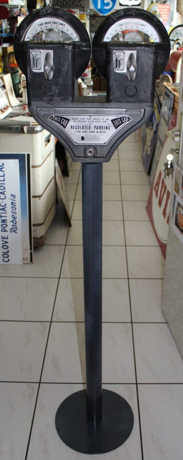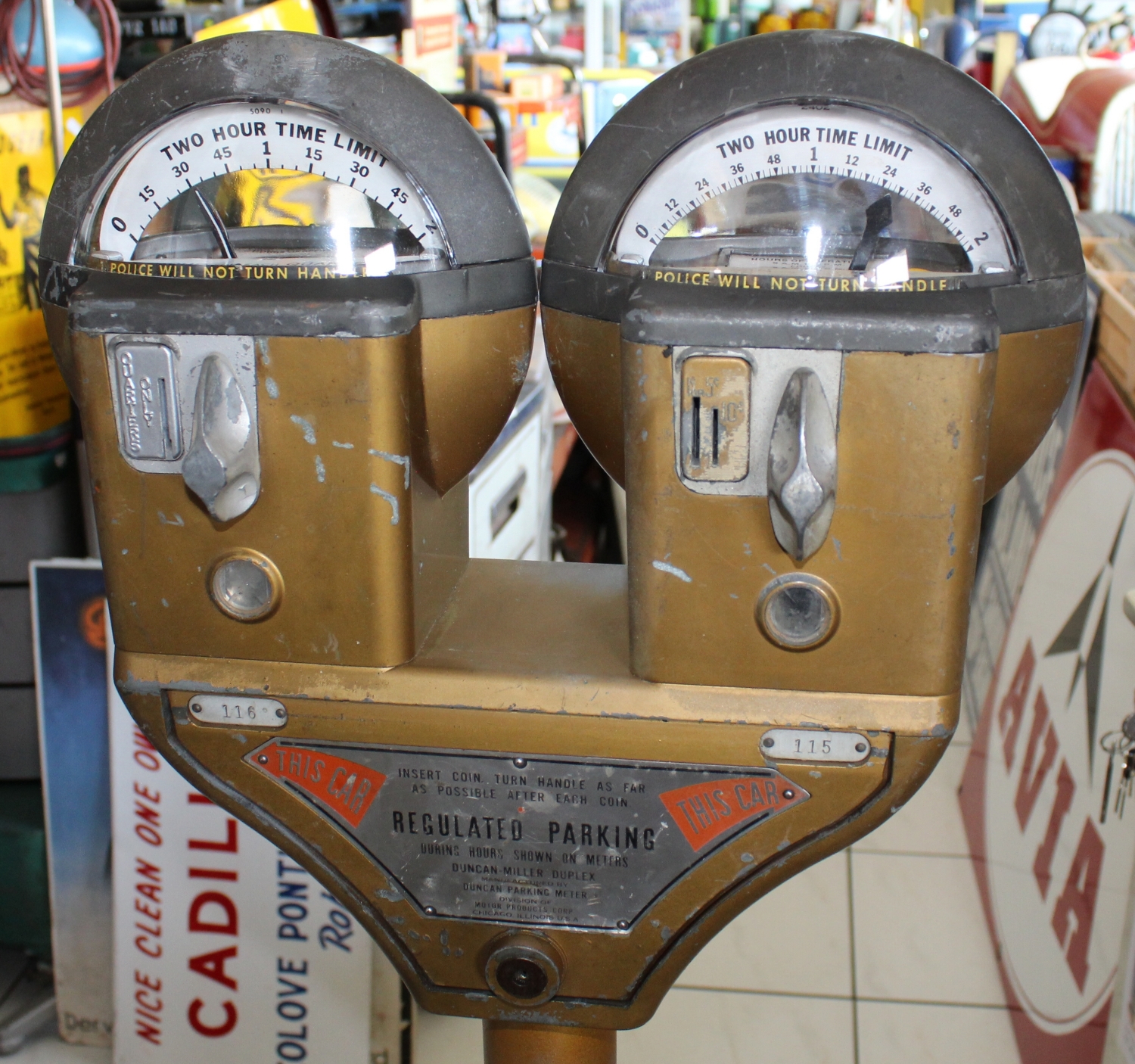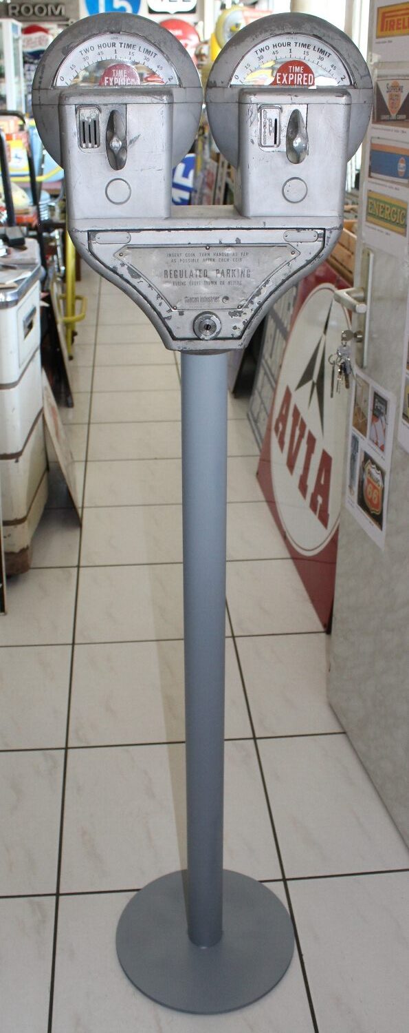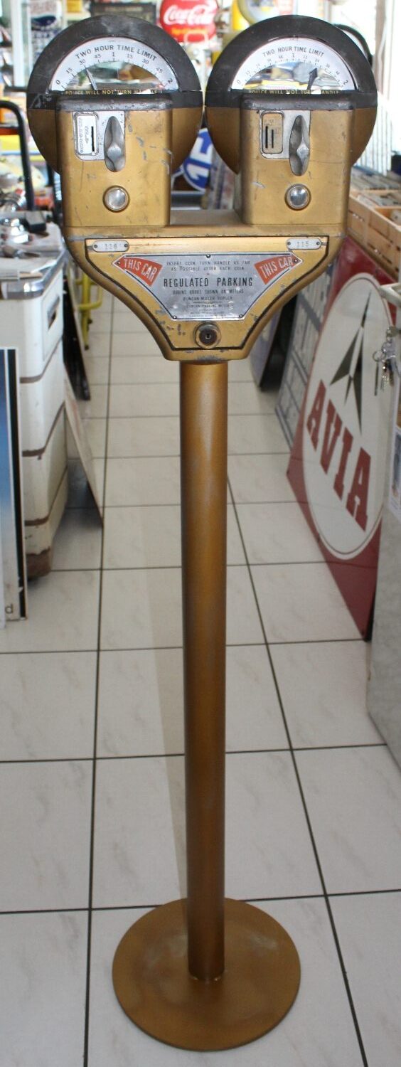 DUNCAN Doppel-Parkuhr Nr.115-116 aus den 50er Jahren aus den USA, neuer Ständer, neue Dome-Plexi-Gläser, Schlüssel fehlen, lässt sich aber mit einem Schraubenzieher öffnen, funktioniert mit US-Münzen, Höhe mit Ständer: 139cm.