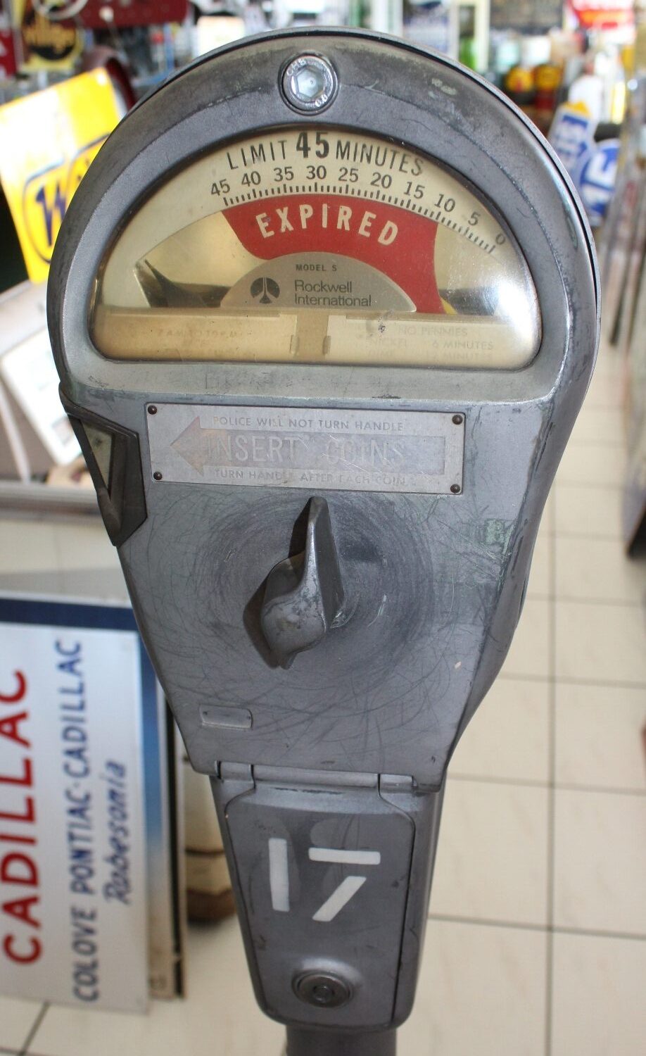 ROCKWELL Parkuhr Nr.17 aus den 60er Jahren aus den USA, neuer Ständer, Schlüssel fehlen, lässt sich aber öffnen, Kassenbehälter fehlt, funktioniert mit US-Münzen, Höhe mit Ständer: 144cm.
