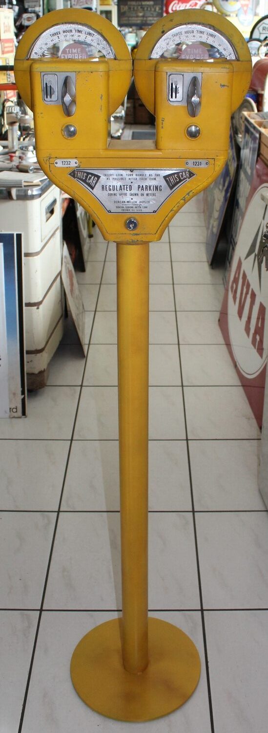 DUNCAN Doppel-Parkuhr Nr.92-94 aus den 50er Jahren aus den USA, neuer Ständer, neue Dome-Plexi-Gläser, Schlüssel fehlen, lässt sich aber mit einem Schraubenzieher öffnen, funktioniert mit US-Münzen, Höhe mit Ständer: 139cm.