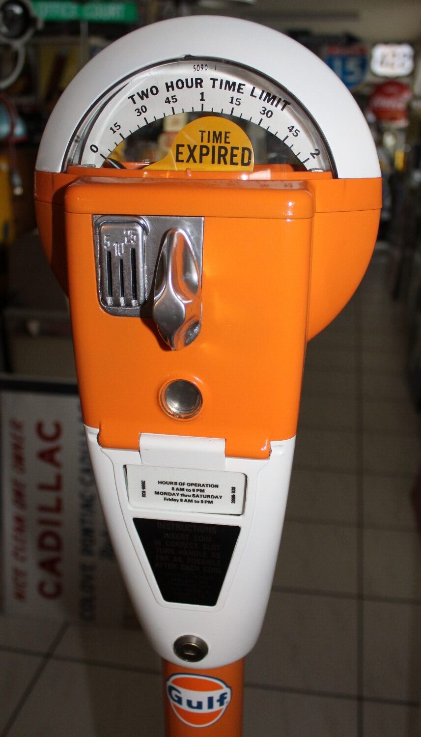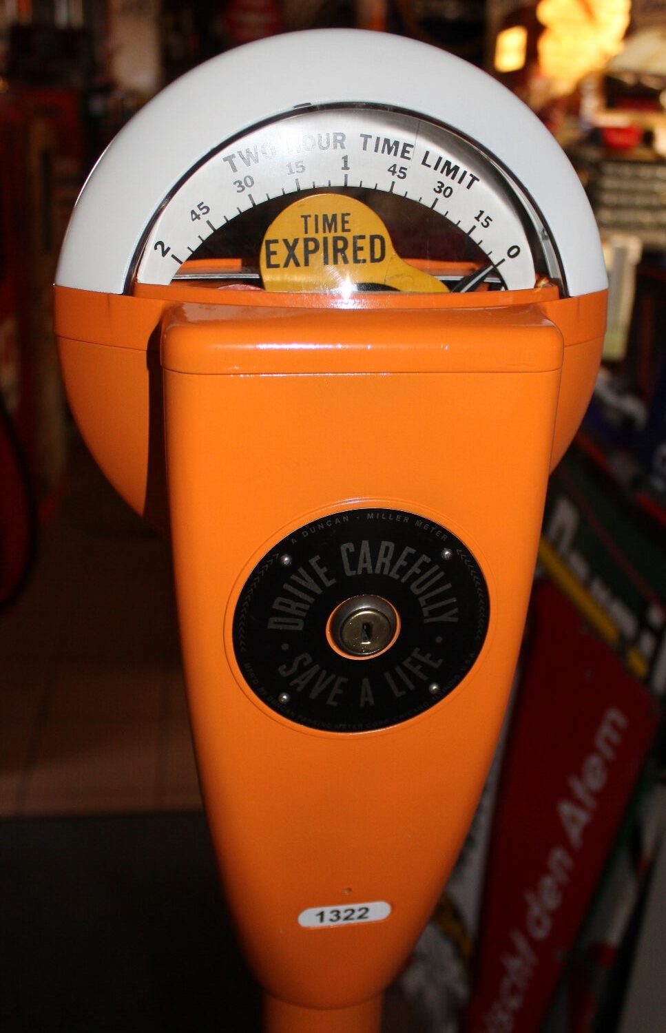 Gulf DUNCAN Parkuhr Nr.1322 aus den 50er Jahren aus den USA, neue Spraydosen-Lackierung, neuer Ständer, neue Schilder, neue Dome-Plexi-Gläser, Aufkleber neu, Schlüssel fehlen, lässt sich aber mit einem Schraubenzieher öffnen, funktioniert mit US-Münzen, Höhe mit Ständer: 140cm.