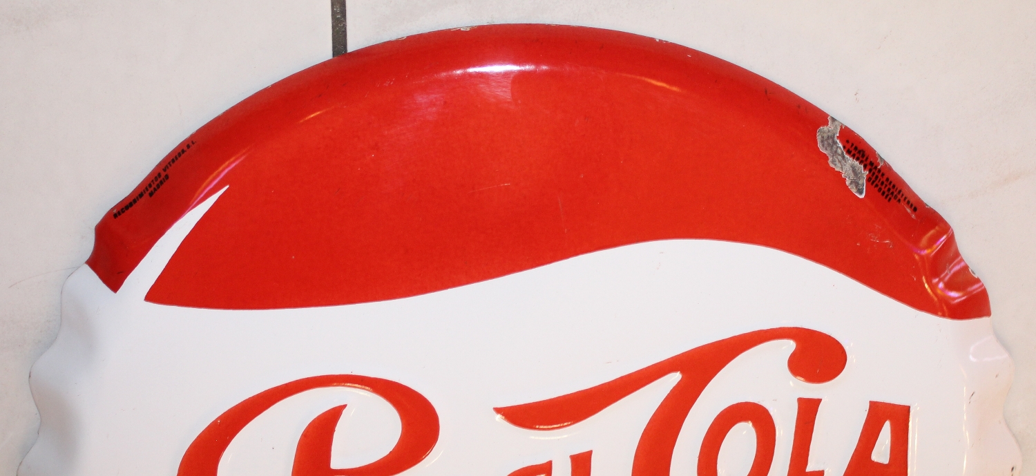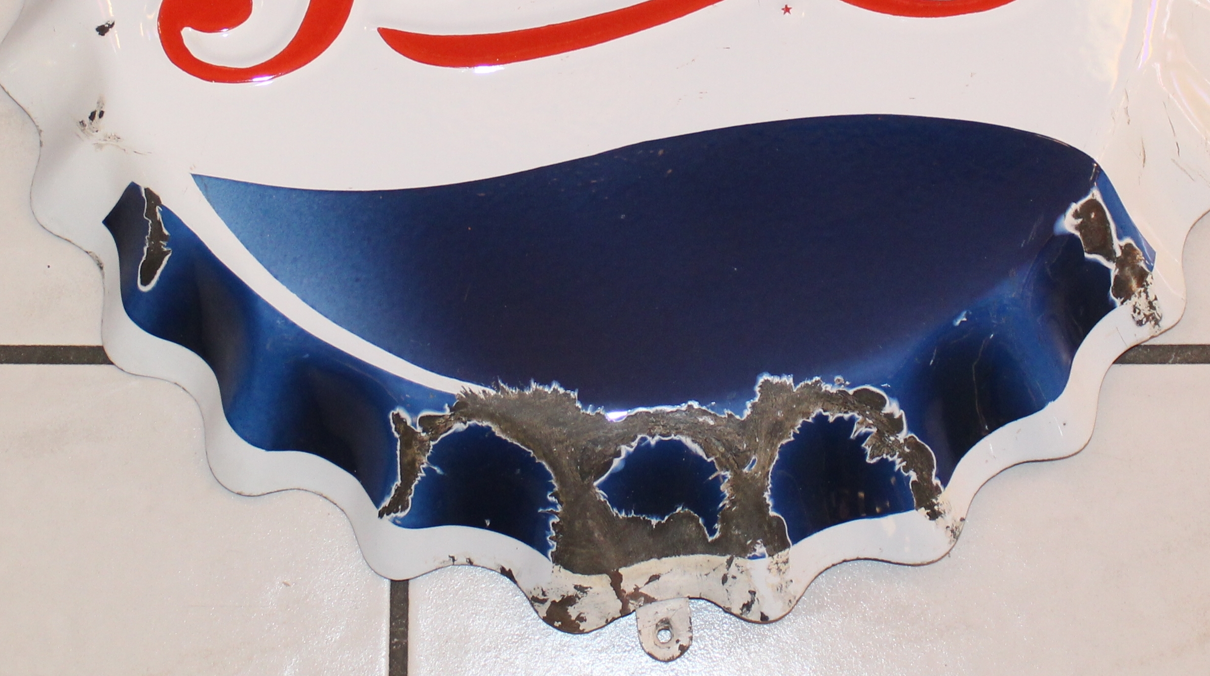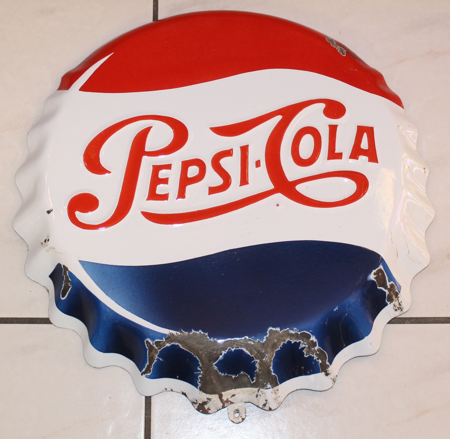 Originaler Pepsi Cola Kronkorken Emailschild aus den 50er Jahren aus Spanien, oben lnks gemarktet mit: „RECRUBIMIENTOS VITREOS S.L. MADRID“, Zustand gebraucht, grössere Abplatzer im unteren Bereich, Durchmesser: 47.5cm.