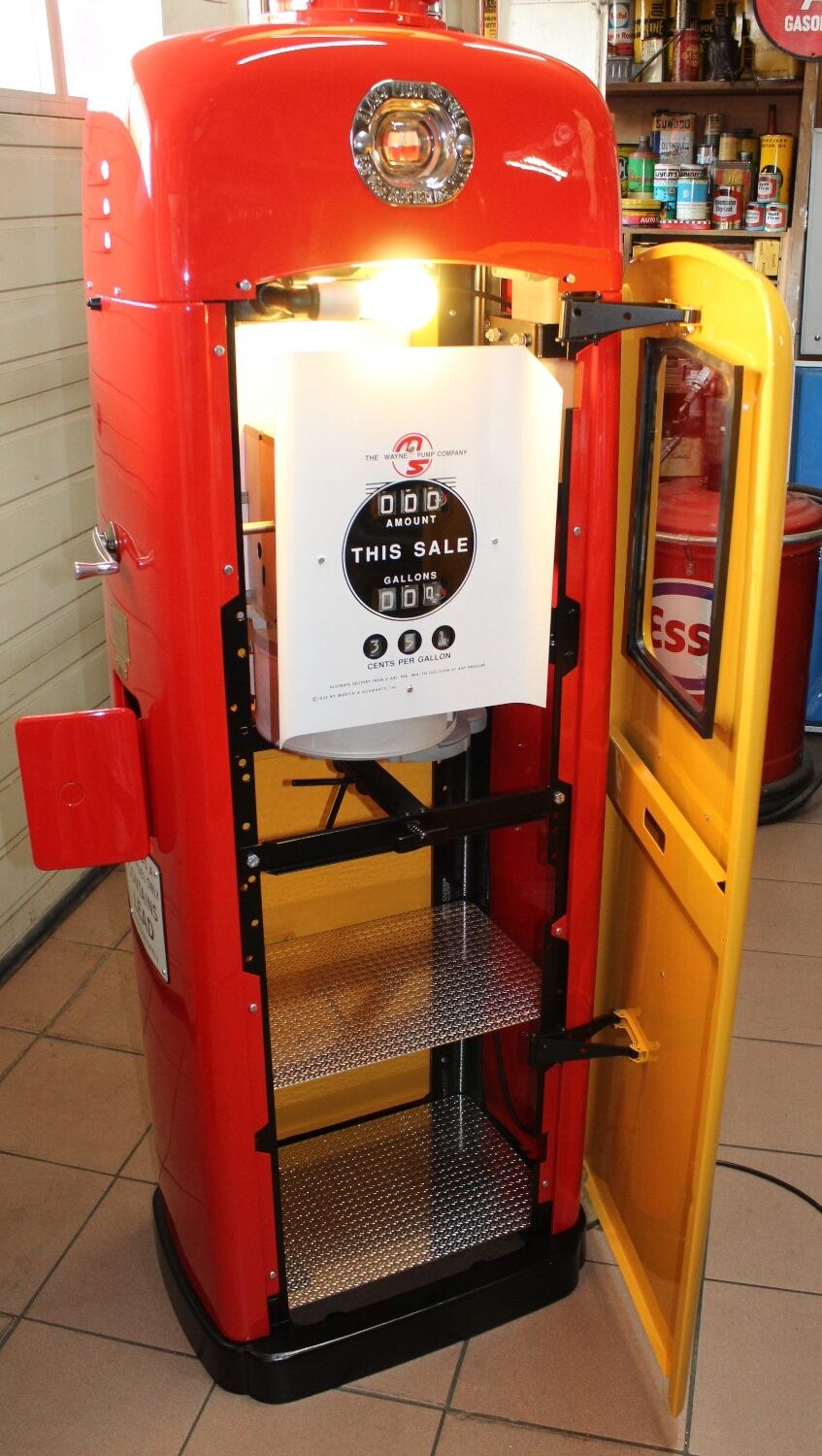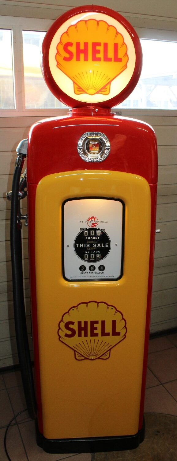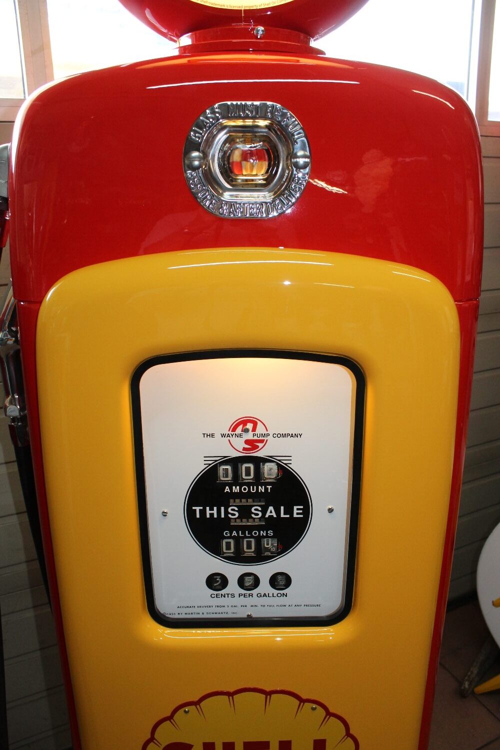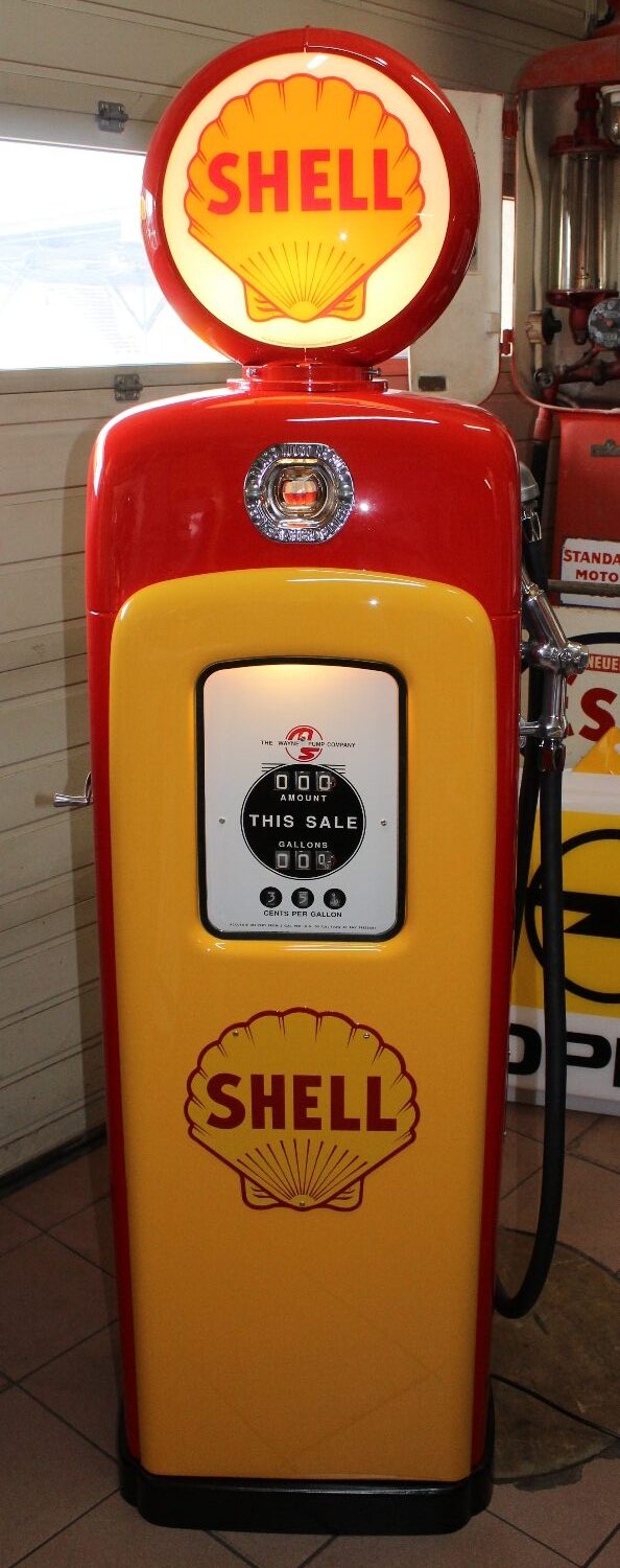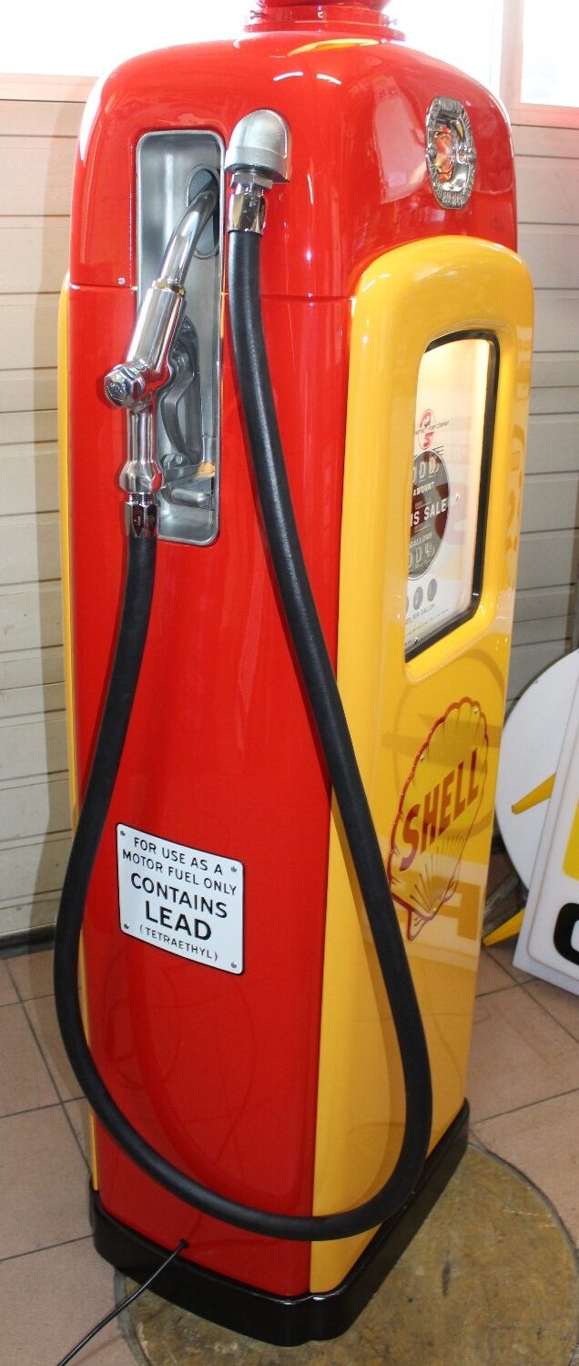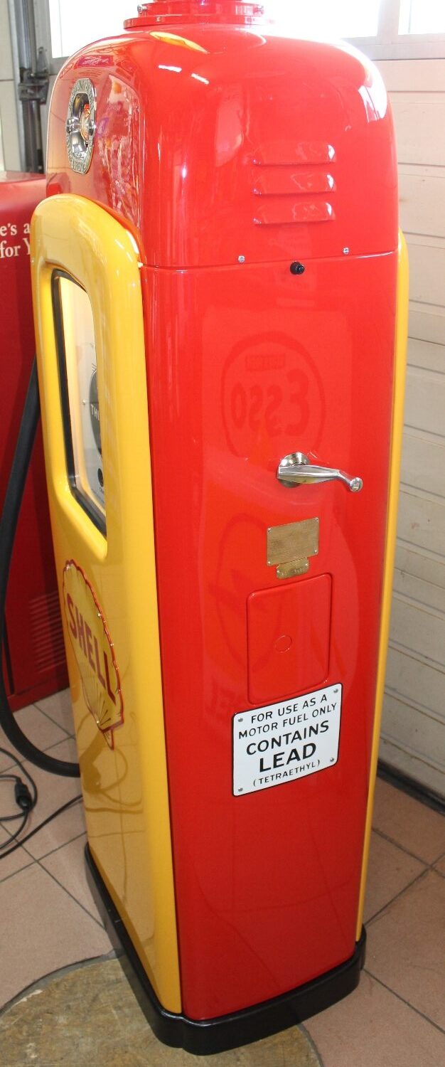 Originale restaurierte Shell M&S 80 Tanksäule aus den USA von 1946, die Tanksäule wurde komplett zerlegt, sandgestrahlt, der Rahmen wurde pulverbeschichtet, die Bleche wurden in den Shell Farben lackiert, Beleuchtung 230V wurde neu installiert, die Türen lassen sich öffnen, im Innern hat es zwei Tablare, diverse Neuteile wie Globe, Schilder, Scheiben, Dichtungen, Kurbel, Faces, Zapfahn und Schlauch, Höhe mit Globe: 202cm.