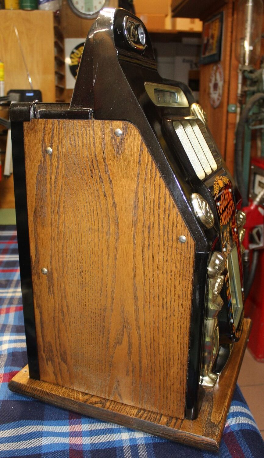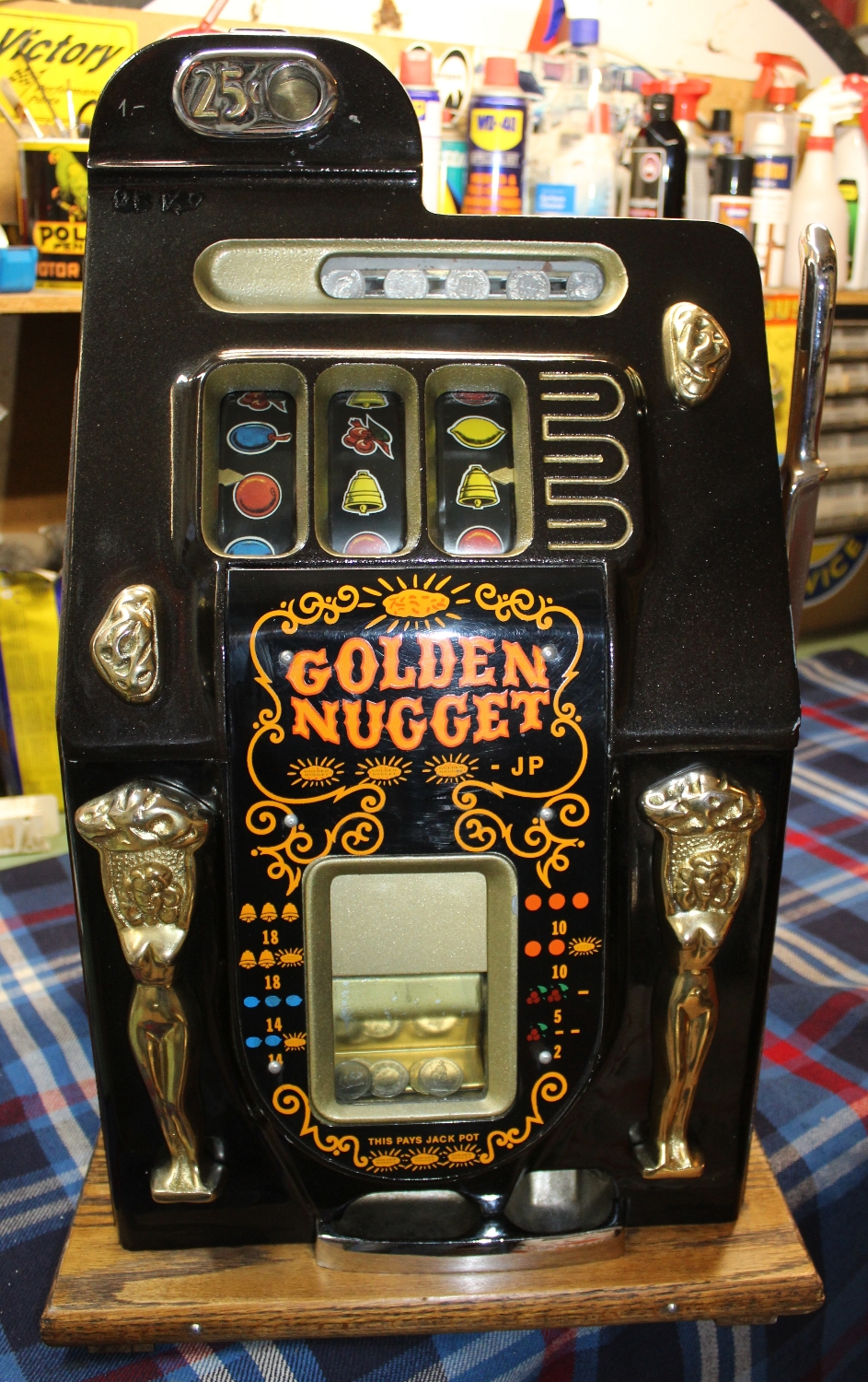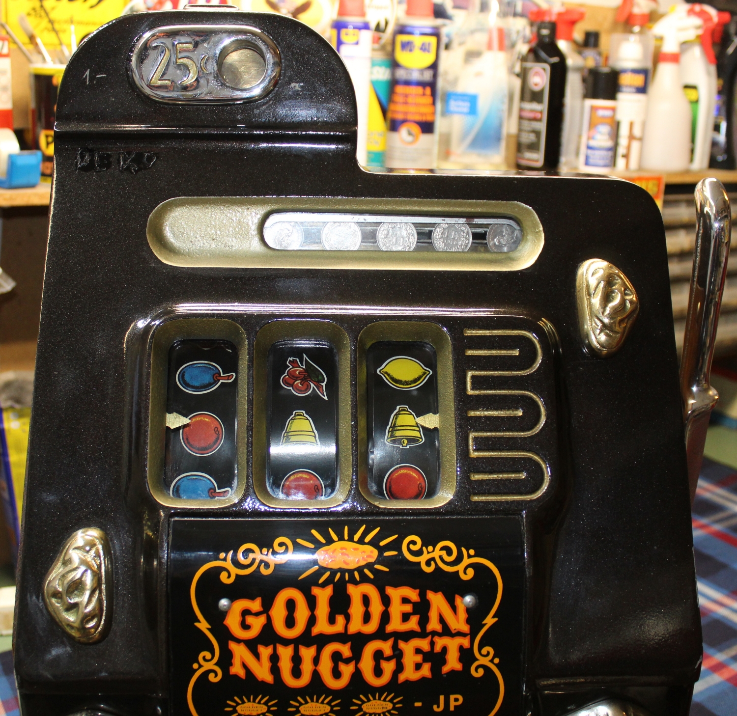 „GOLDEN NUGGET“ Slotmachine Einarmiger Bandit aus den USA, Reproduction aus den 90er Jahren, Zustand sehr gut, funktioniert einwandfrei mit „1.-sFr.“, minime Lackschäden, oben beim Einwurf hat jemand „1.-“ und „DEKO“ reingekratzt, stand in einem Restaurant, Schloss auf der Rückseite wurde in der Zwischenzeit durch eine neues ersetzt.
