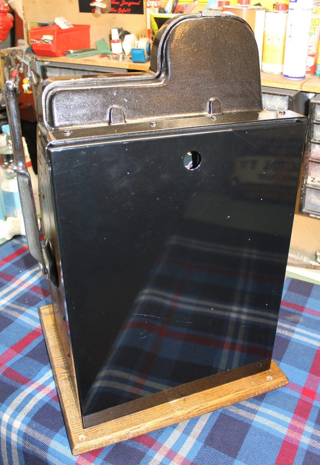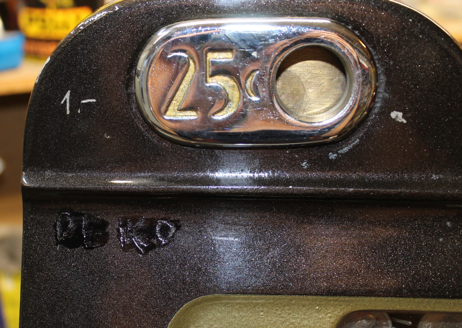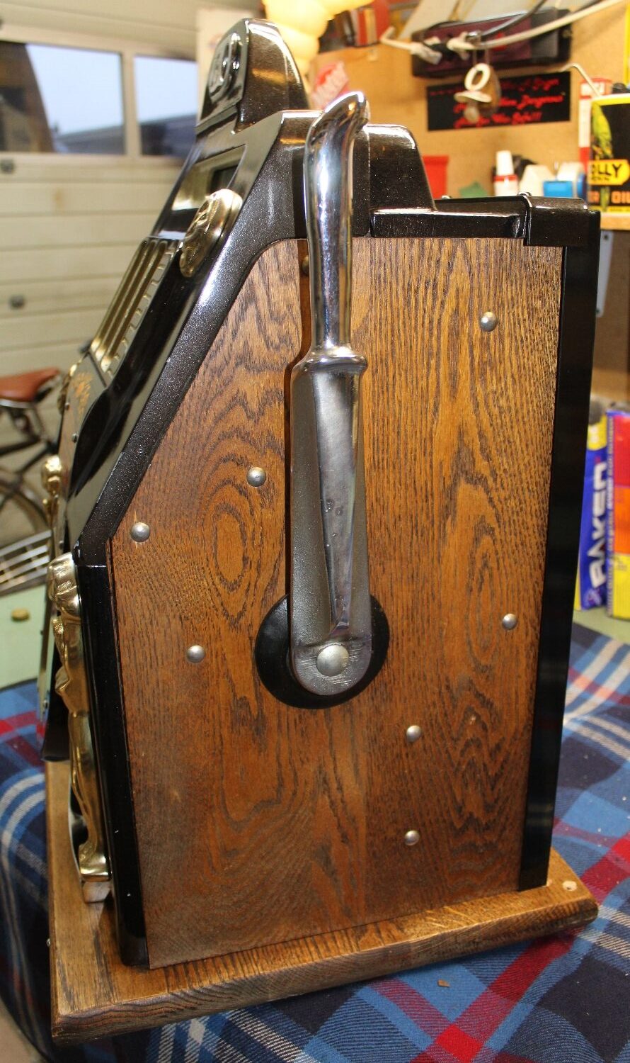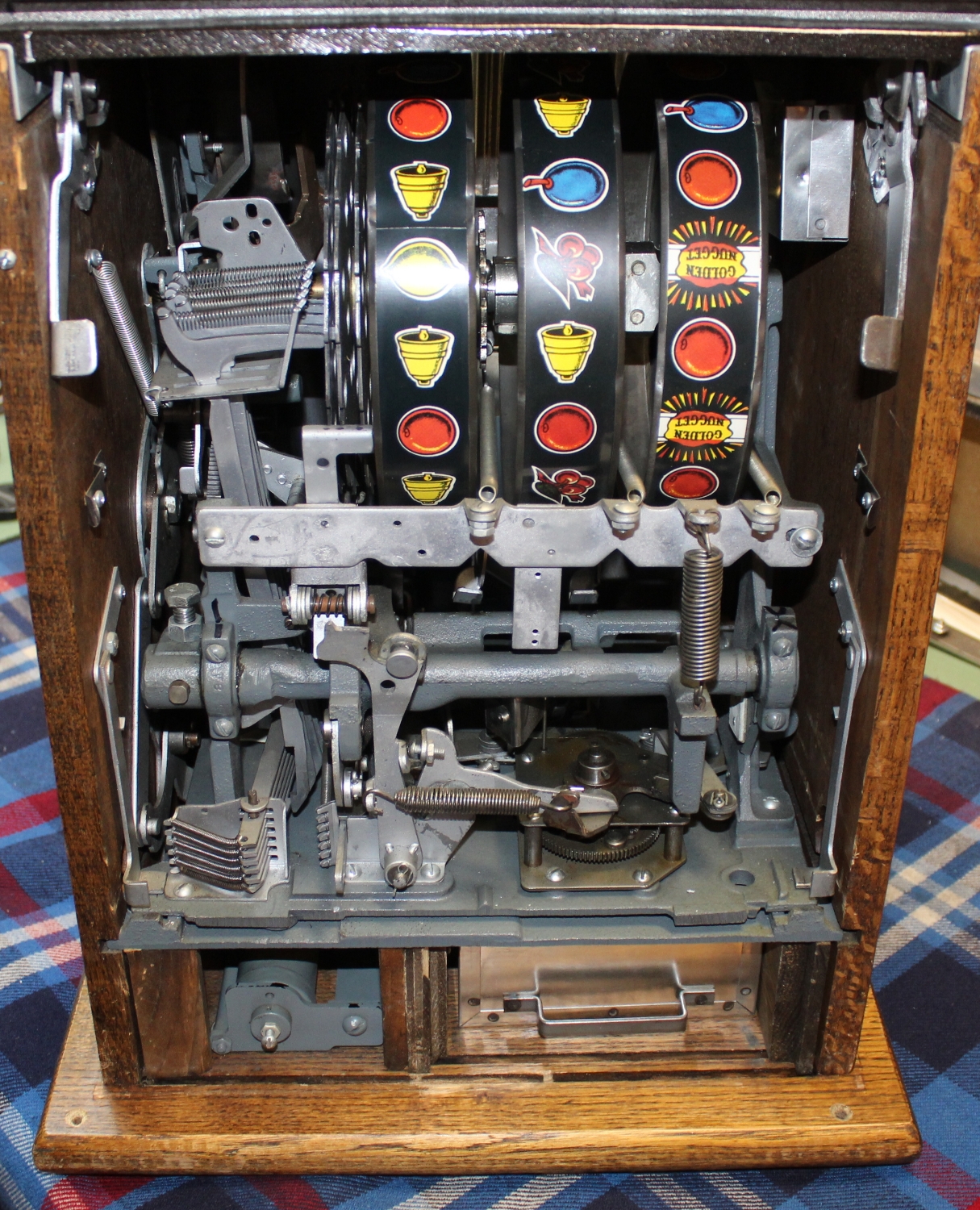 „GOLDEN NUGGET“ Slotmachine Einarmiger Bandit aus den USA, Reproduction aus den 90er Jahren, Zustand sehr gut, funktioniert einwandfrei mit „1.-sFr.“, minime Lackschäden, oben beim Einwurf hat jemand „1.-“ und „DEKO“ reingekratzt, stand in einem Restaurant, Schloss auf der Rückseite wurde in der Zwischenzeit durch eine neues ersetzt.