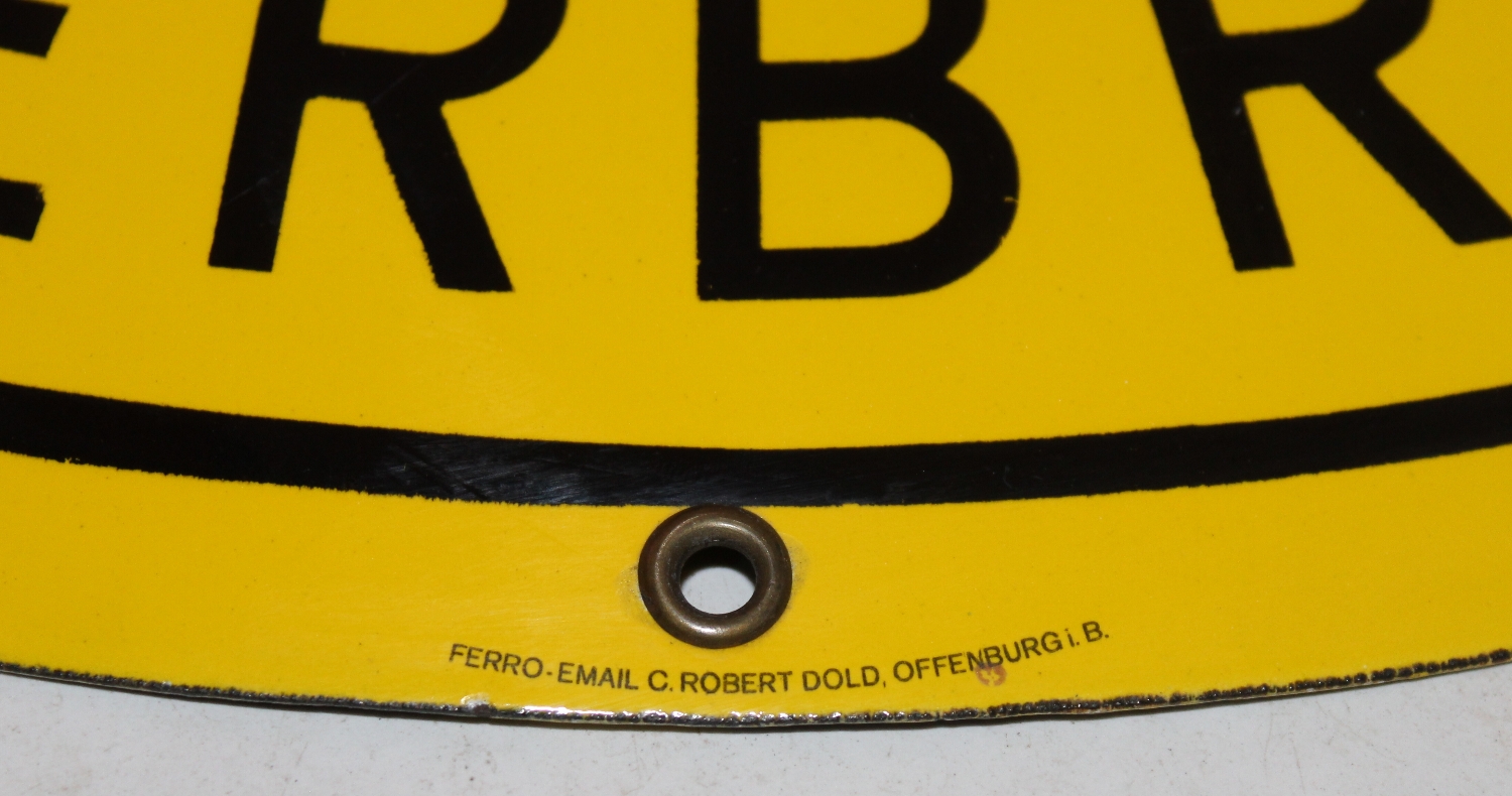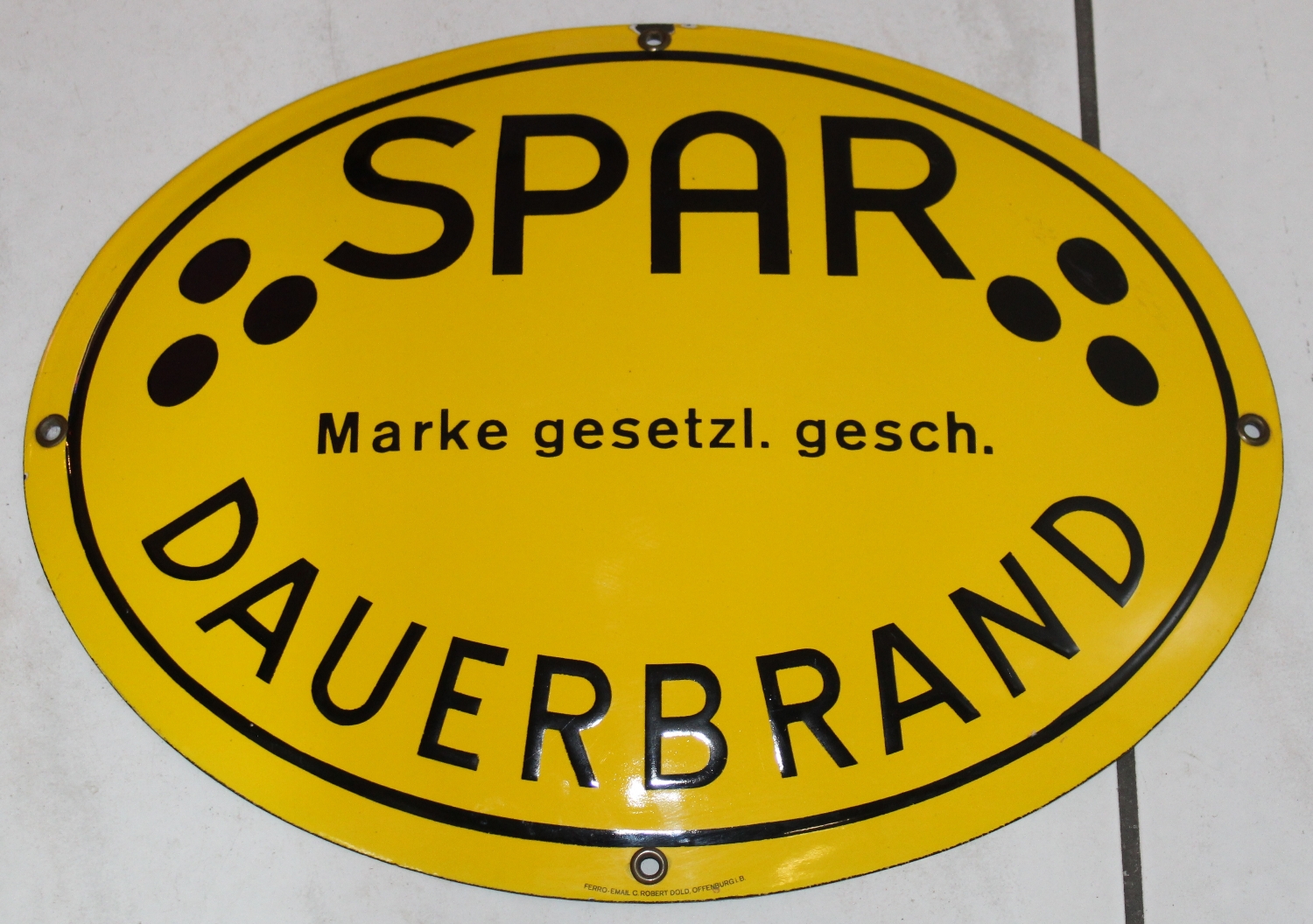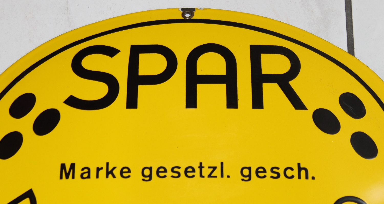 Originales SPAR Dauerbrand Emailschild aus Deutschland, ca. aus den 50er Jahren, Zustand sehr gut, stark gewölbt, kleiner Emailabplatzer oben bei der Oese, minime Oberflächenkratzer rechts bei den drei Punkten, Breite: 42cm, Höhe: 31.8cm.