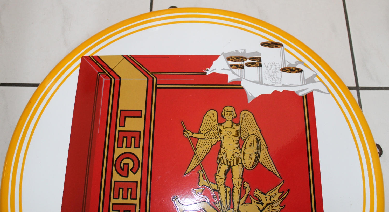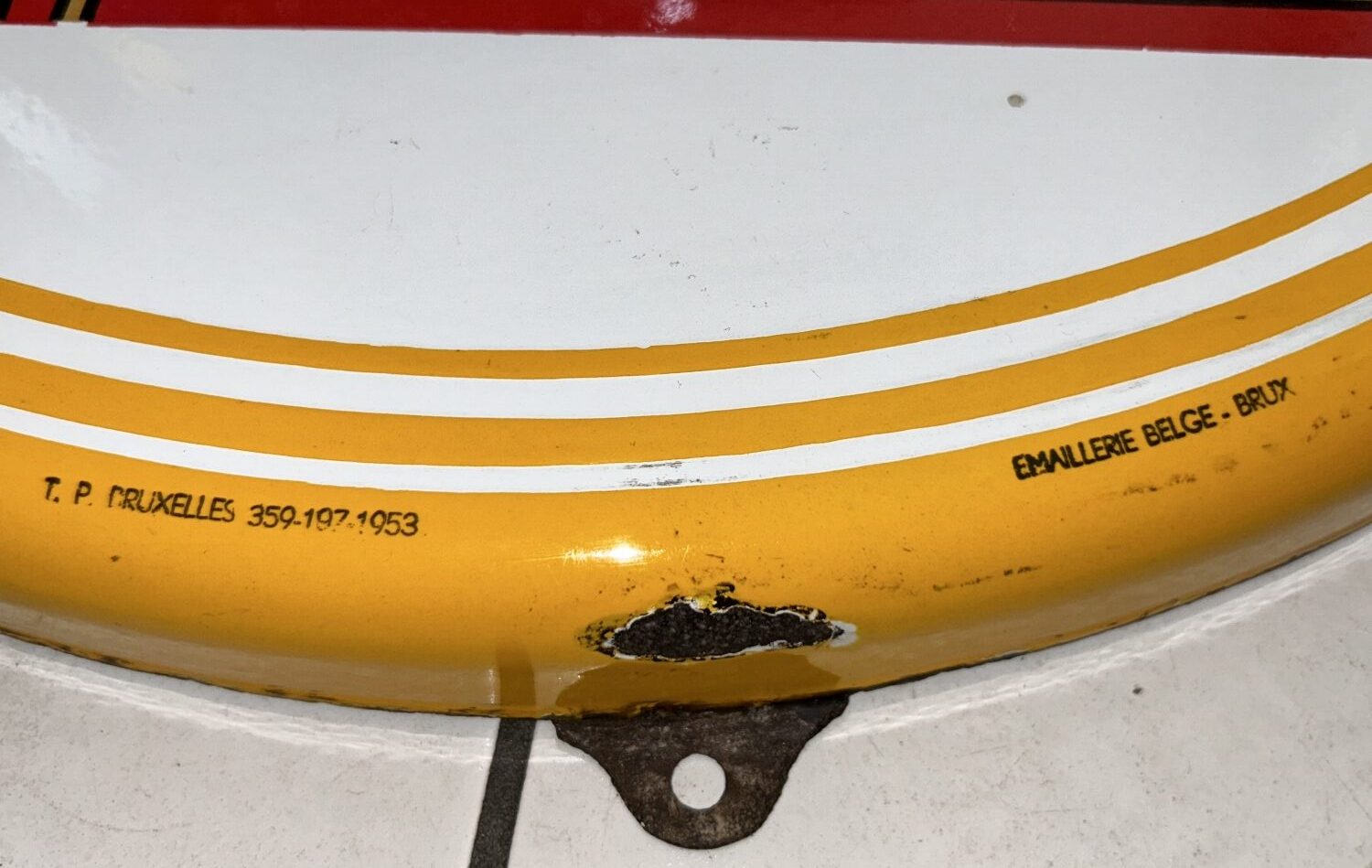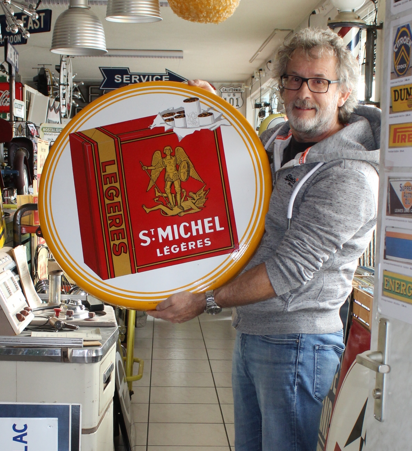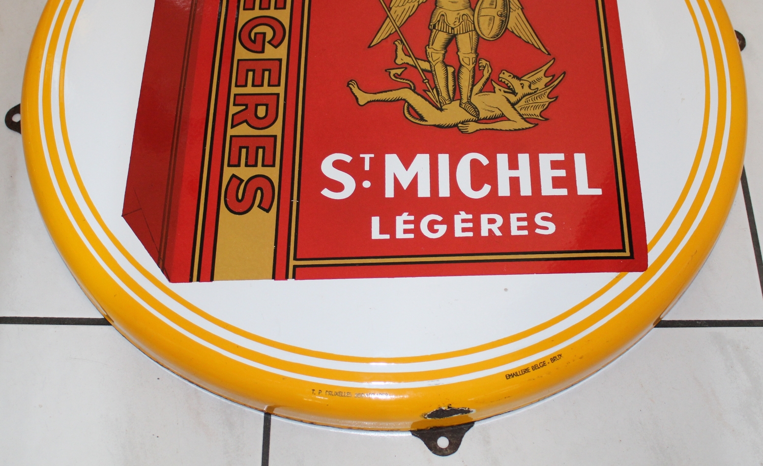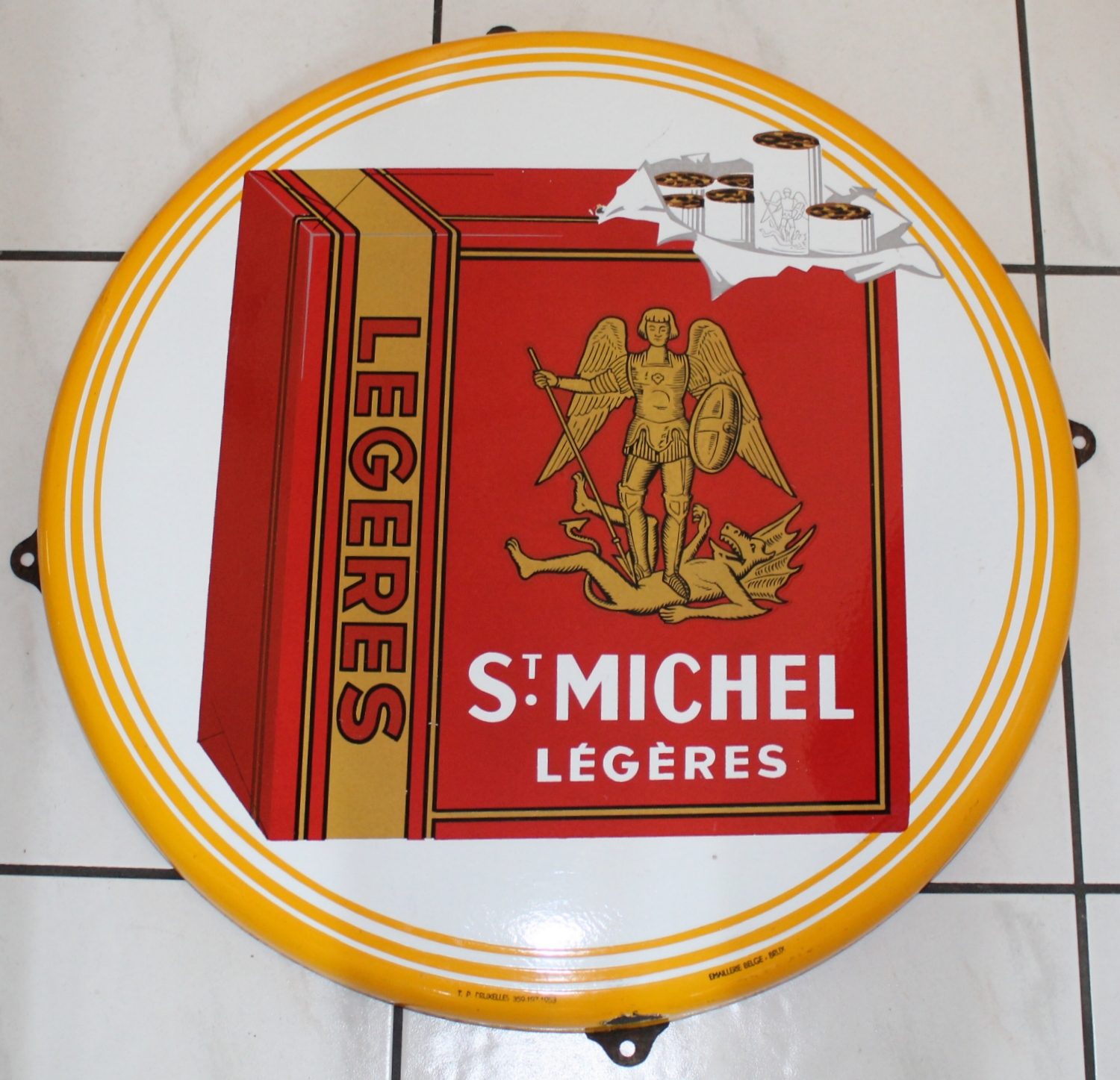 Originales grosses „ST.MICHEL LÉGÉRES“ Cigaretten Emailschild aus Belgien von 1953, Zustand sehr gut, dick emailliert, super Glanz, minime Oberflächenkratzer, unten am Rand einen Emailabplatzer, oben bei den Cigaretten links ein minimer Emailabplatzer, Durchmesser: 65cm, Höhe: 5cm.