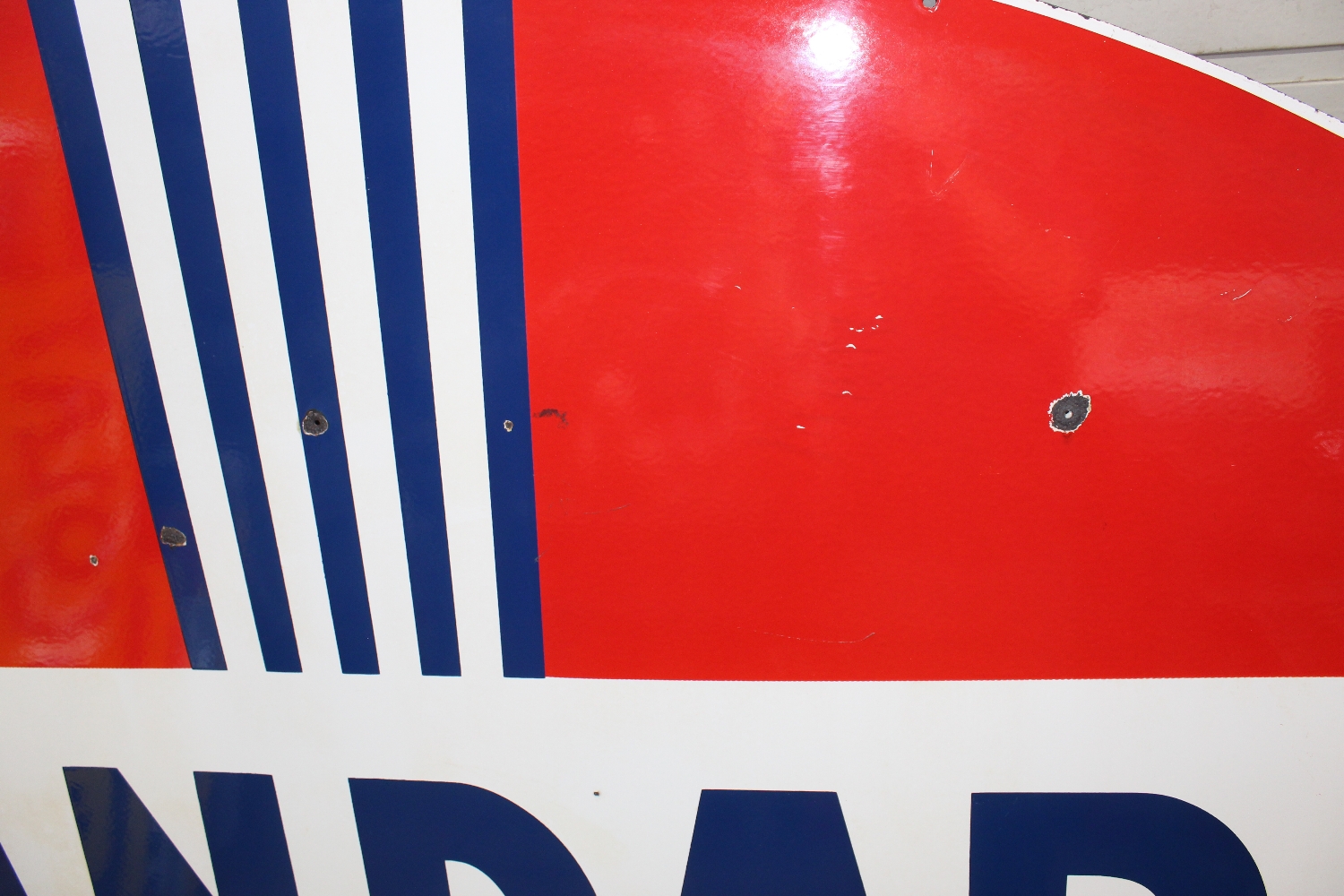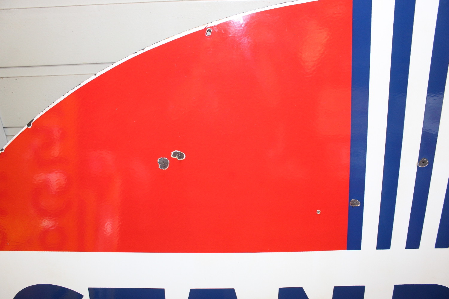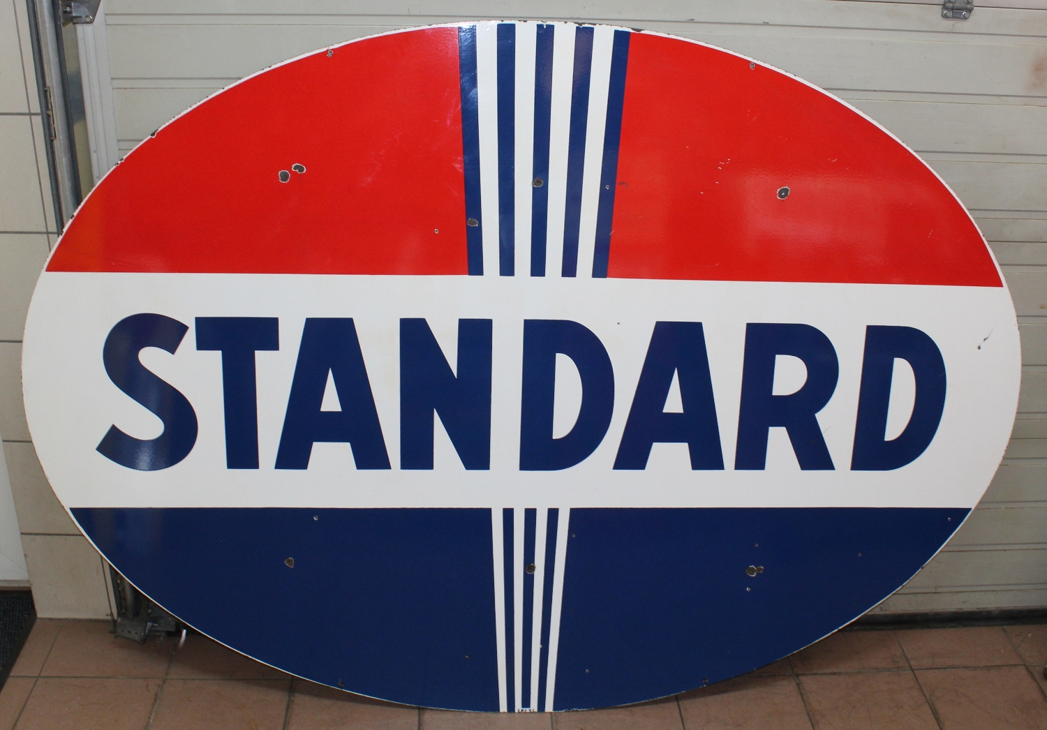 Originales grosses doppelseitiges „STANDARD“ Emailschild von 1955 aus den USA, Zustand sehr gut, super Glanz, minime Emailabplatzer und Oberflächenkratzer, es wurden vor langer Zeit sechs Löcher reingebohrt, gemarktet unten mit: „SPS 55“, Breite: 213cm, Höhe: 152cm.