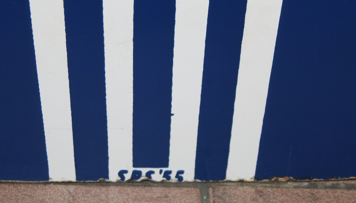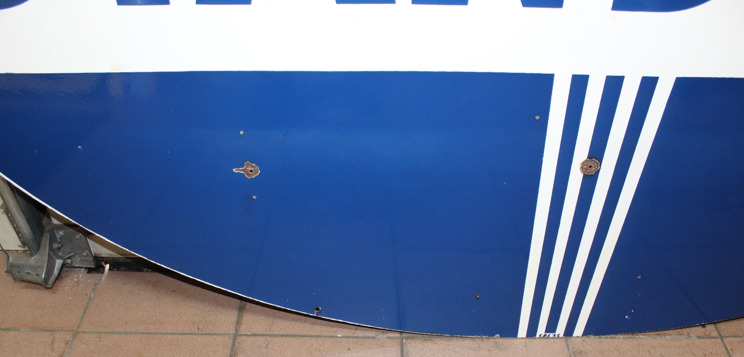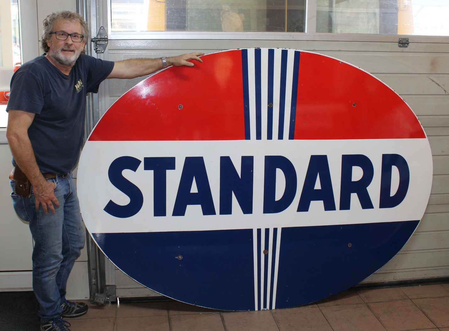 Originales grosses doppelseitiges „STANDARD“ Emailschild von 1955 aus den USA, Zustand sehr gut, super Glanz, minime Emailabplatzer und Oberflächenkratzer, es wurden vor langer Zeit sechs Löcher reingebohrt, gemarktet unten mit: „SPS 55“, Breite: 213cm, Höhe: 152cm.