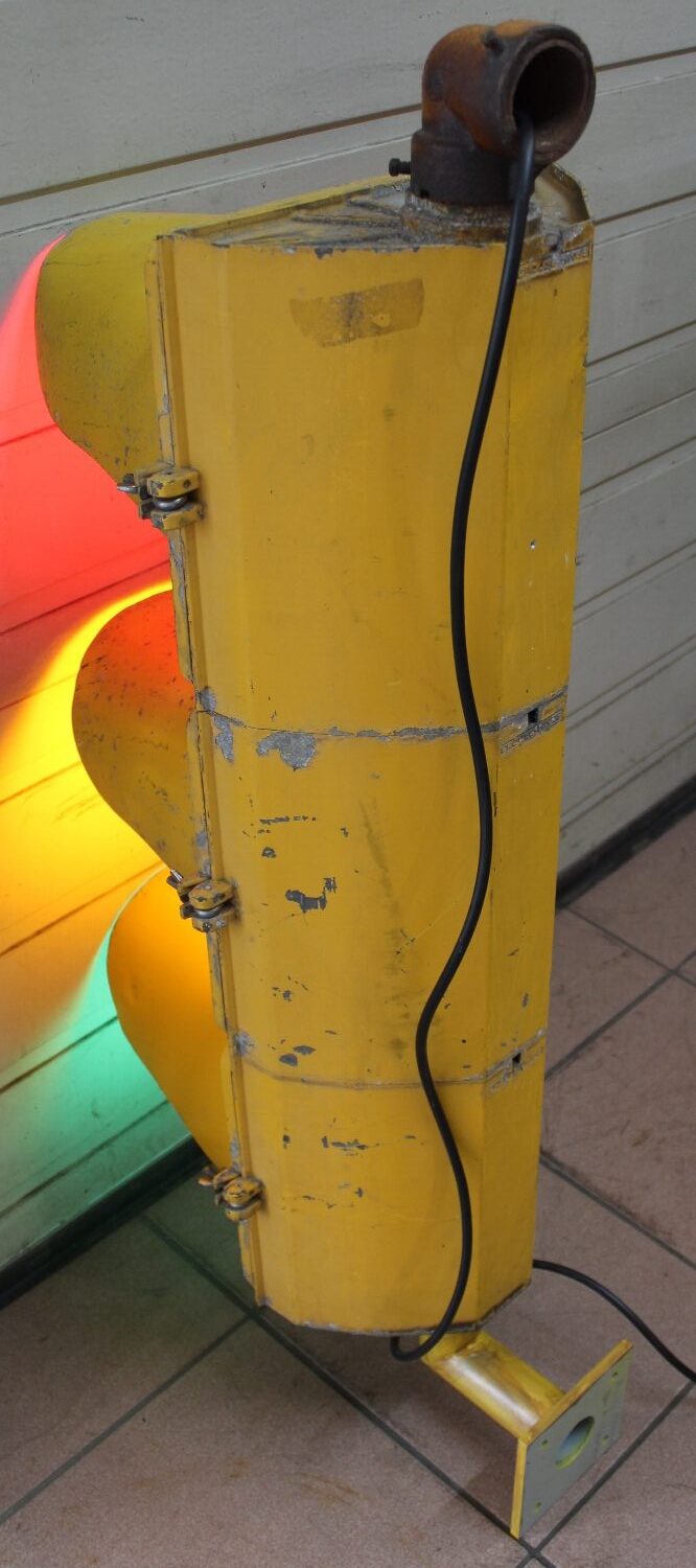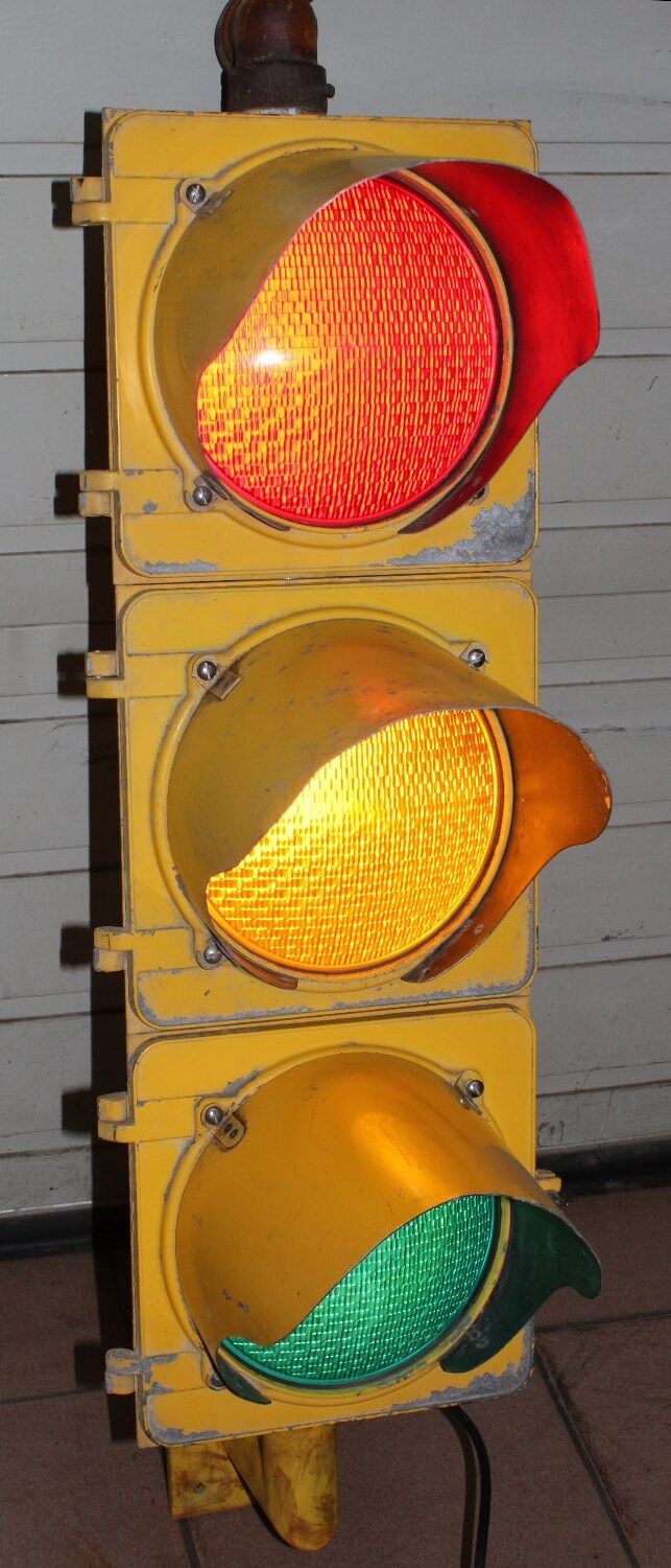 Originale Strassenampel „Crouse Hinds“ aus den USA, ca. aus den 50er Jahren, Zustand sehr gut, es wurde ein neues Kabel eingezogen und die Glühbirnen gegen LED-Birnen ausgewechselt, die Wandhalterung wurde extra für diese Ampel angefertigt, Höhe Ampel: 77cm, Gesamthöhe: 100cm.
