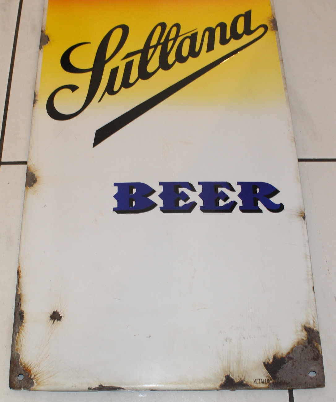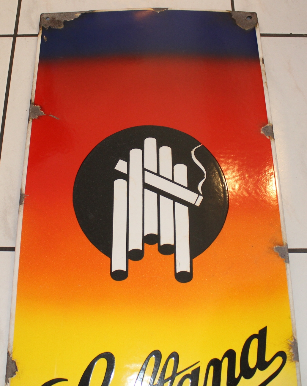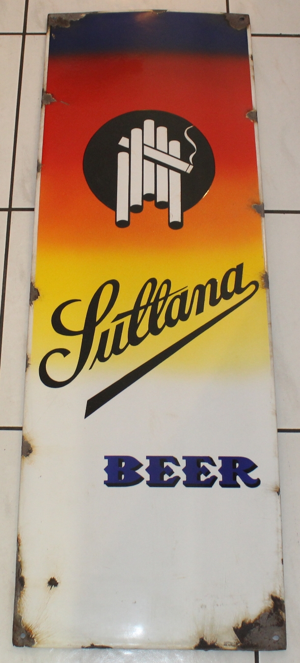 Originales Sullana Beer Cigarettes Emailschild aus der Schweiz, ca. aus den 40er Jahren, Zustand stark gebraucht, Rand abgekantet, Breite: 40.5cm, Höhe: 120.5cm.