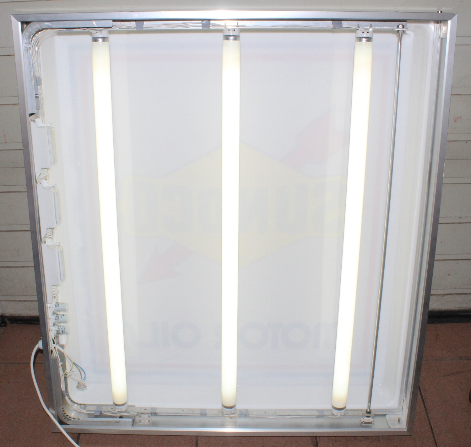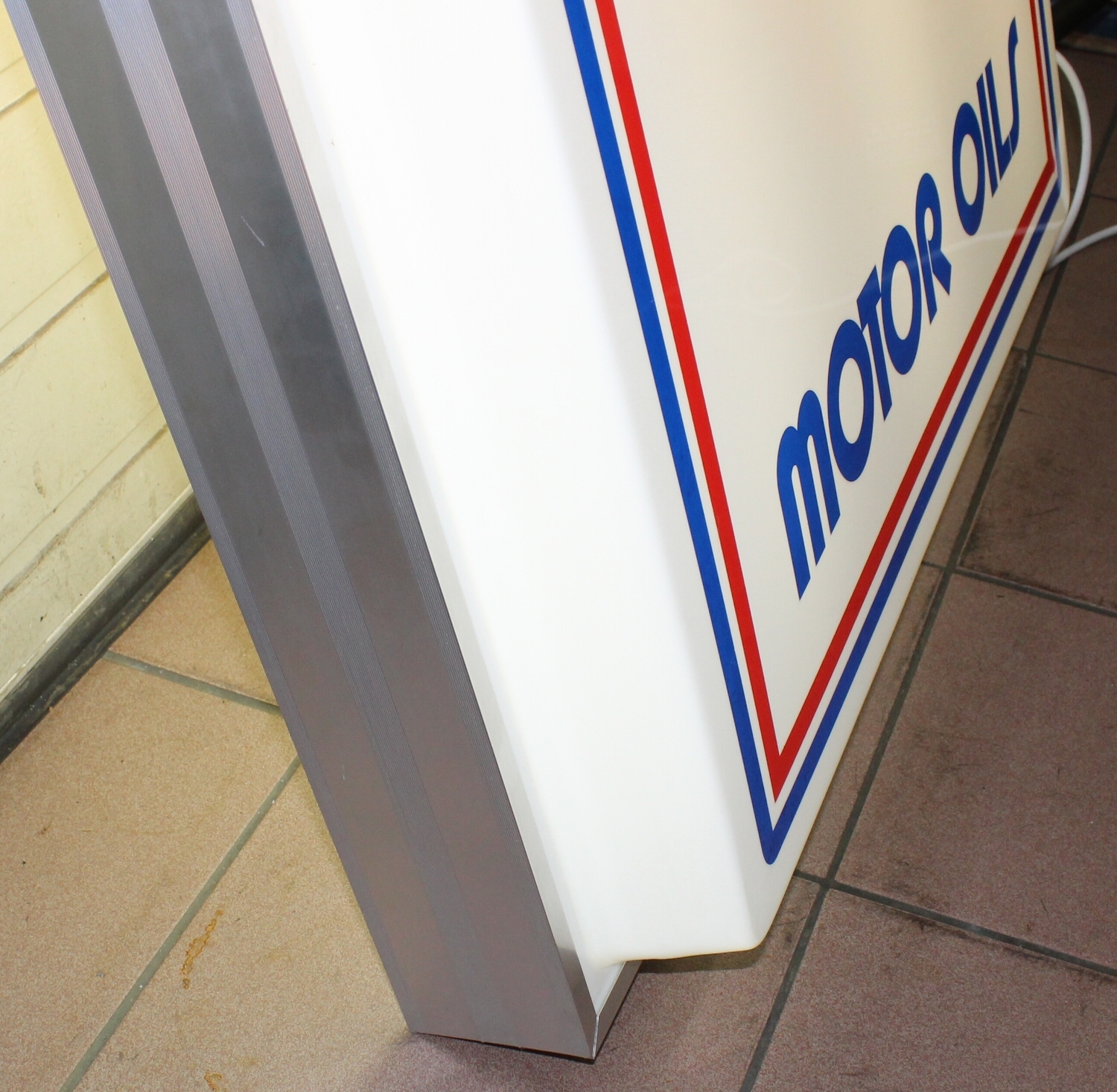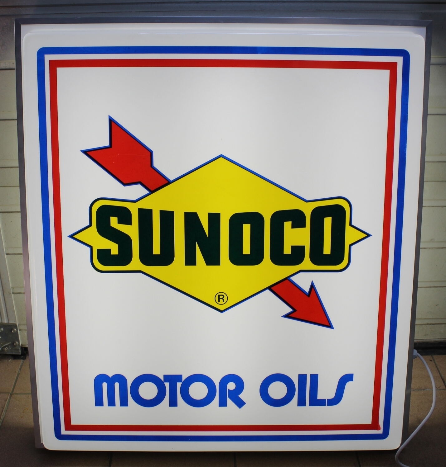 Originale Sunoco Motor Oils Leuchtreklame aus der Schweiz, ca. aus den 80er oder 90er Jahren, Zustand wie neu , Beleuchtung funktioniert mit 230V, Rückseite fehlt, somit kann sie flach an die Wand montiert werden, Breite: 90cm, Höhe: 100cm, Tiefe: 18cm.
