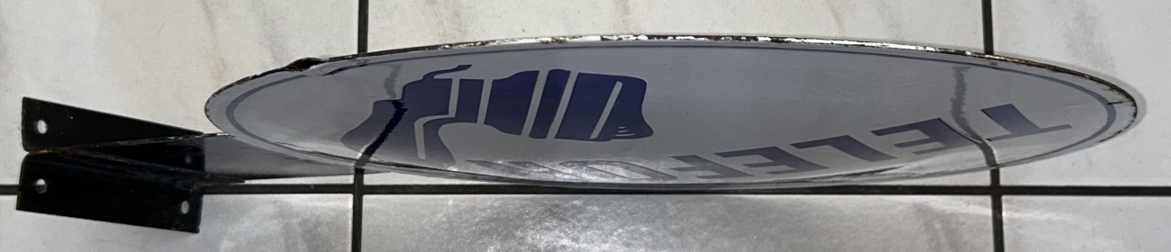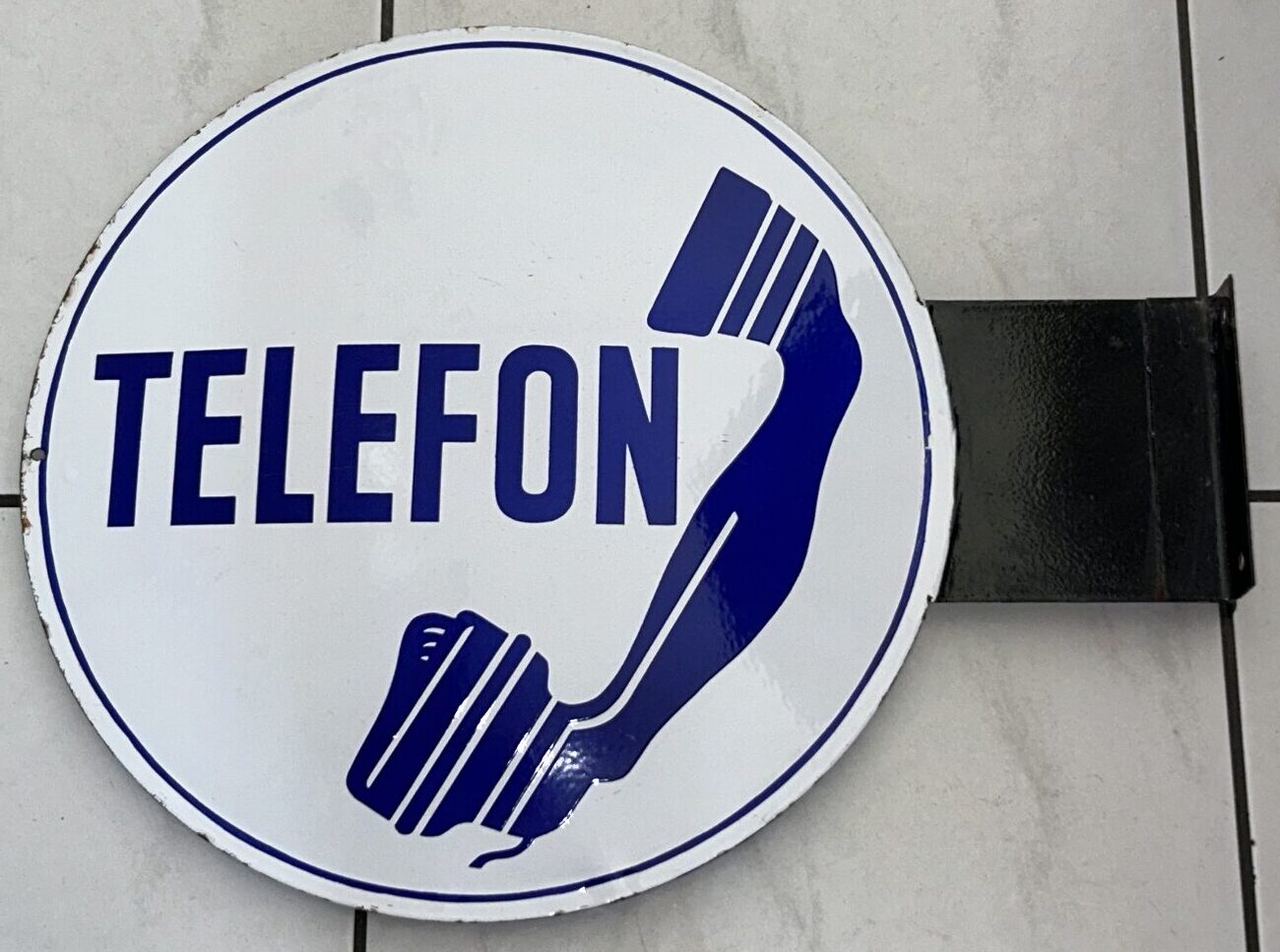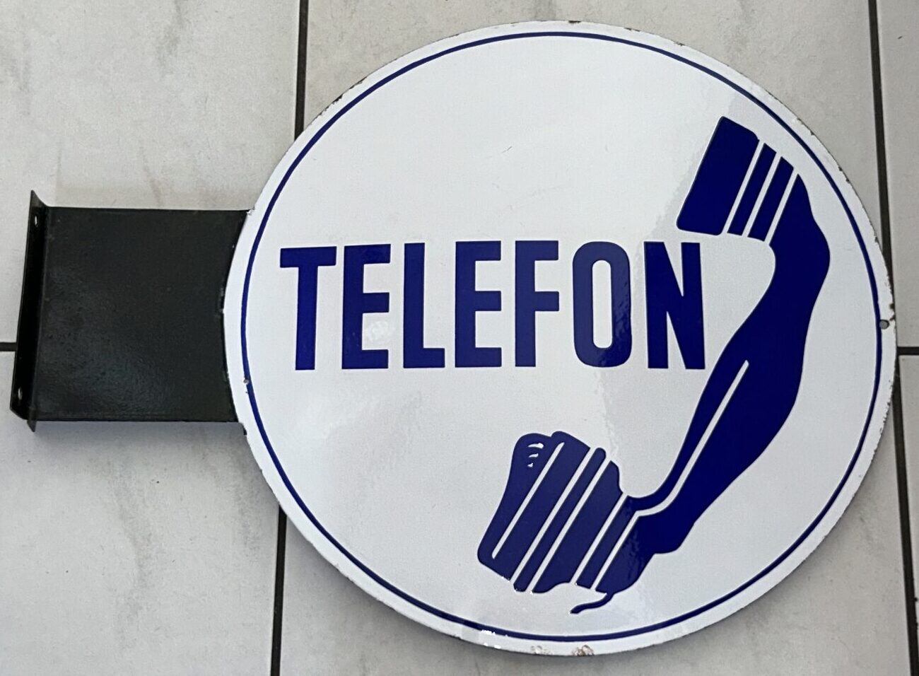 Originales TELEFON Flaggen-Emailschild ca. aus den 30er oder 40er Jahren, aus zwei gewölbten Emailschildern angefertigt, Zustand sehr gut, minime Oberflächenkratzer, minime Emailabplatzer im Randbereich, Breite: 57.5cm, Höhe: 45cm.