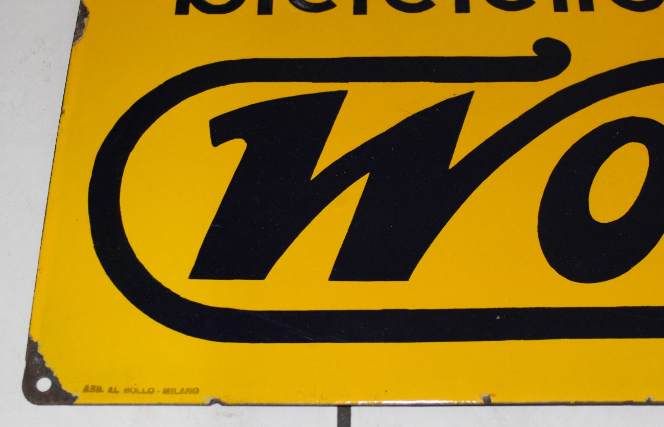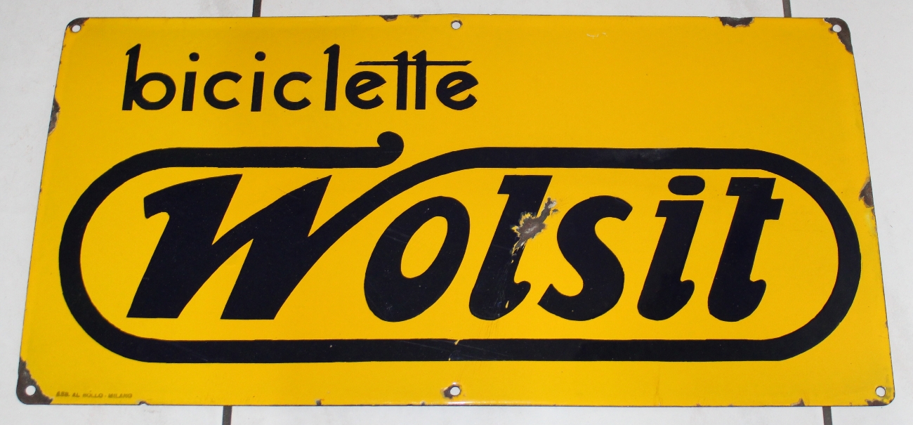 Originales Wolsit Biciclette Emailschild aus Italien, ca. aus den 40er oder 50er Jahren, Zustand gut, Emailabplatzer im „l“ und im Randbereich, gemarktet unten links: „ABB. AL BOLLO MILANO“, Breite: 60cm, Höhe: 30cm.